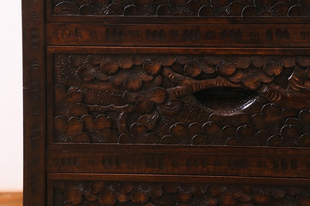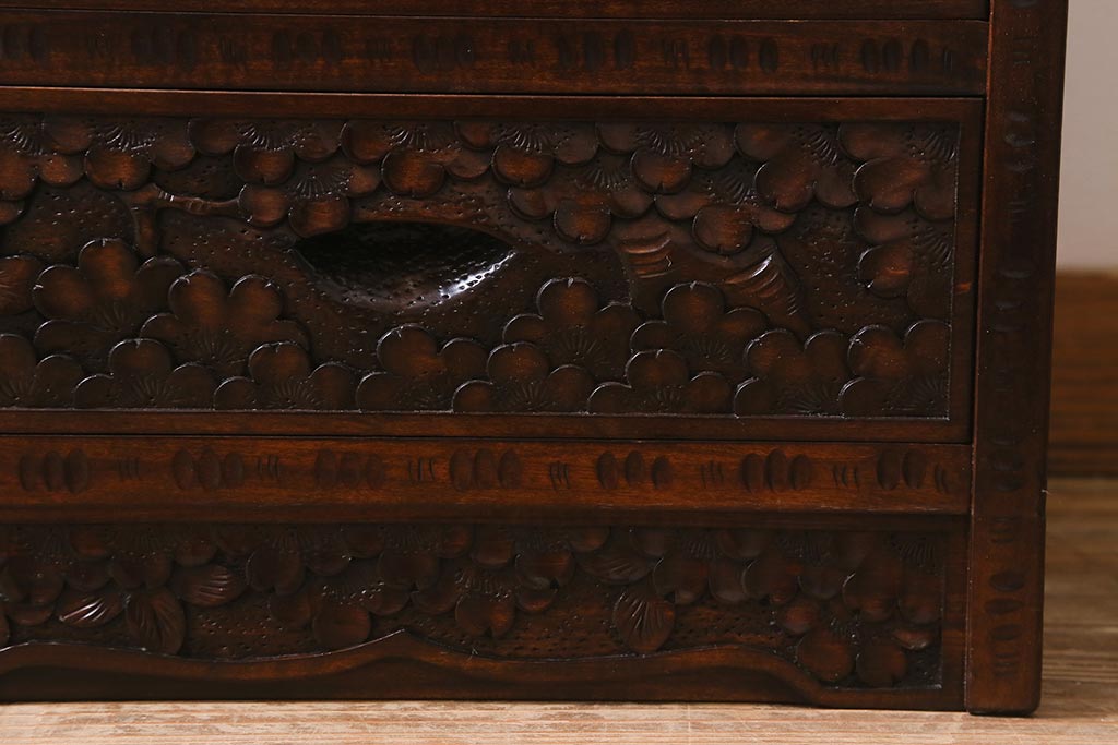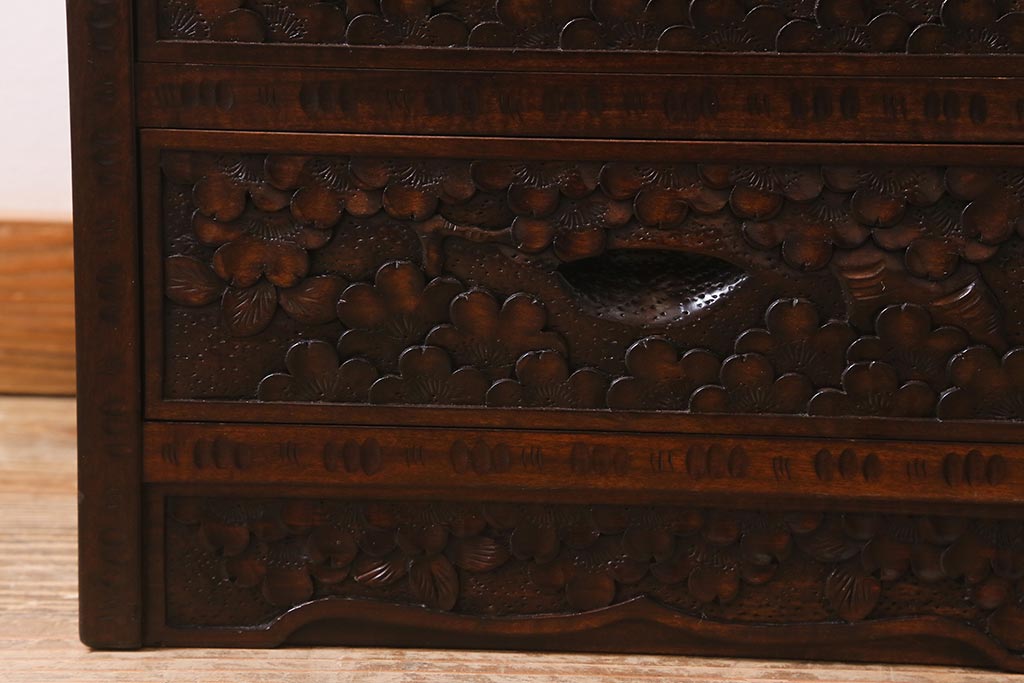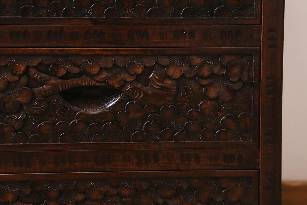 和箪笥 > 中古 伝統工芸 軽井沢彫り 満開に咲き誇る桜の彫りが華やかな小振りのチェスト(小物収納、小箪笥、引き出し)(R-041060)