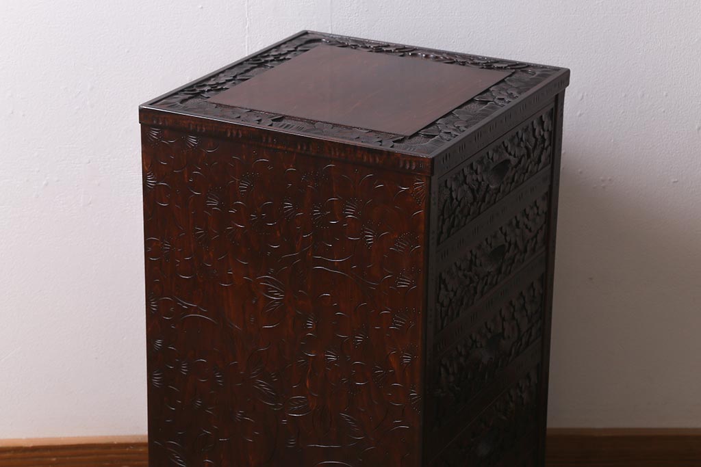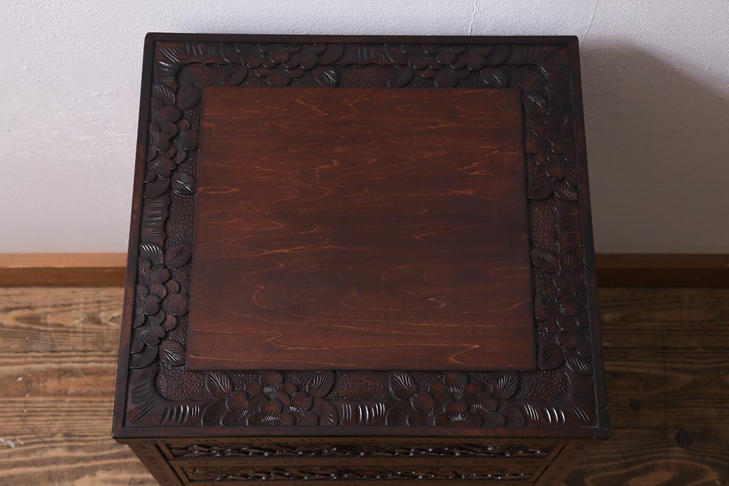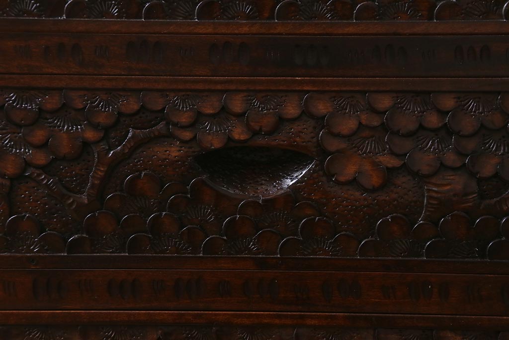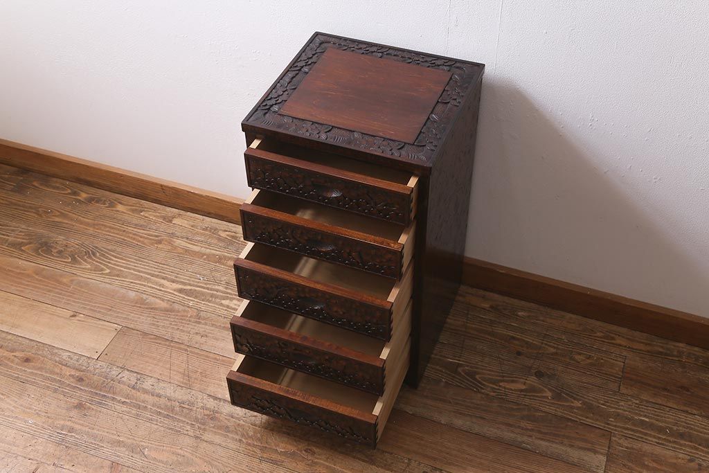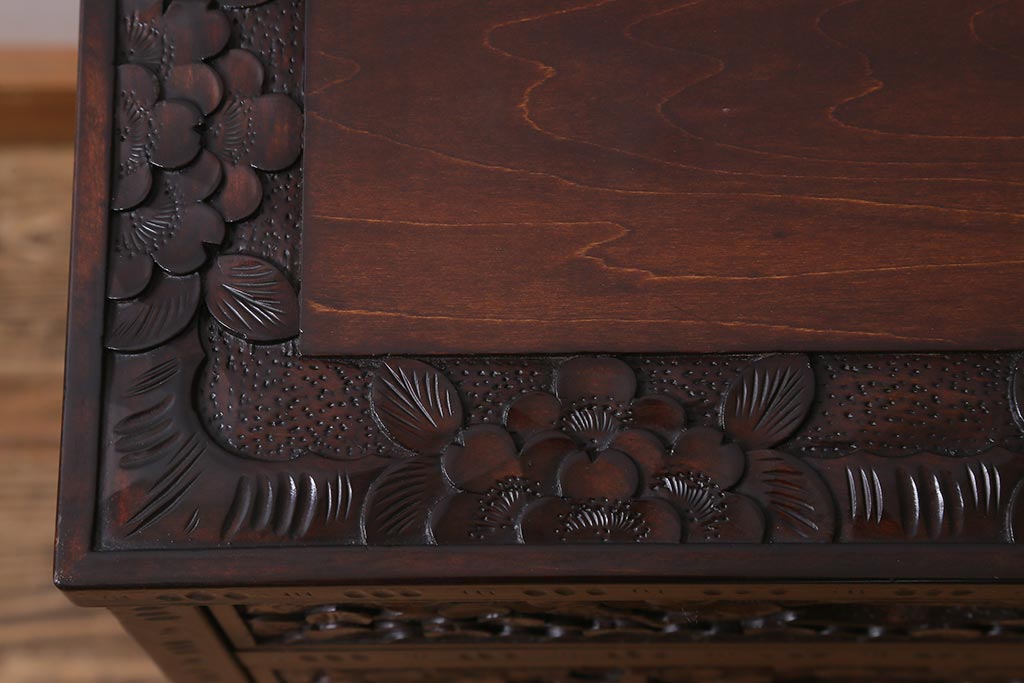 和箪笥 > 中古 伝統工芸 軽井沢彫り 満開に咲き誇る桜の彫りが華やかな小振りのチェスト(小物収納、小箪笥、引き出し)(R-041060)