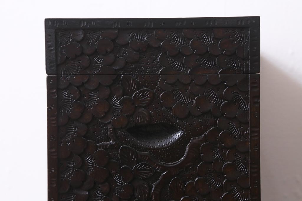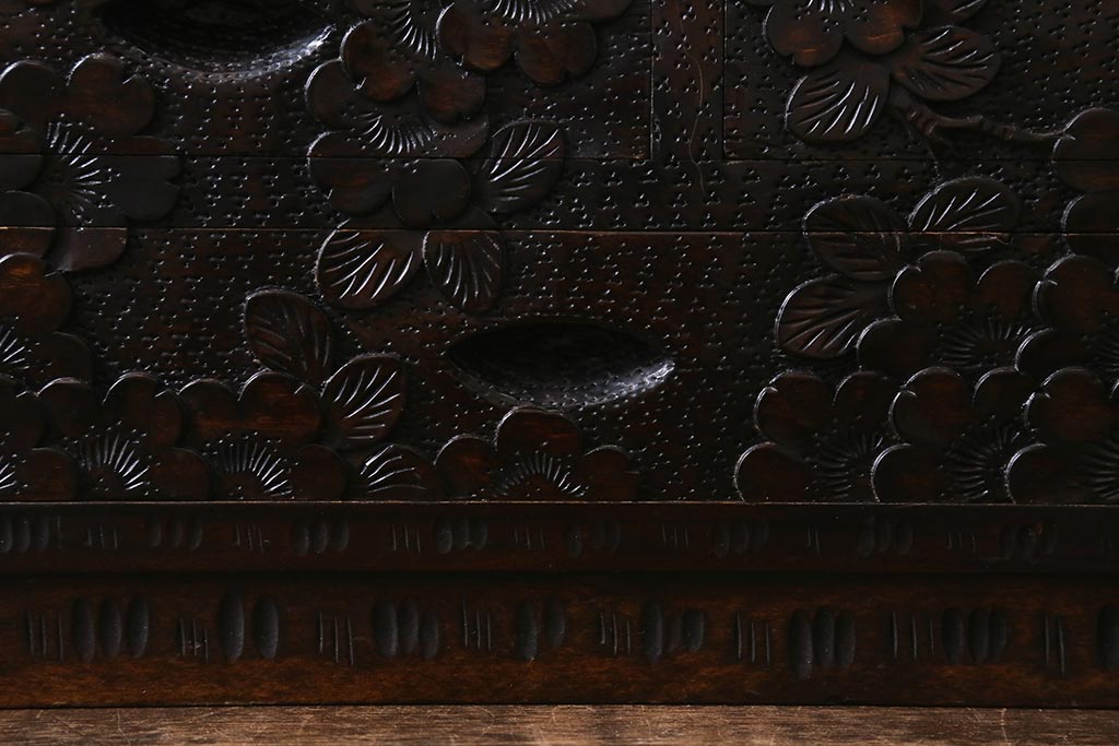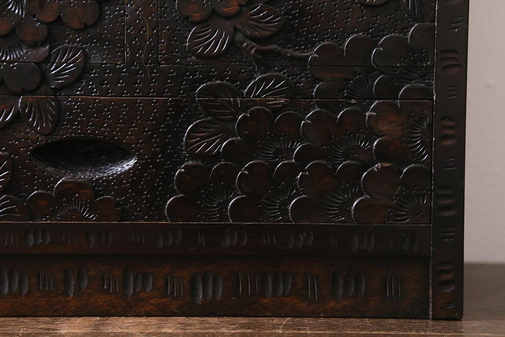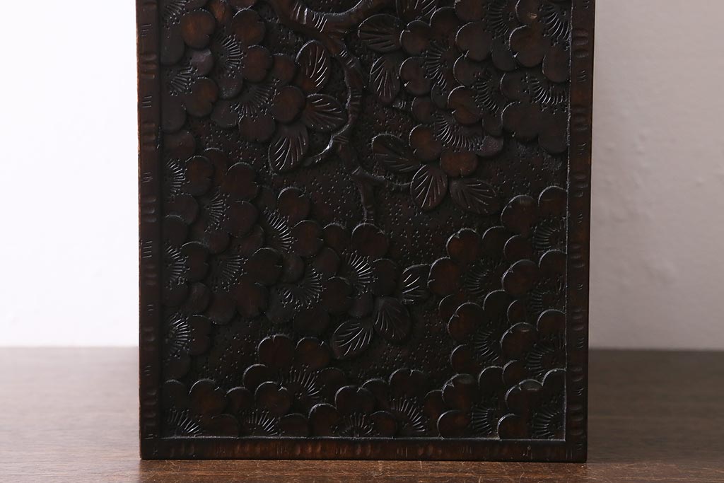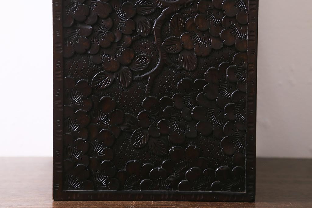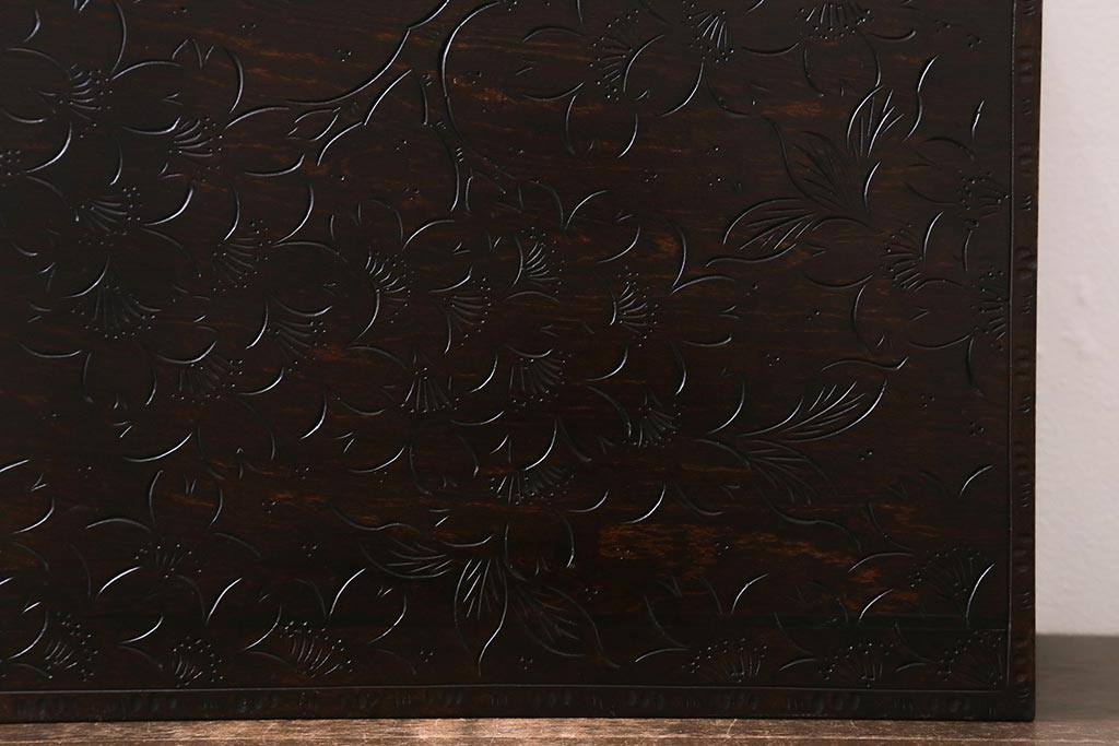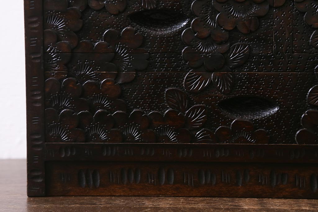 民芸家具 > 中古 伝統工芸 軽井沢彫り 満開に咲き誇る桜の彫りが華やかなトレー付き小引き出し(小物収納、引き出し)(R-041061)