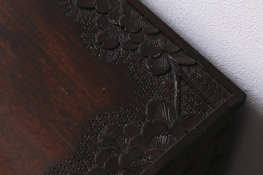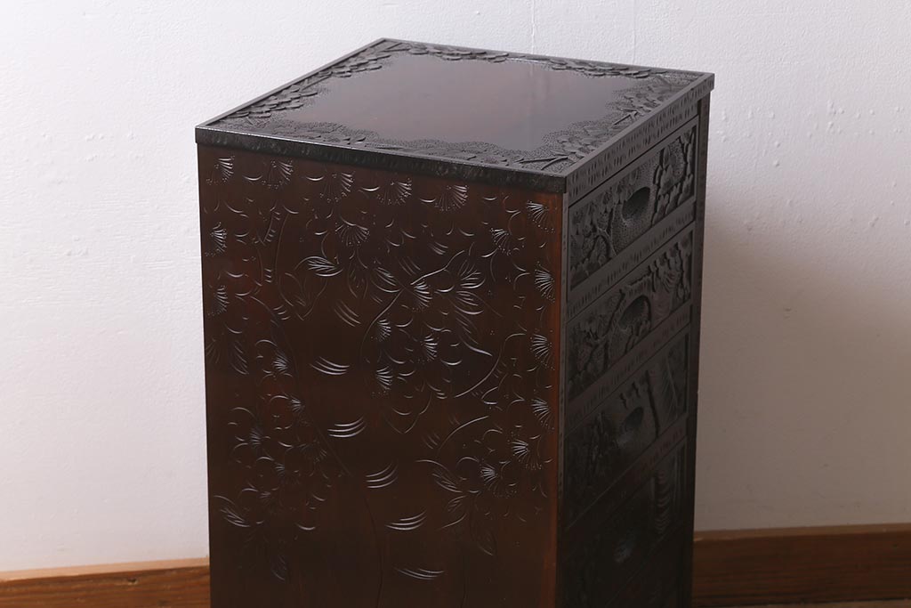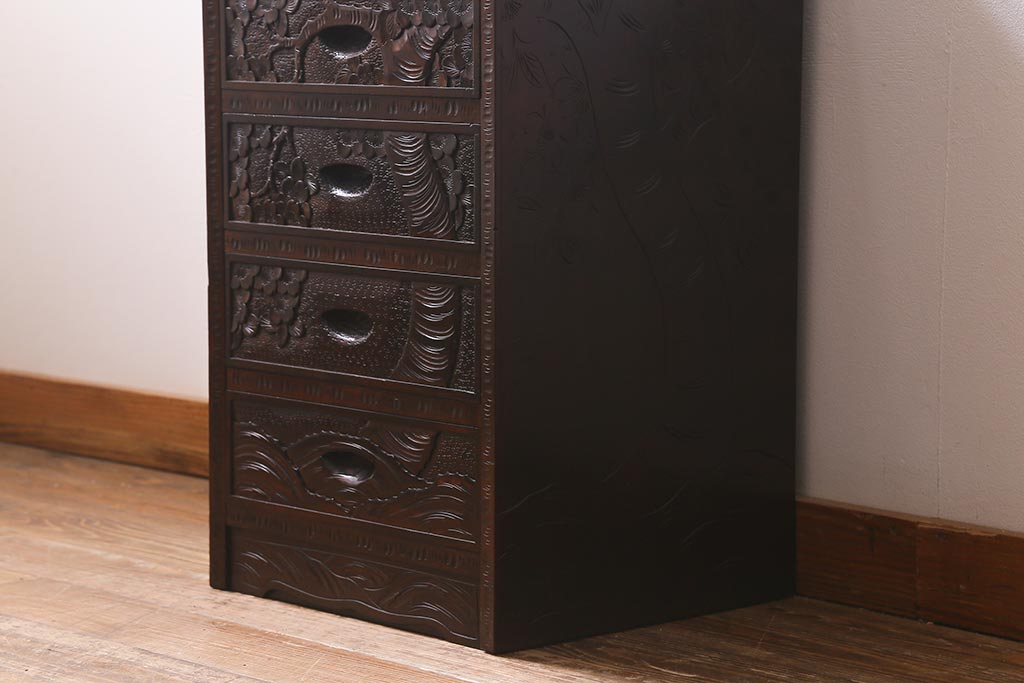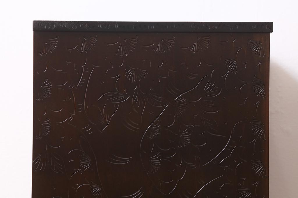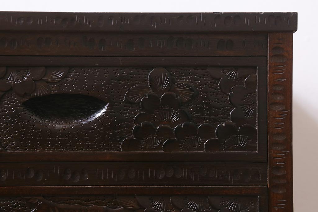 民芸家具 > 中古 伝統工芸 軽井沢彫り 桜の彫りが優美な小振りのチェスト(小物収納、小箪笥、引き出し)(R-041059)