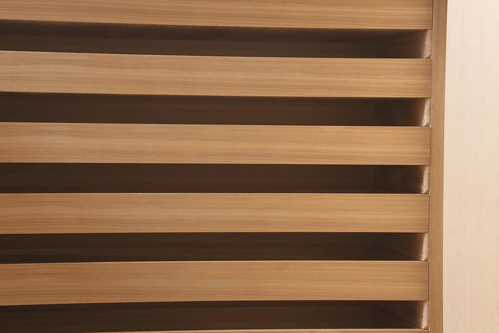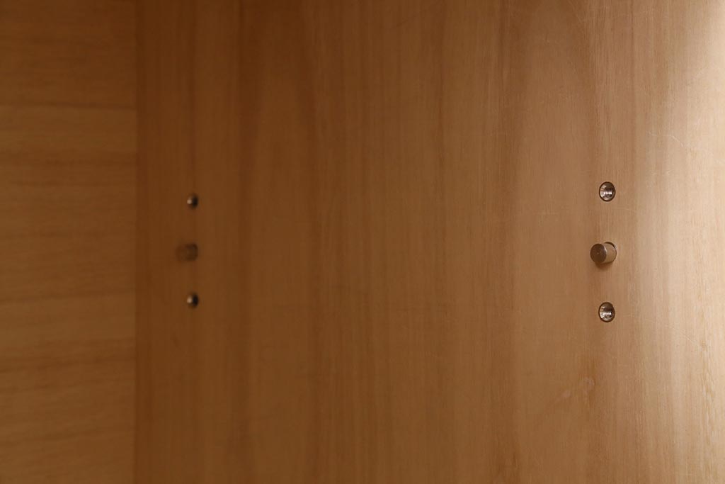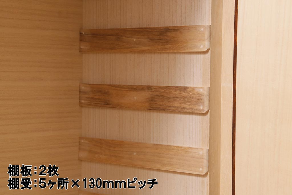 棚板は取り外しできます。棚板は左右各2枚あります。左のみ棚受けは5ヶ所、130mmピッチで調整できます。棚幅サイズのものが1枚の作りです。