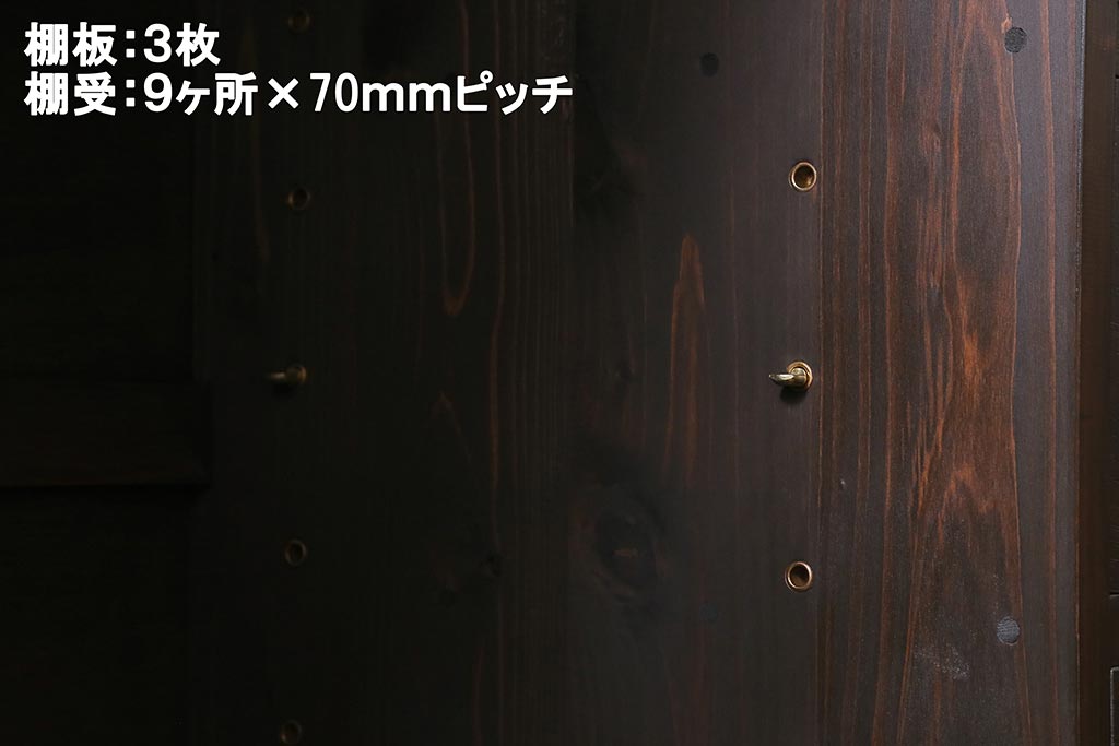 棚板は取り外しできます。棚板は3枚あります。棚受けは9ヶ所、70mmピッチで調整できます。棚幅サイズのものが1枚の作りです。
