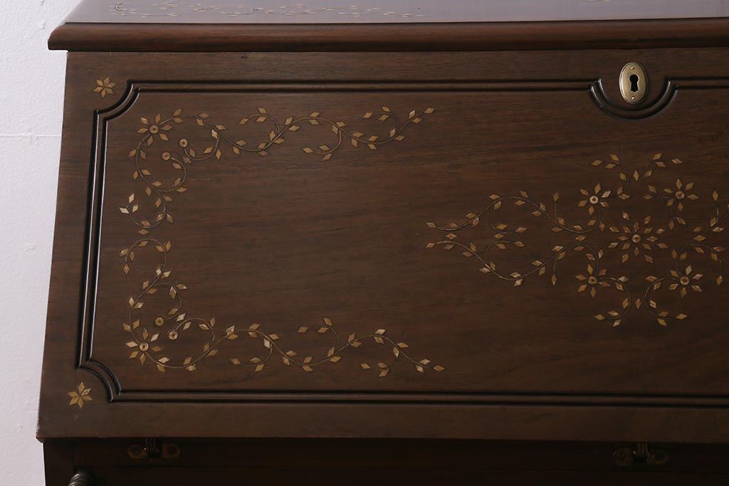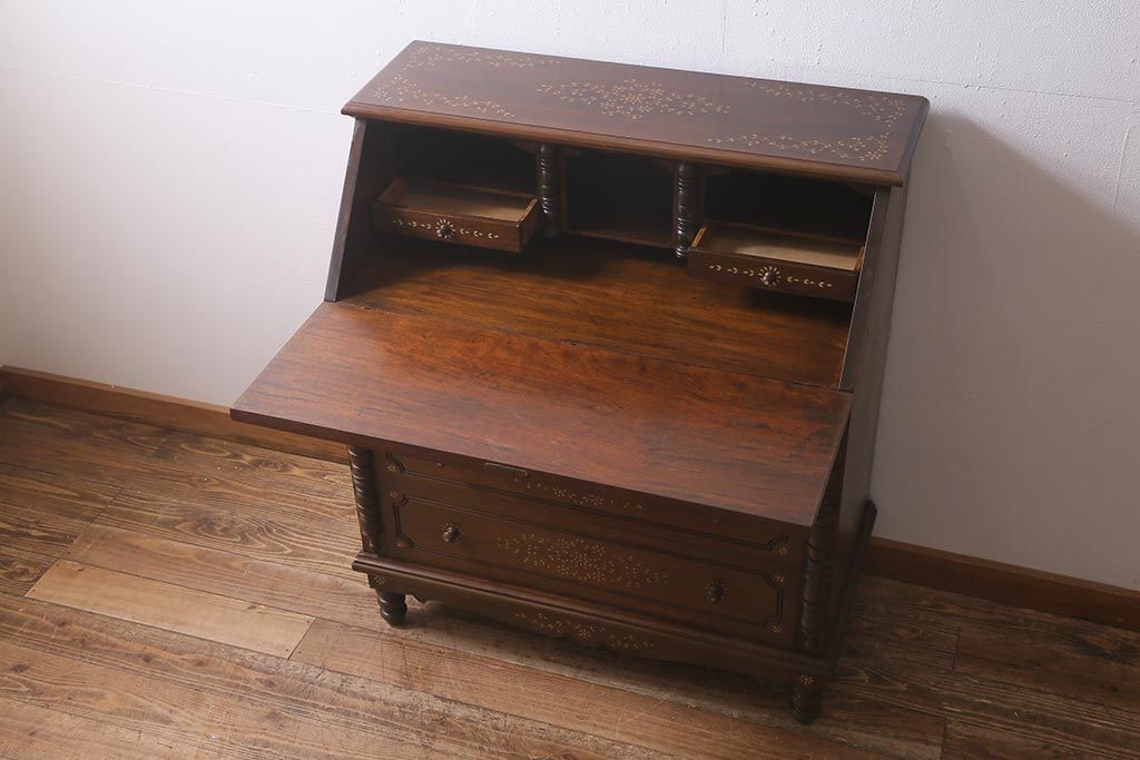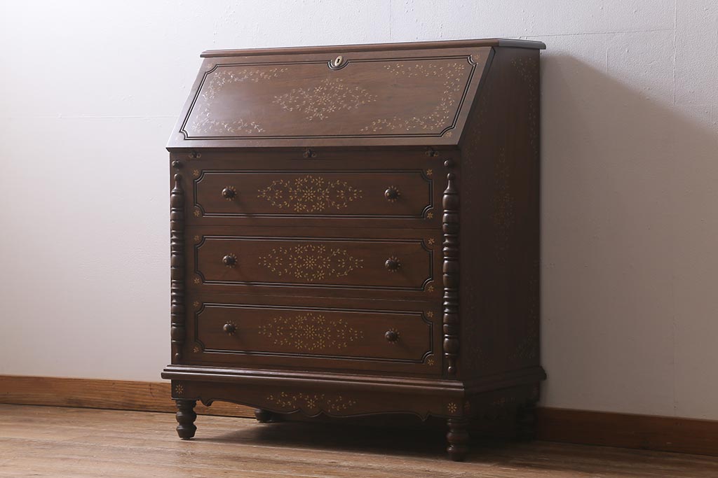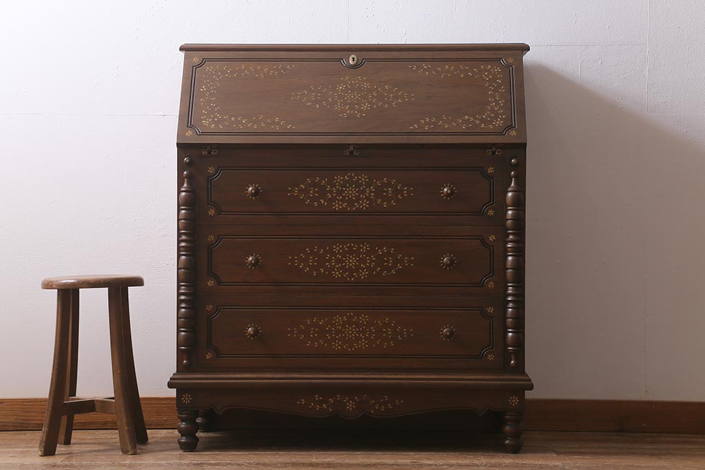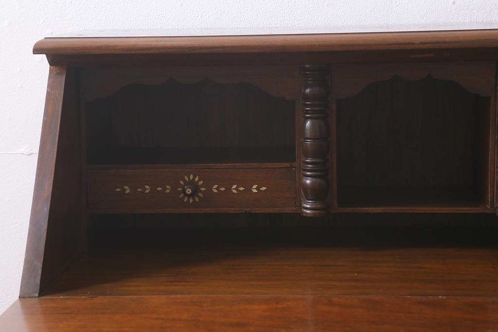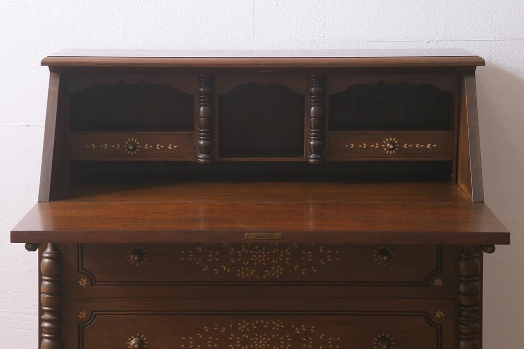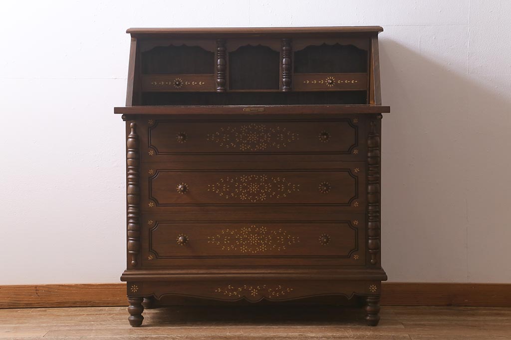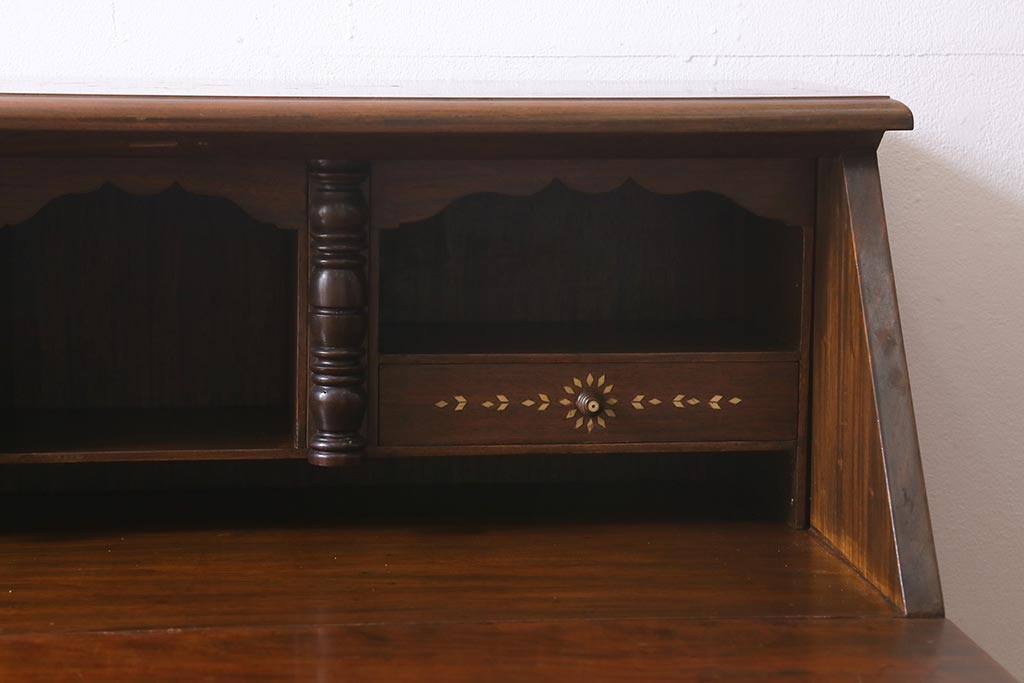 ヴィンテージ家具 ヨーロッパビンテージ 輸入家具 象嵌と挽き物細工が目を引くライティングビューロー(簿記机、在宅ワーク、在宅用ワークデスク、机、在宅ワーク、在宅用引き出し)(R-041133)