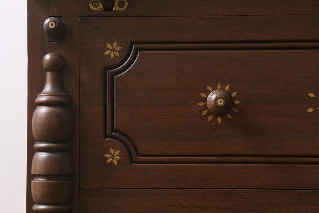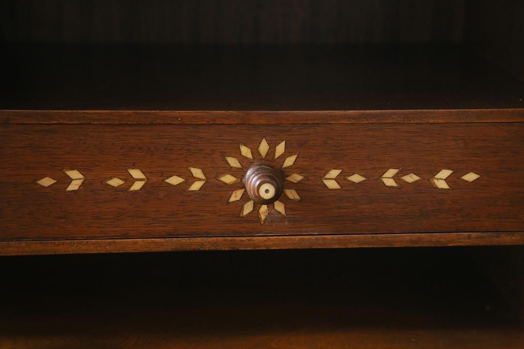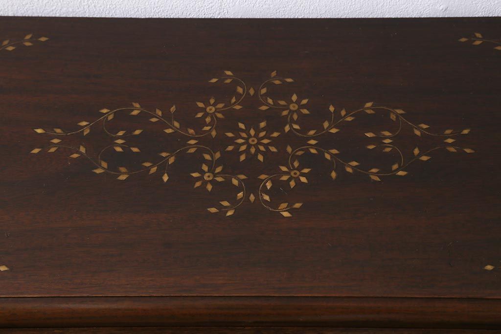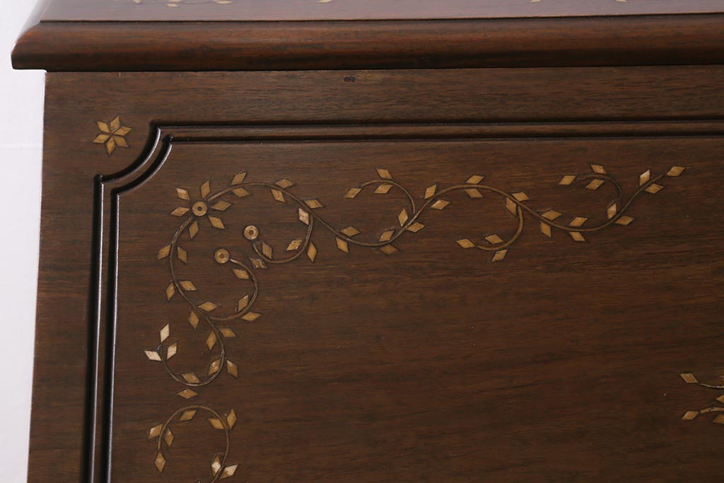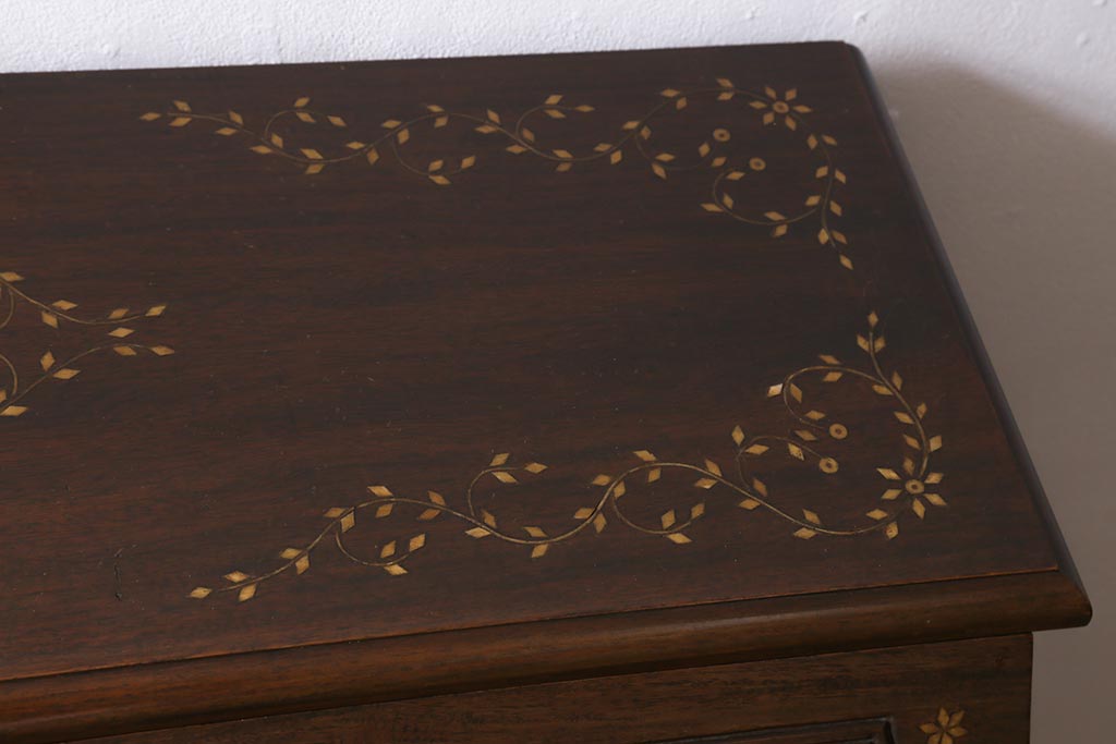 ラフジュ工房> デスク> ライティングビューロー・簿記机 > ヴィンテージ家具 ヨーロッパビンテージ 輸入家具 象嵌と挽き物細工が目を引くライティングビューロー(簿記机、在宅ワーク、在宅用ワークデスク、机、在宅ワーク、在宅用引き出し)(R-041133)