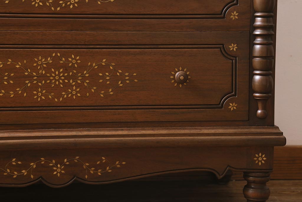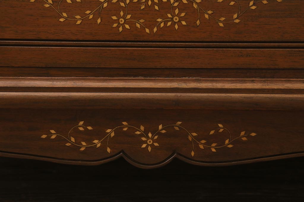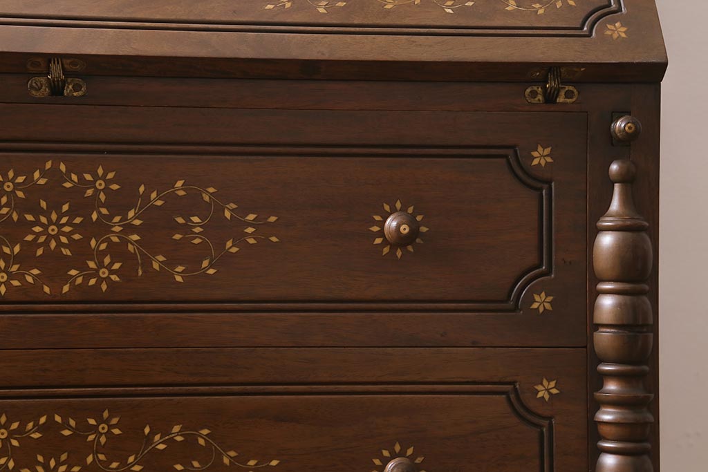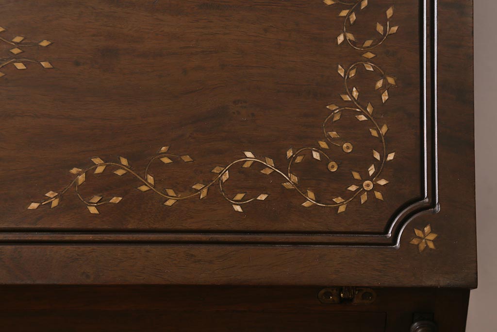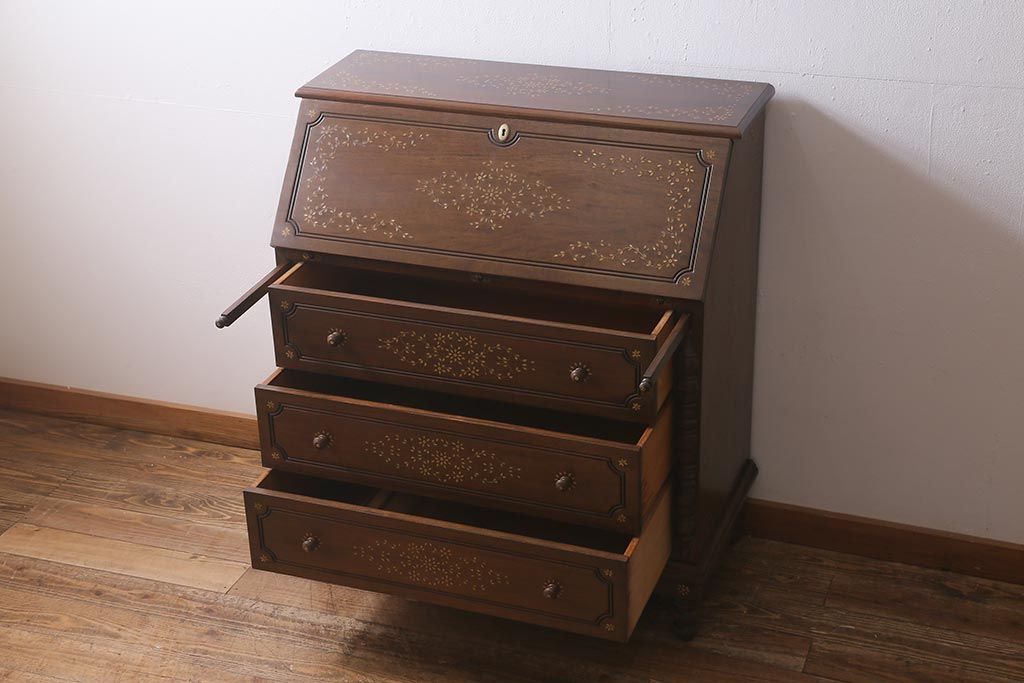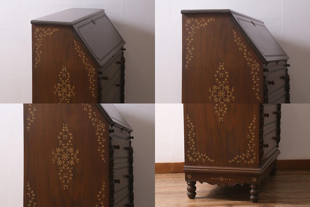 ラフジュ工房> デスク> ワークデスク > ヴィンテージ家具 ヨーロッパビンテージ 輸入家具 象嵌と挽き物細工が目を引くライティングビューロー(簿記机、在宅ワーク、在宅用ワークデスク、机、在宅ワーク、在宅用引き出し)(R-041133)