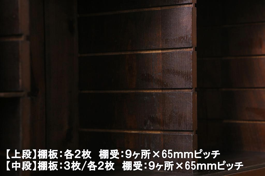 棚板は取り外しできます。棚板は上が各2枚、中央左が3枚、中央右・中が各2枚あります。棚受けは各9ヶ所、各65mmピッチで調整できます。棚幅サイズのものが1枚の作りです。