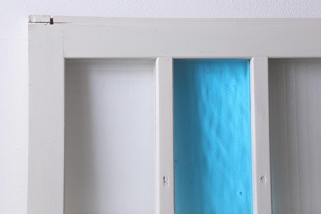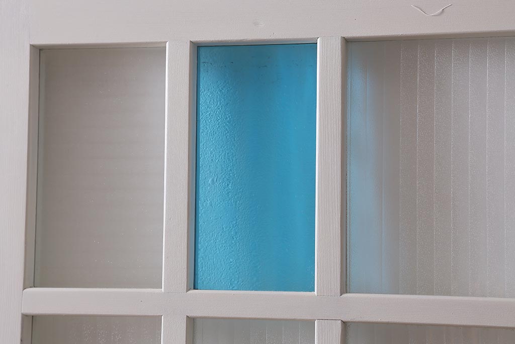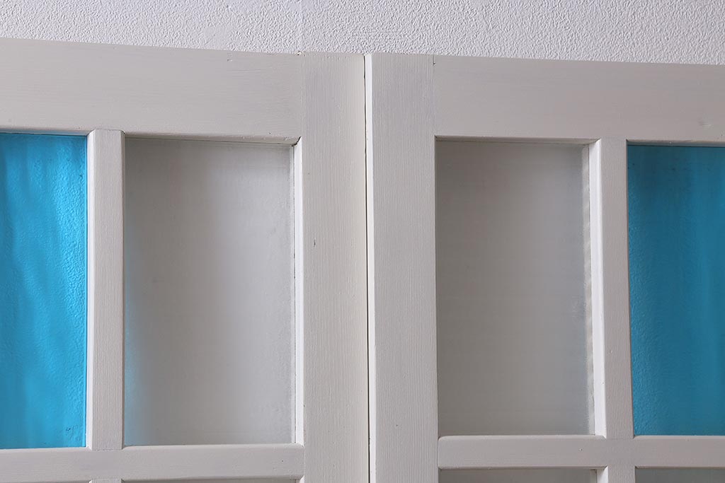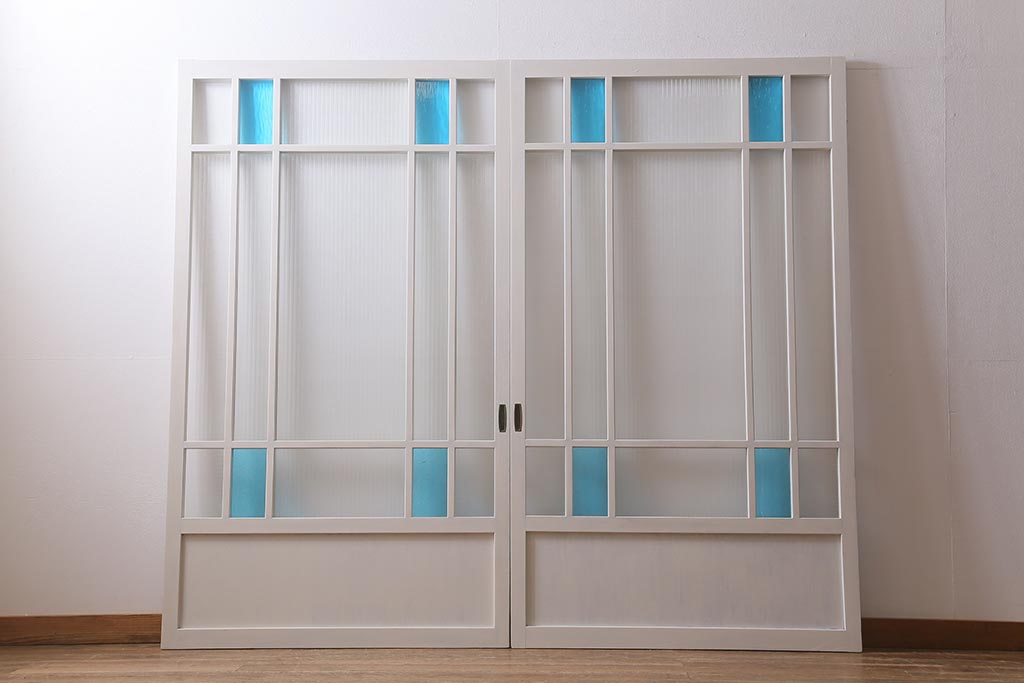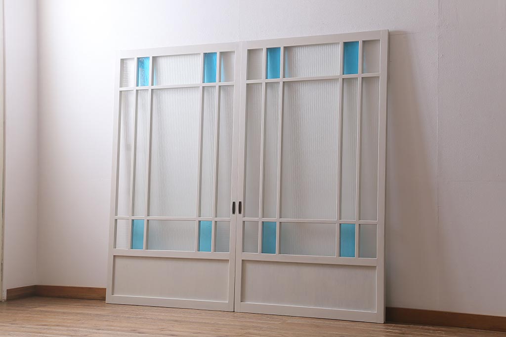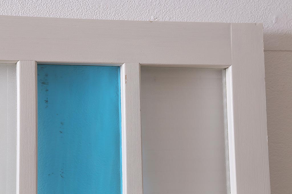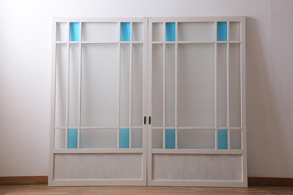 ドア・建具> 引き戸 > アンティーク建具 昭和中期 ペイント 色ガラス・銀モールガラス 爽やかなカラーが目を引くガラス戸2枚セット(引き戸、建具)(R-041320)
