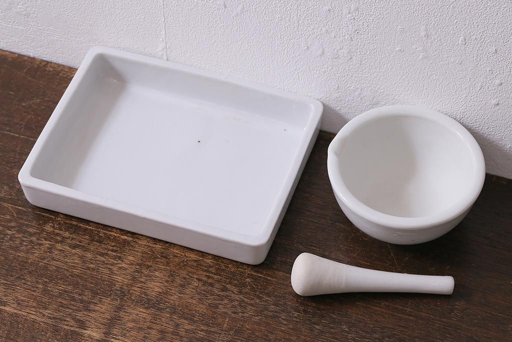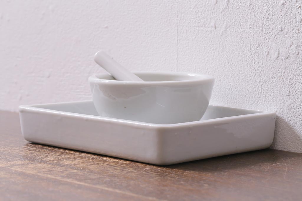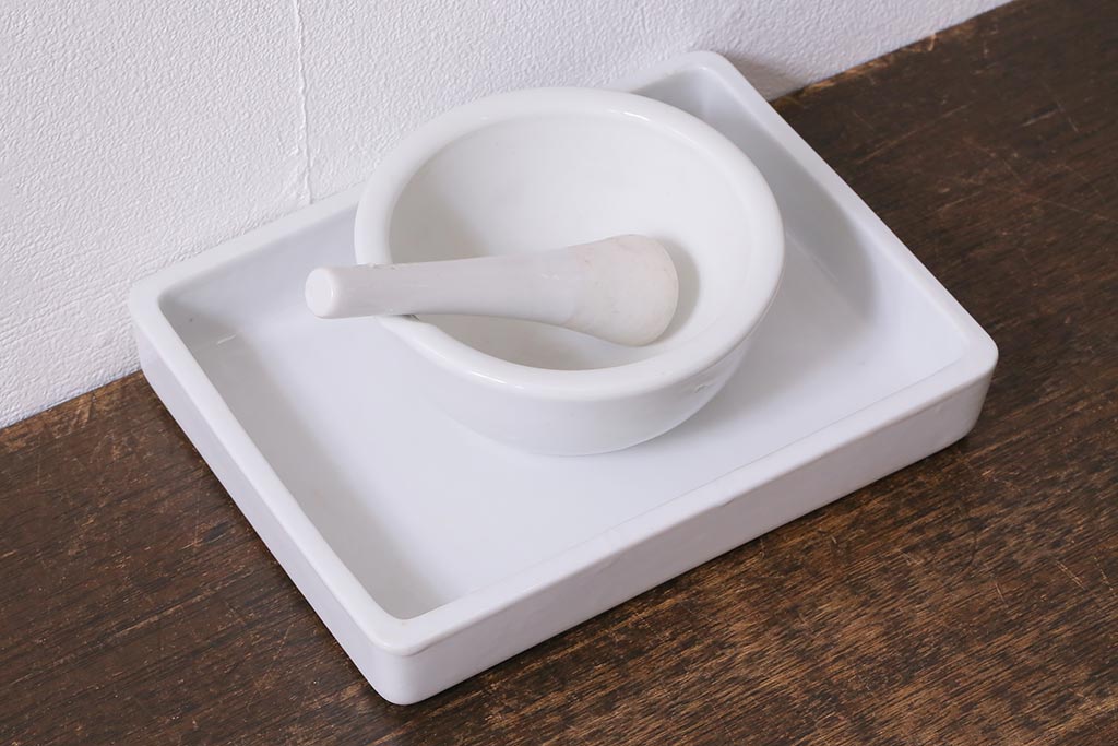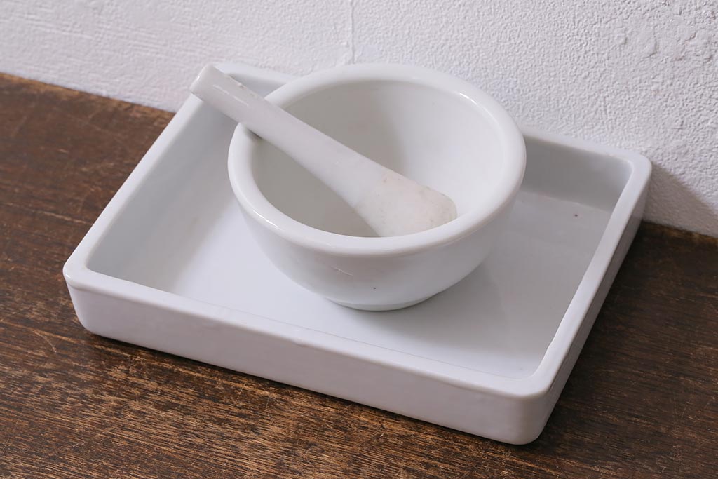 アンティーク雑貨 昭和初期 角皿付きの古い乳鉢(乳棒付き)(R-040849)