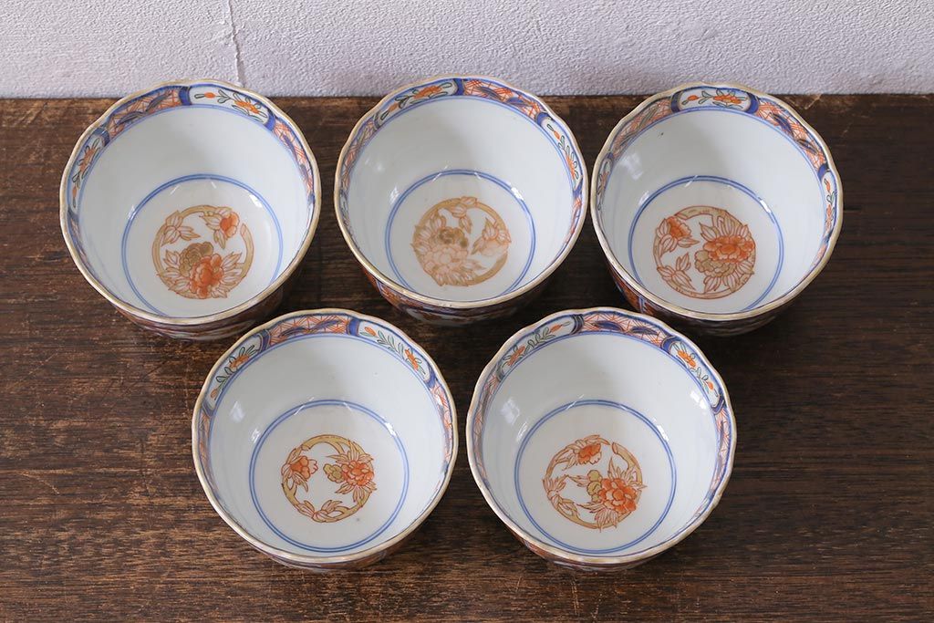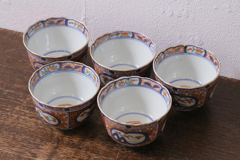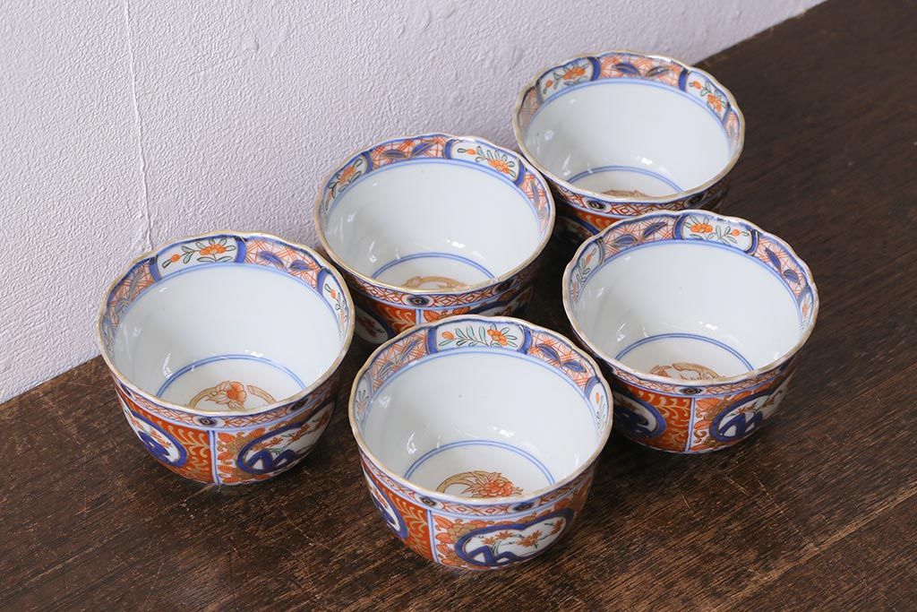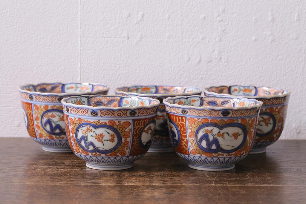 アンティーク雑貨 幕末明治期 伊万里 色絵 奇玉宝鼎之珍 蕎麦猪口5客セット(湯呑、向付、和食器)(R-040850)
