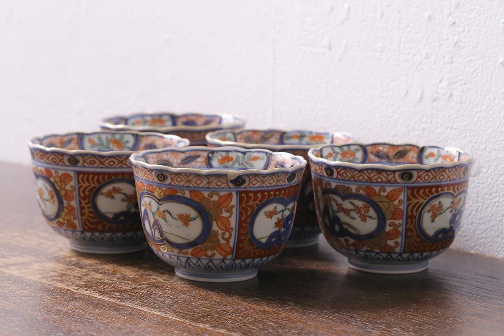 ラフジュ工房> 和食器・茶道具> 急須・湯吞み > アンティーク雑貨 幕末明治期 伊万里 色絵 奇玉宝鼎之珍 蕎麦猪口5客セット(湯呑、向付、和食器)(R-040850)