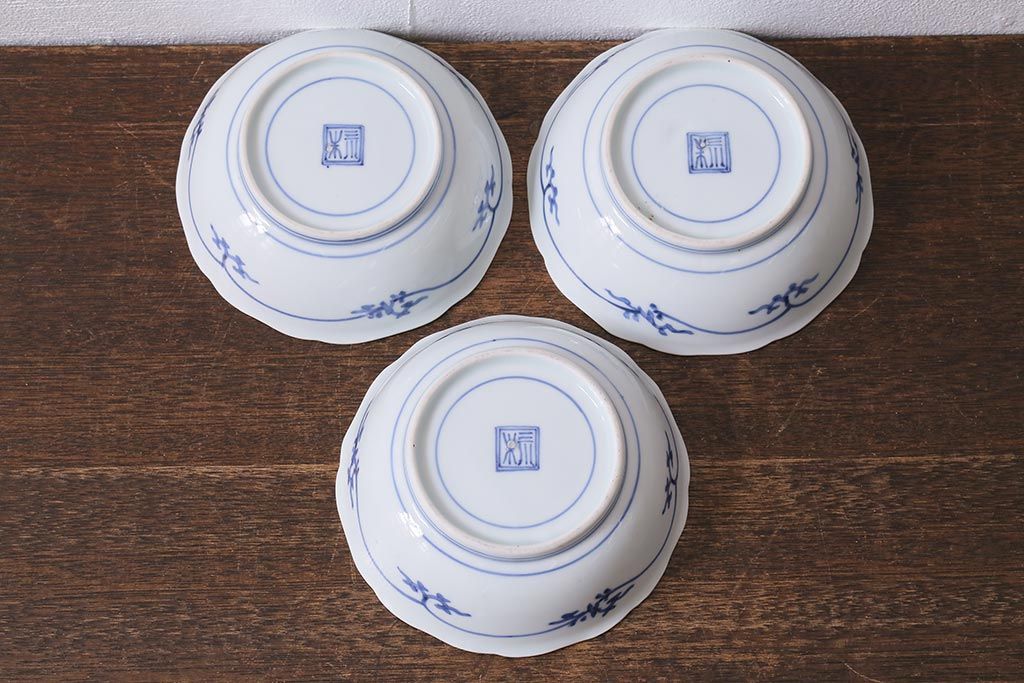 アンティーク雑貨 江戸期 古伊万里 染付 扇面図 なます皿3枚セット(深皿)(R-041120)