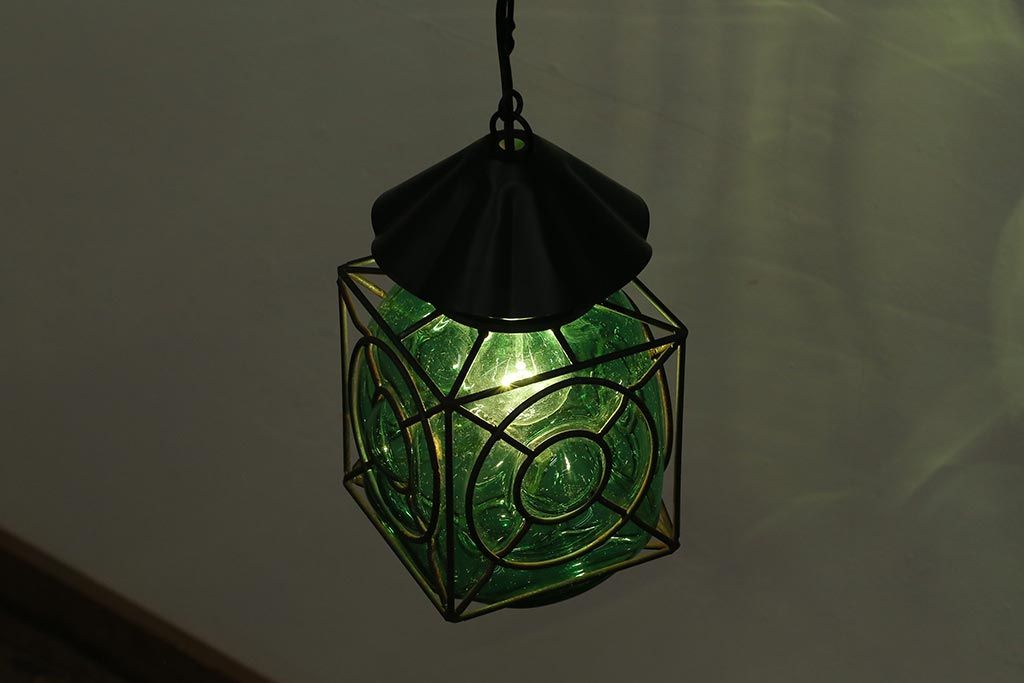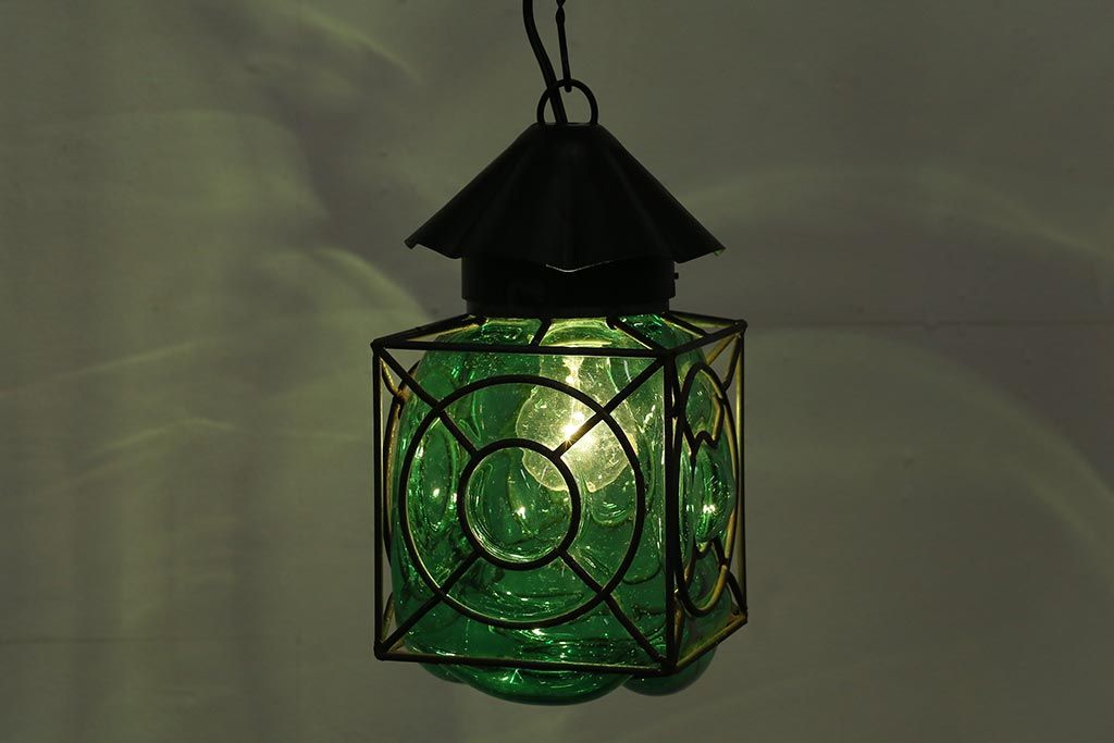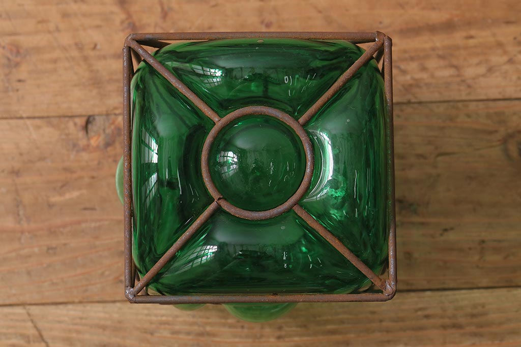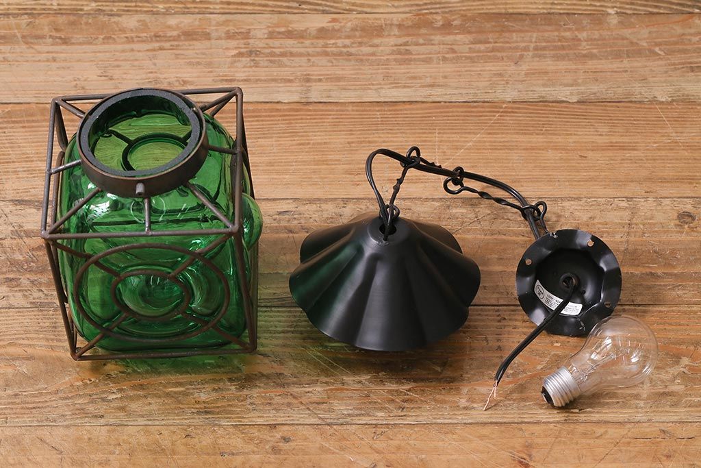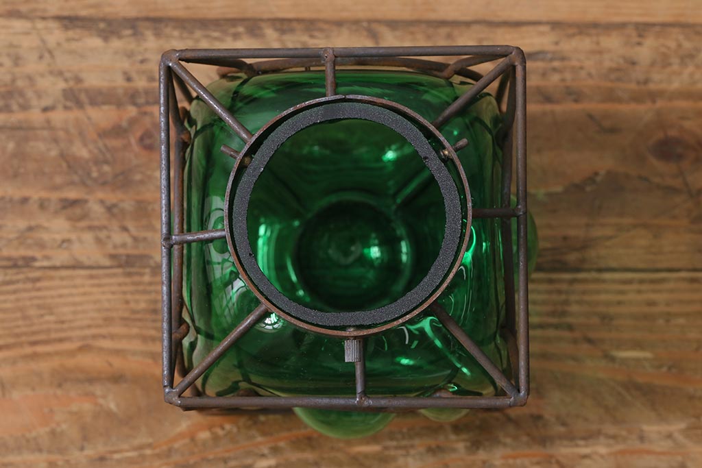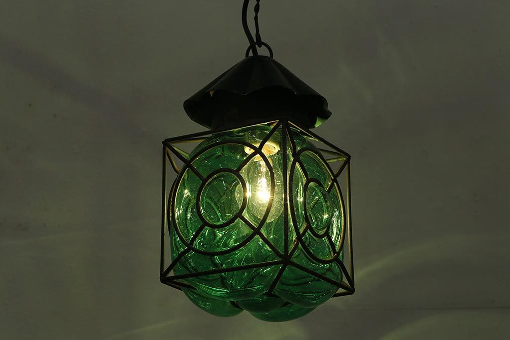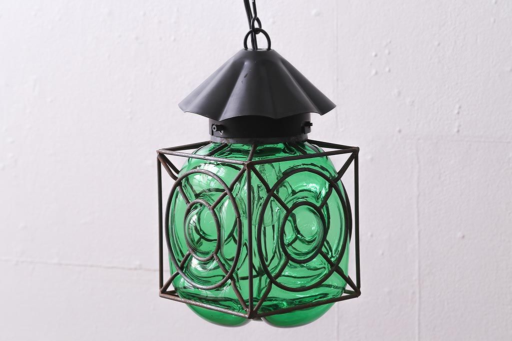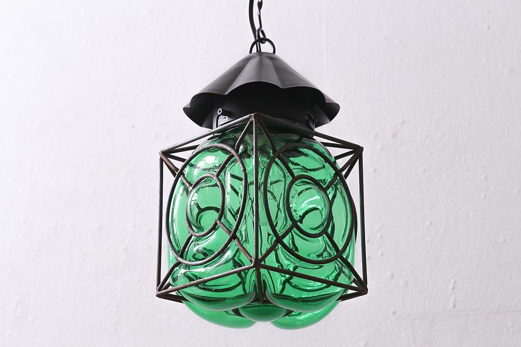 海外ヴィンテージ アイアンフレーム 吹きガラス グリーンの色ガラスがおしゃれなペンダントライト(ビンテージ)(R-041466)