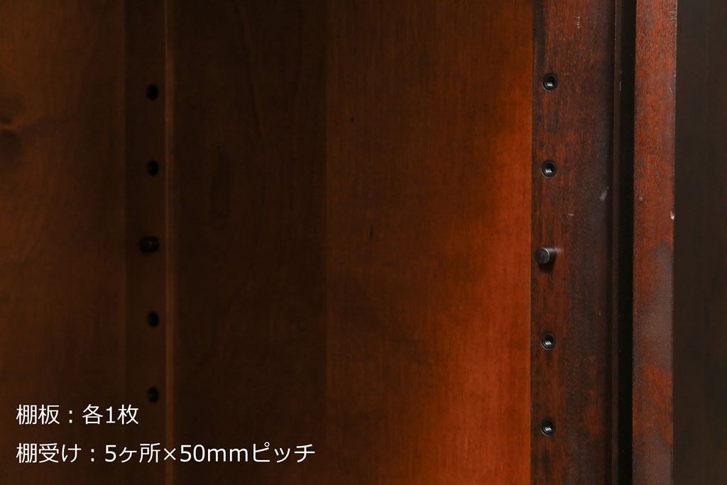 棚板は取り外しできます。棚板は左右各1枚あります。棚受けは5ヶ所、50mmピッチで調整できます。棚幅サイズのものが1枚の作りです。