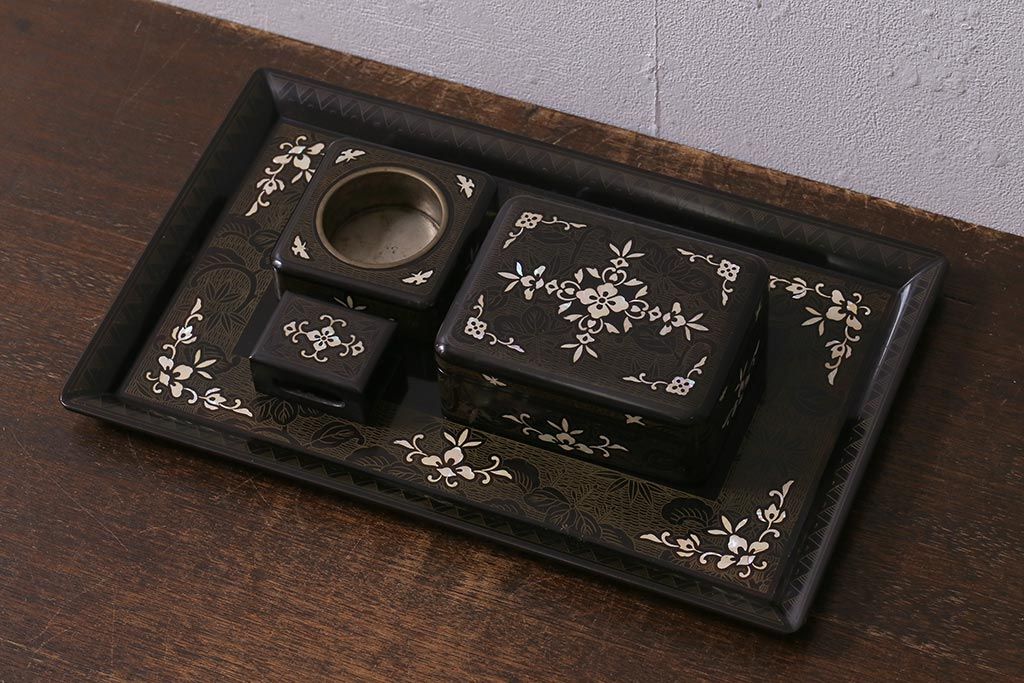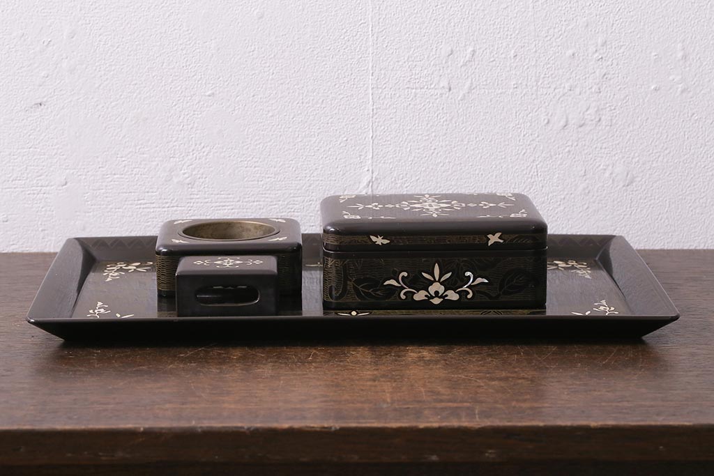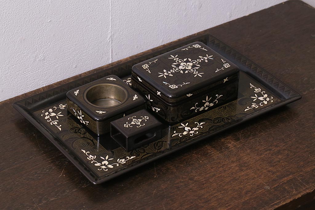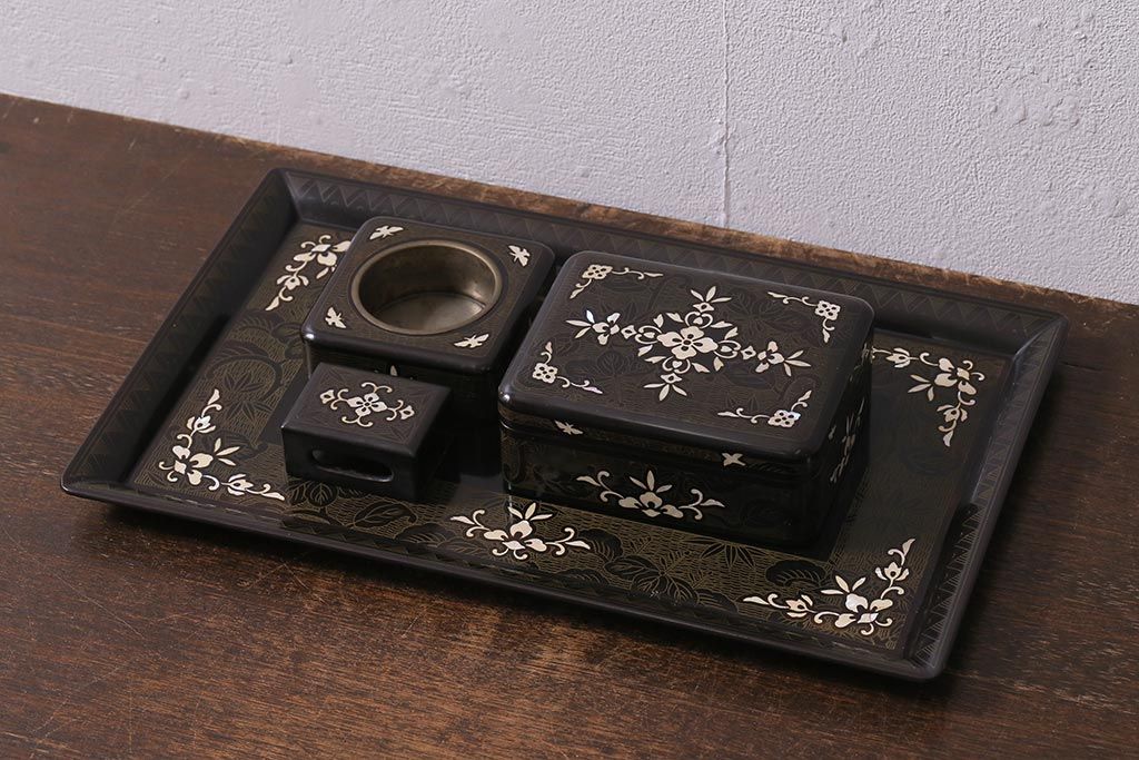 アンティーク雑貨 骨董 古美術 螺鈿細工 たばこ盆セット(煙草盆、灰皿、ケース、トレー)(R-041335)