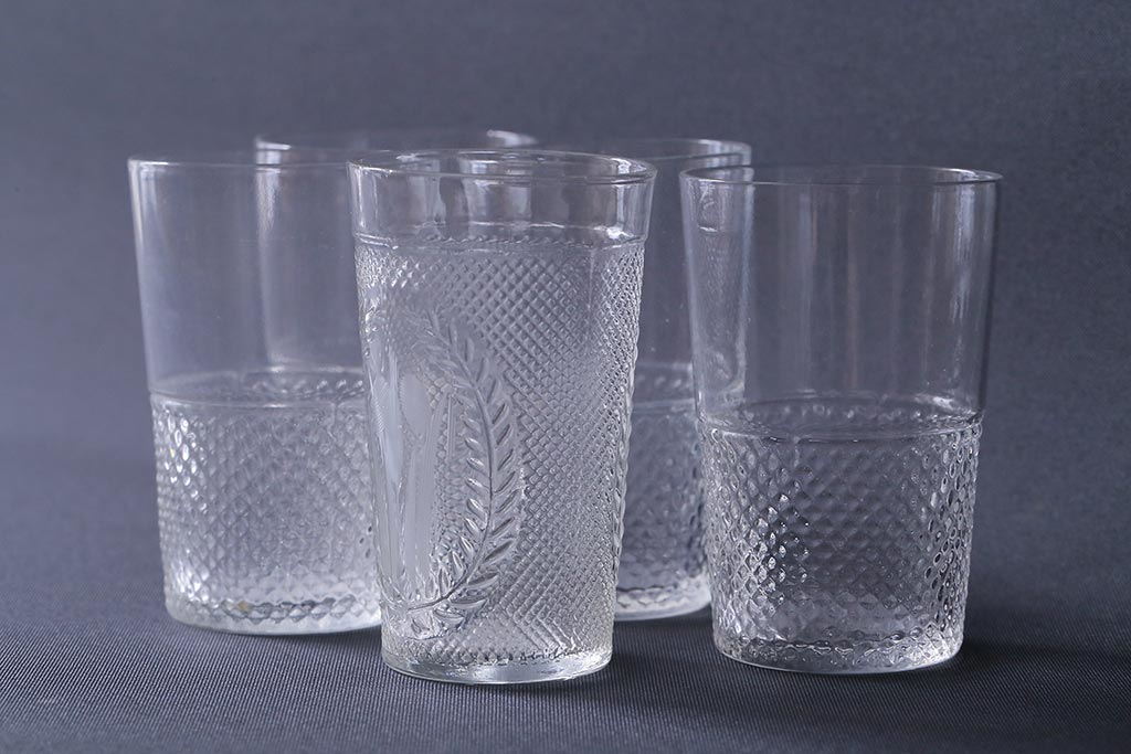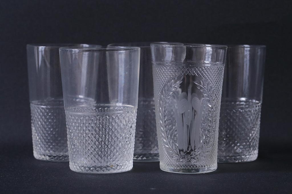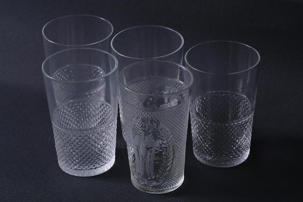 ラフジュ工房> 和食器・茶道具 > アンティーク雑貨 レトロ プレスガラス 菖蒲(アヤメ)他 グラス5個セット(コップ、和ガラス)(R-041139)