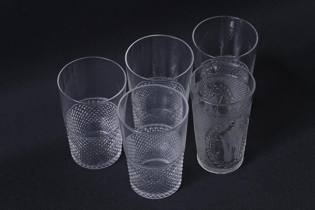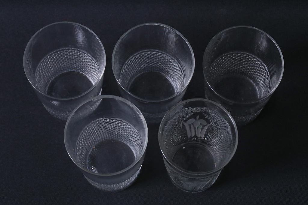 アンティーク雑貨 レトロ プレスガラス 菖蒲(アヤメ)他 グラス5個セット(コップ、和ガラス)(R-041139)