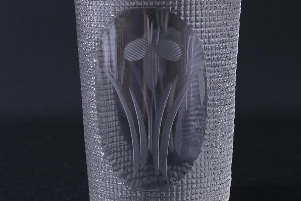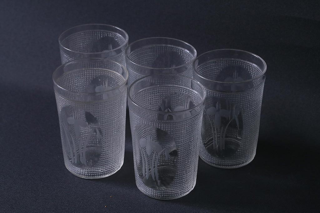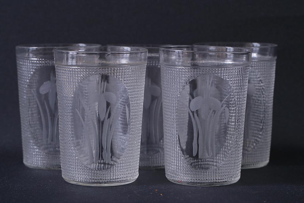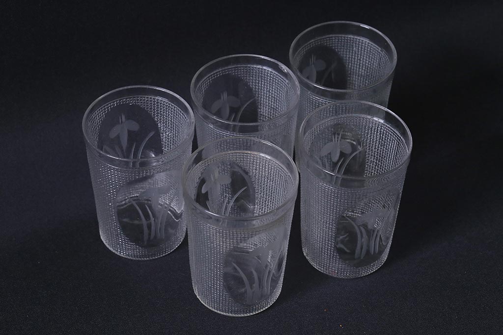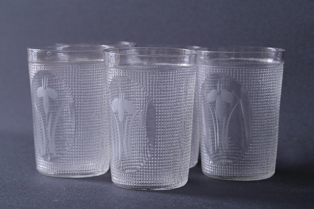アンティーク雑貨 レトロ プレスガラス 菖蒲(アヤメ) グラス5個セット(コップ、和ガラス)(R-041140)