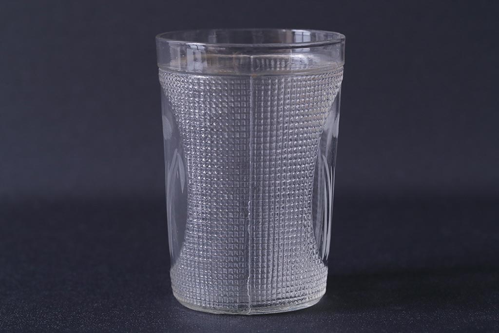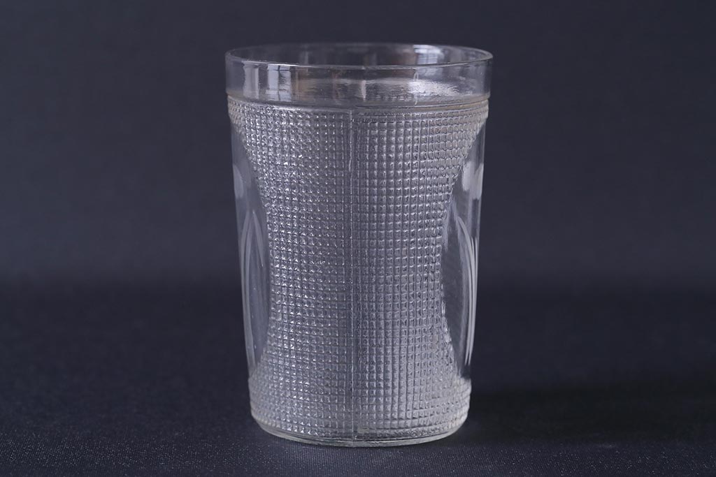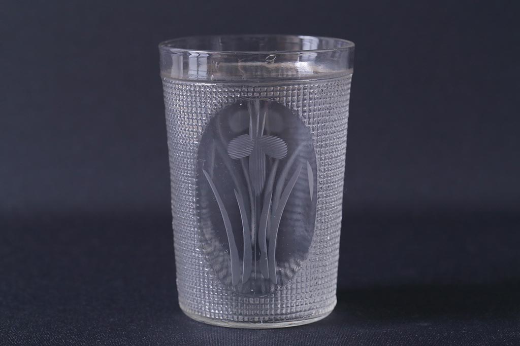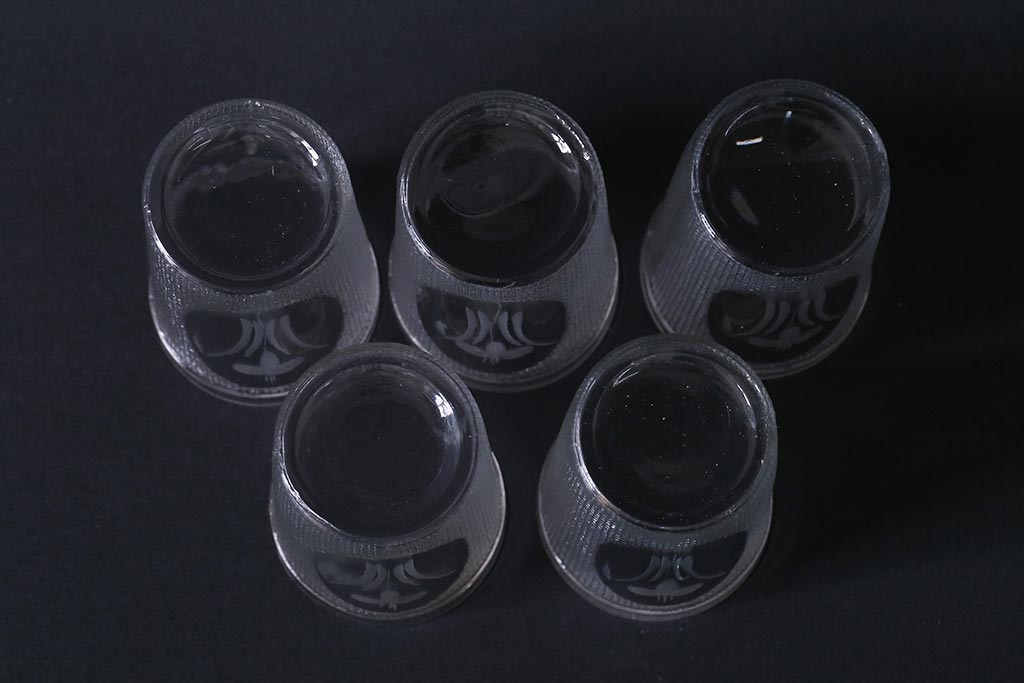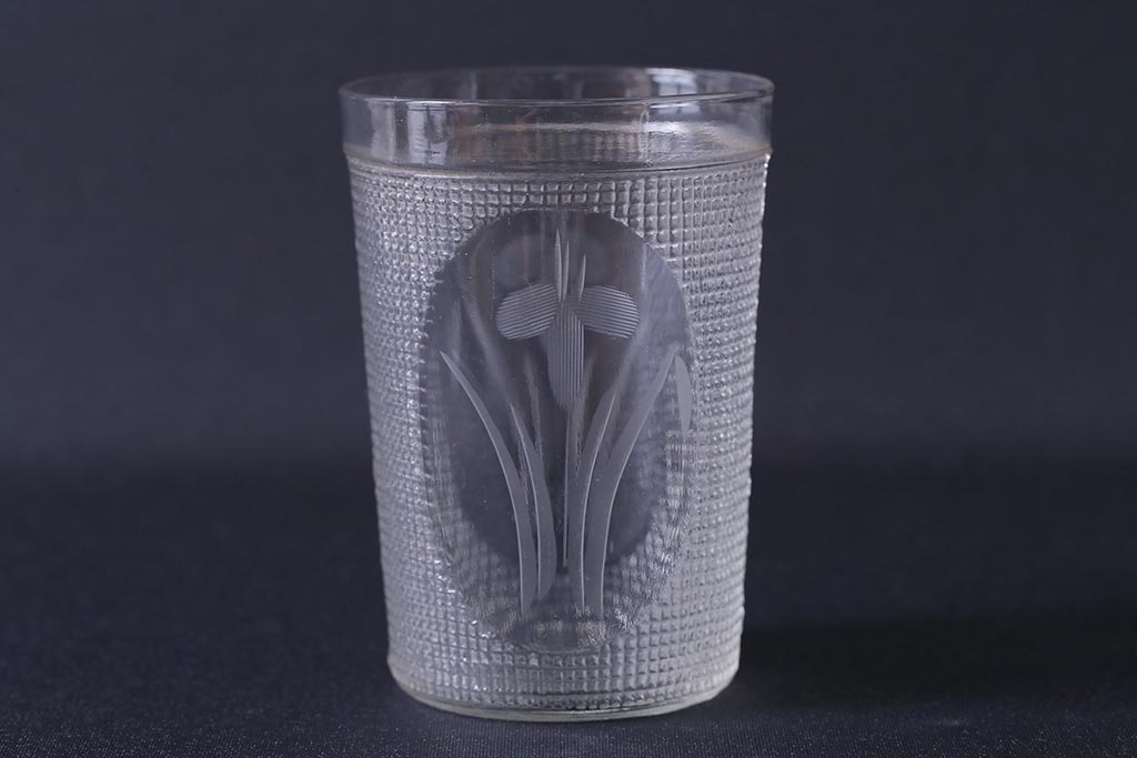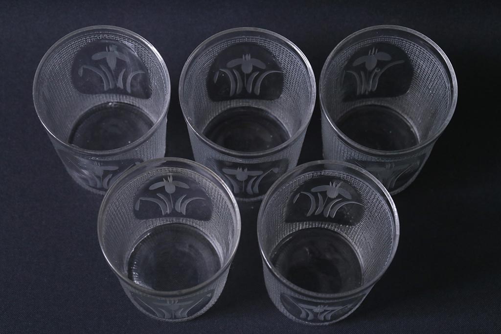 ラフジュ工房> 骨董・美術品> 骨董-ガラス食器 > アンティーク雑貨 レトロ プレスガラス 菖蒲(アヤメ) グラス5個セット(コップ、和ガラス)(R-041140)