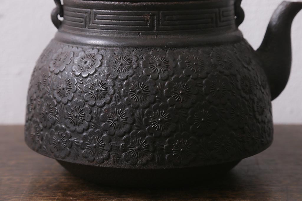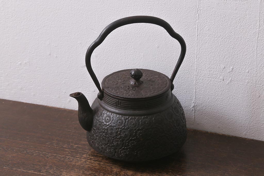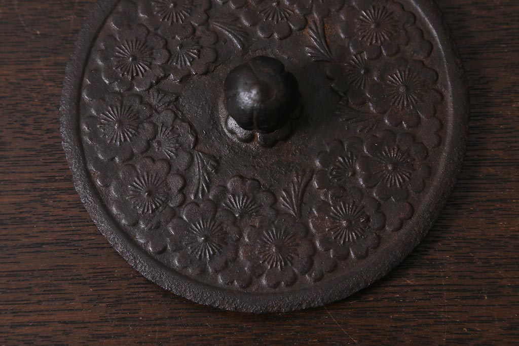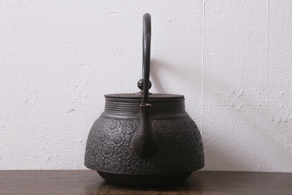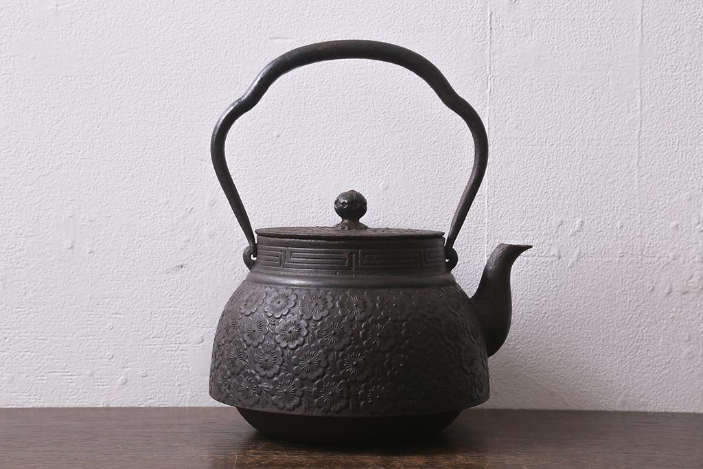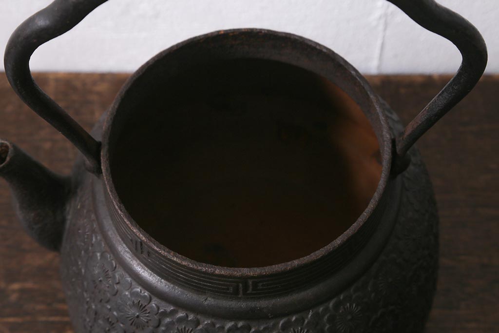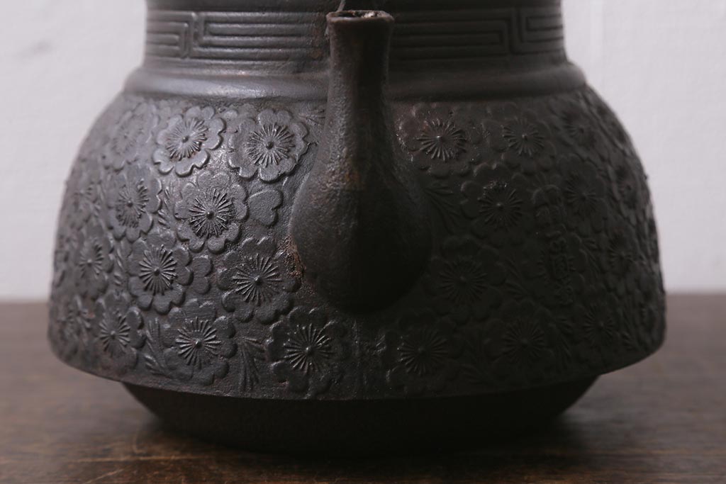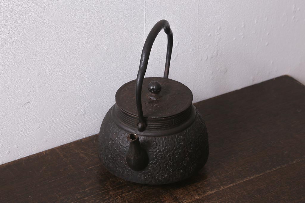 ビンテージ雑貨 桜模様 古い南部鉄瓶(鉄急須、茶道具)(R-041284)