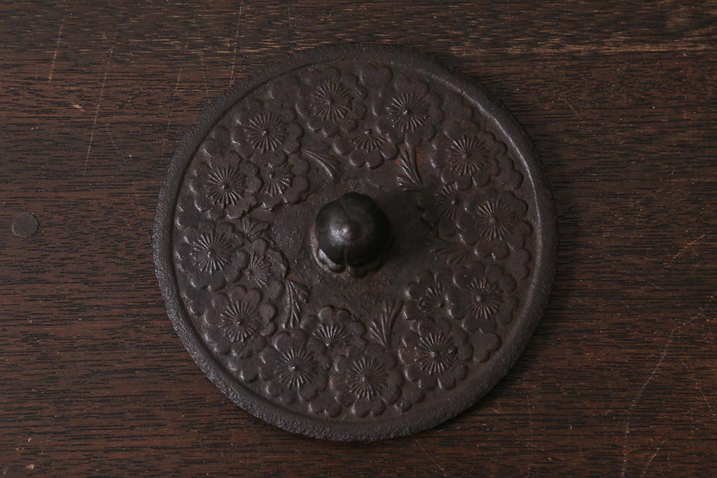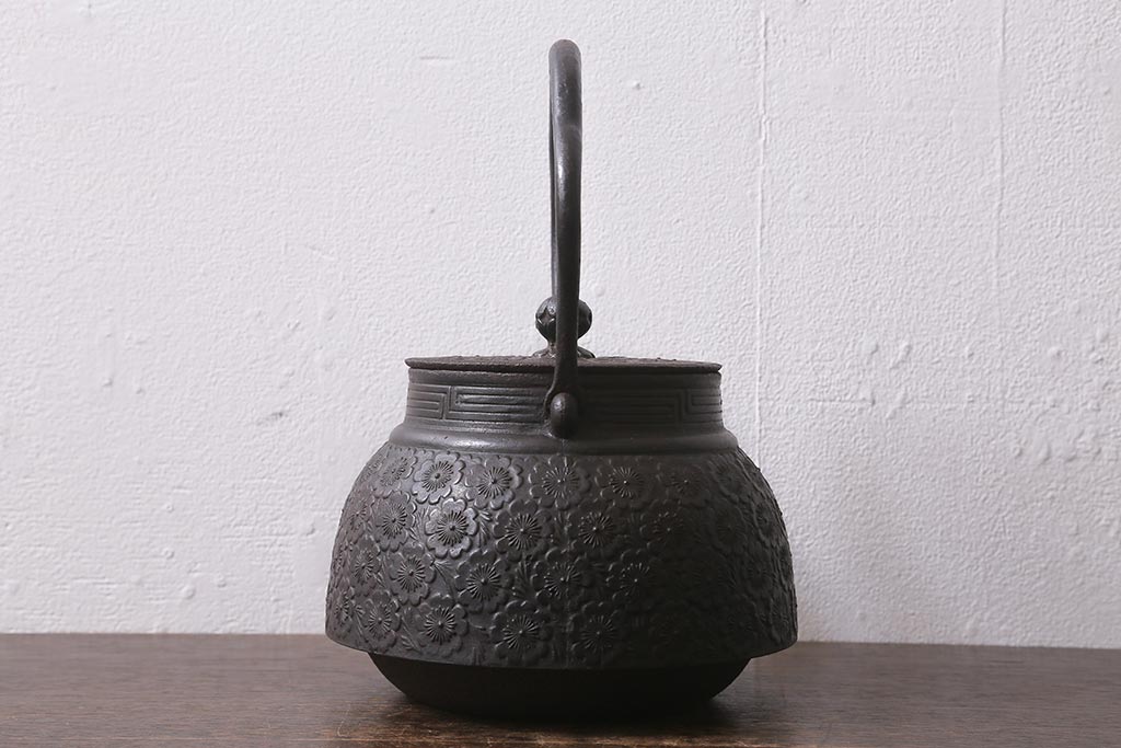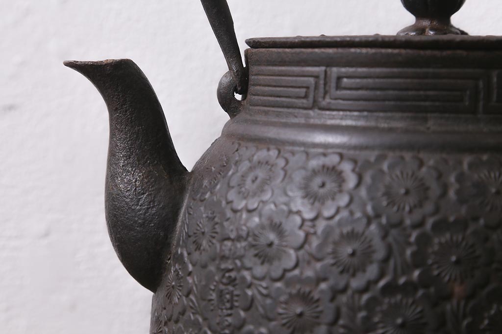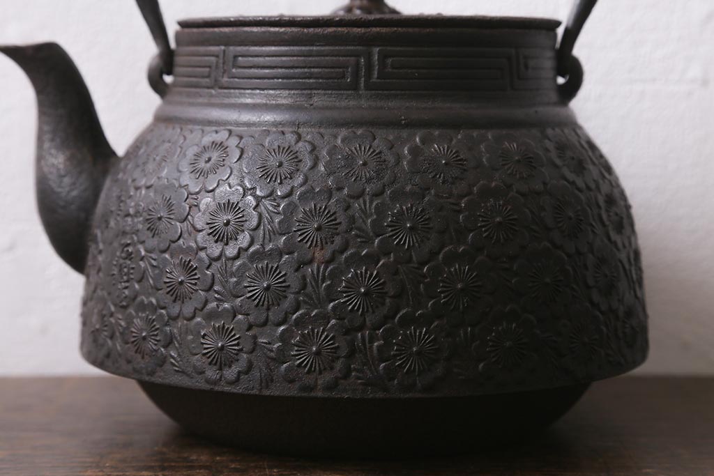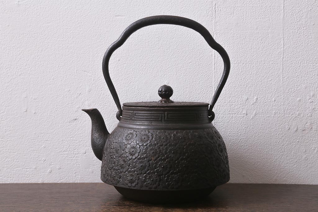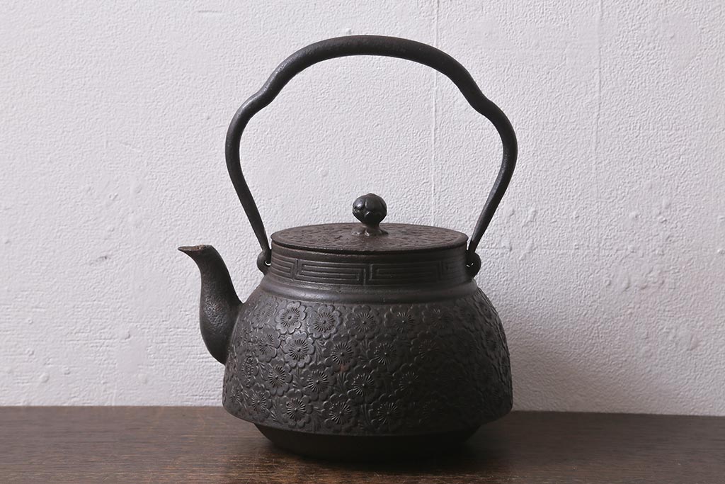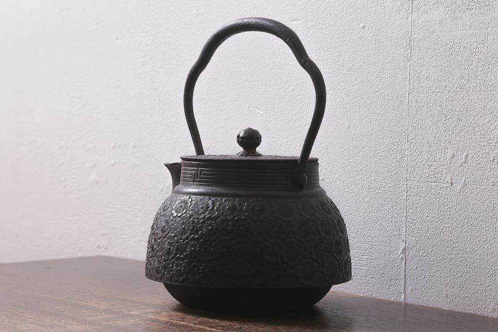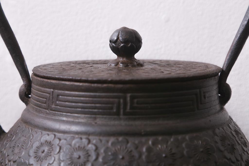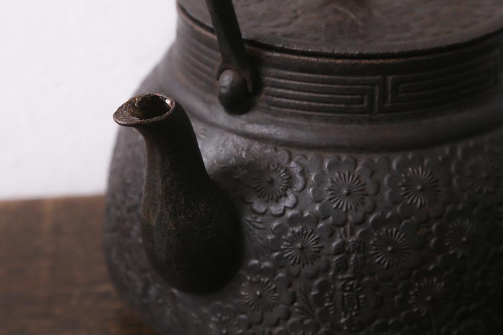 ビンテージ雑貨 桜模様 古い南部鉄瓶(鉄急須、茶道具)(R-041284)