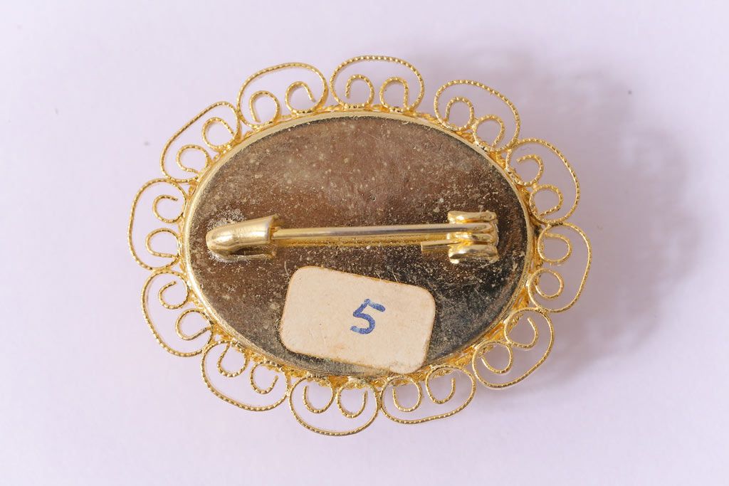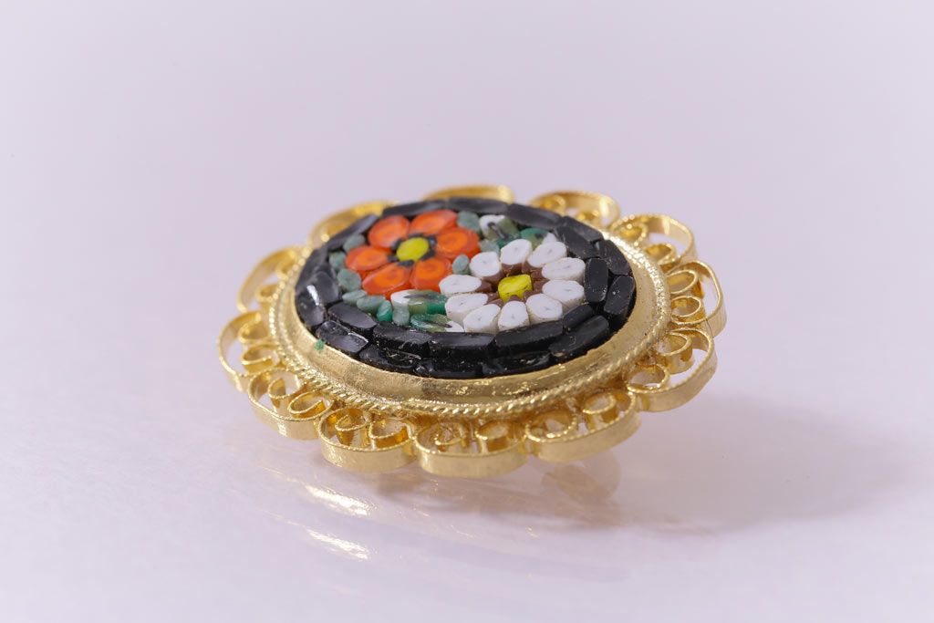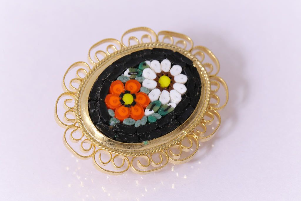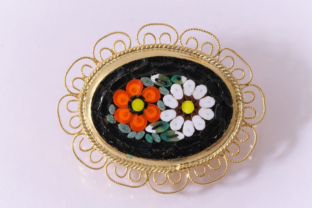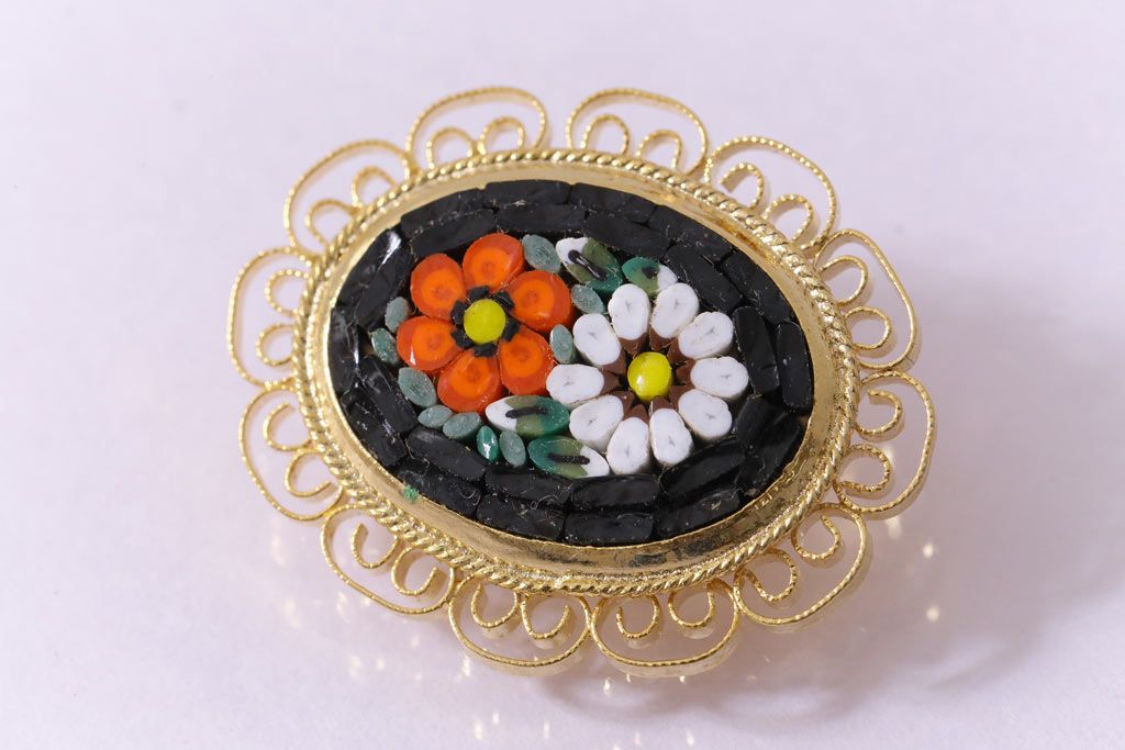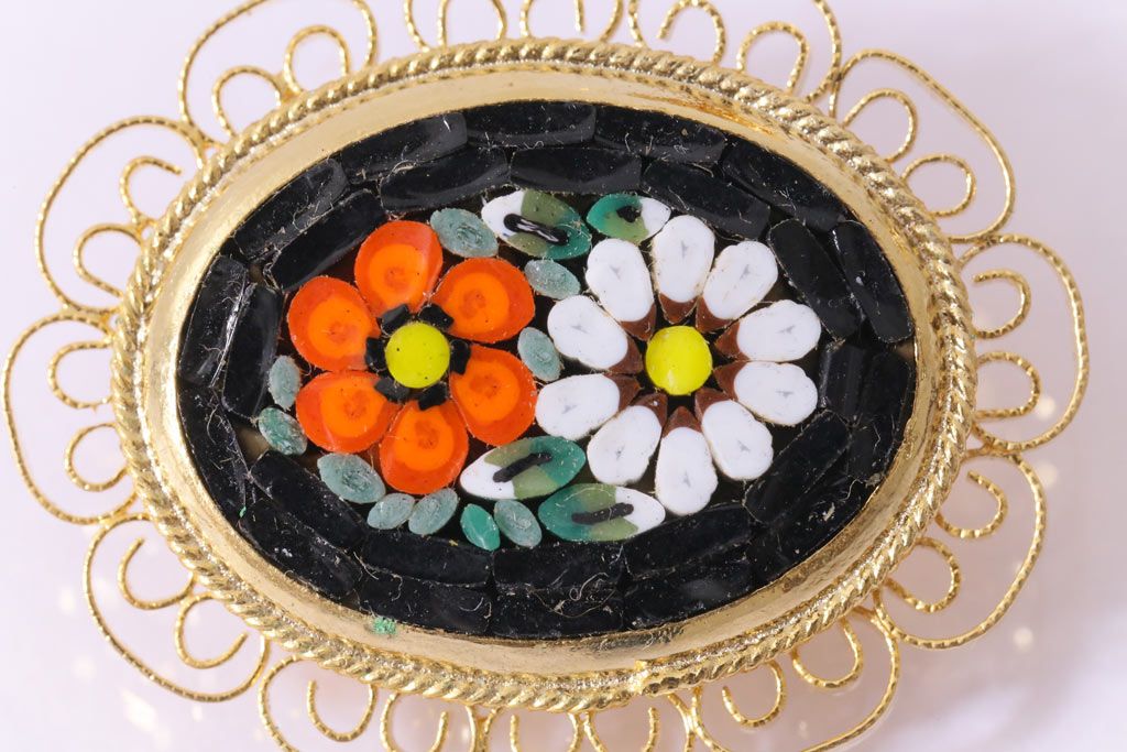 ラフジュ工房> 雑貨 > ヴィンテージ雑貨 マイクロモザイク フラワーモチーフが可愛らしいオーバル型のブローチ(アクセサリー、ビンテージ)(R-041431)