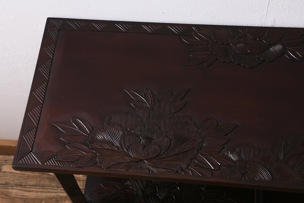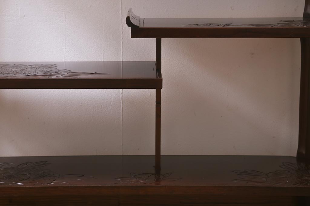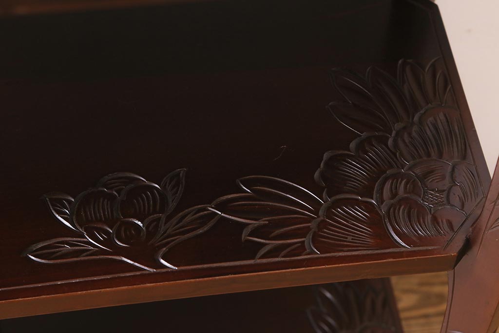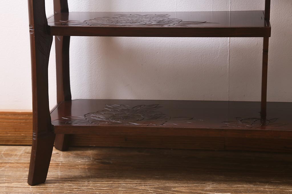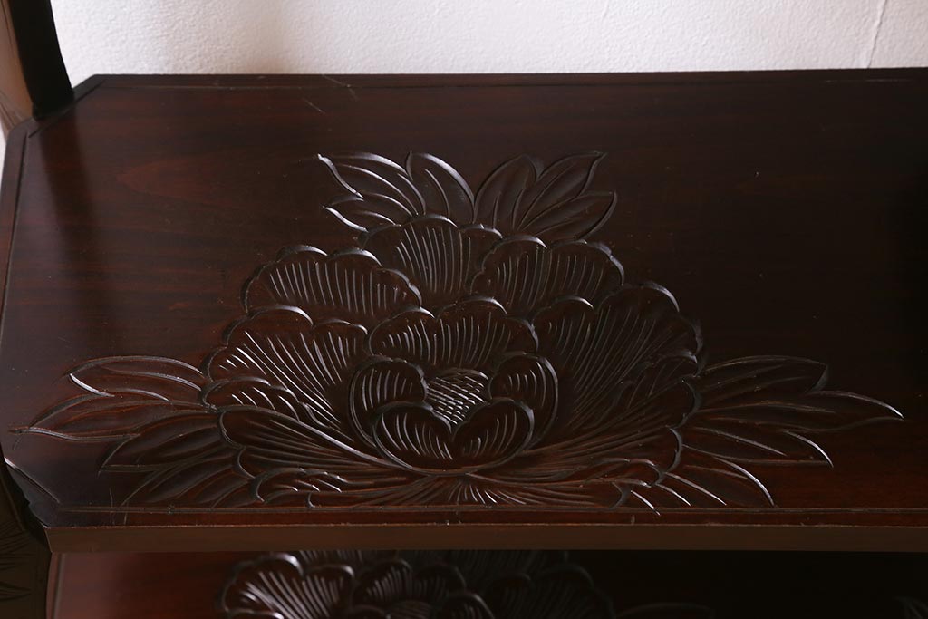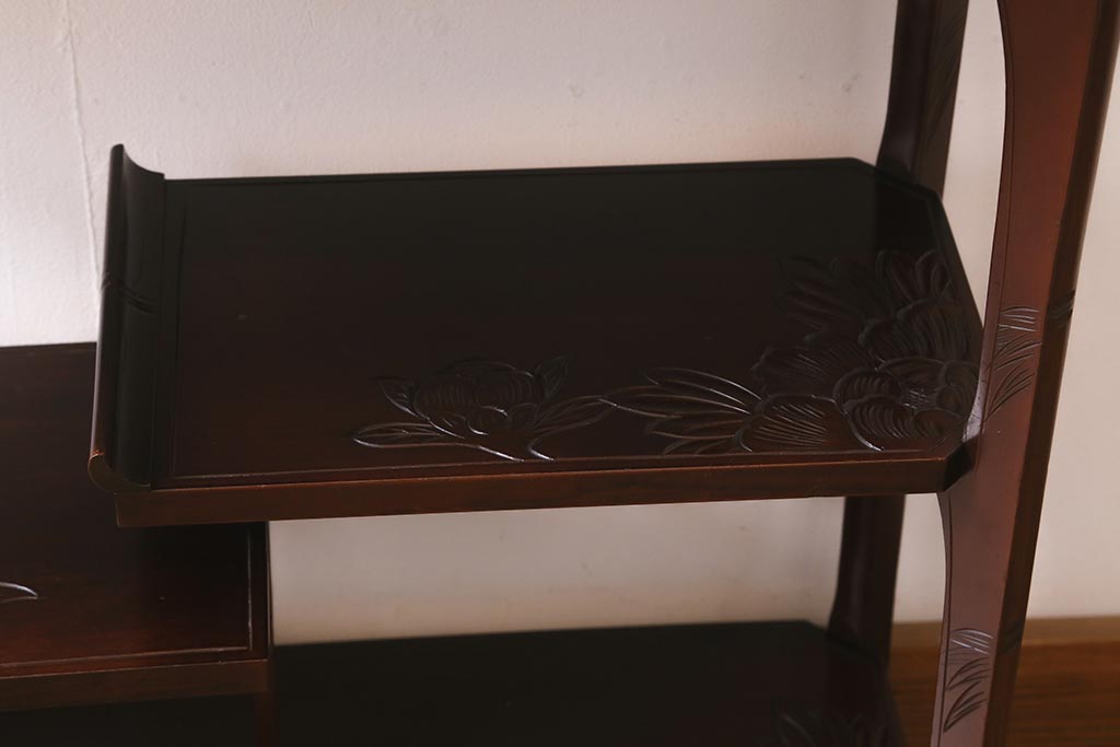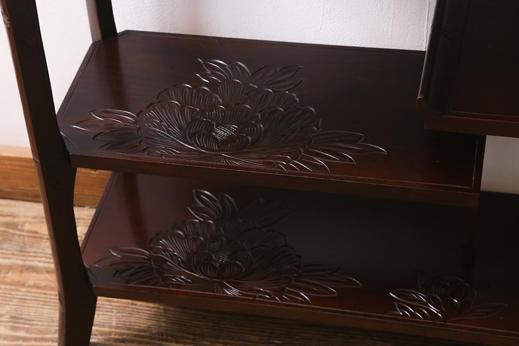 中古 伝統工芸 日光彫り 牡丹の彫刻が優美な印象の飾り棚(茶棚、違い棚、オープンラック)(R-041558)