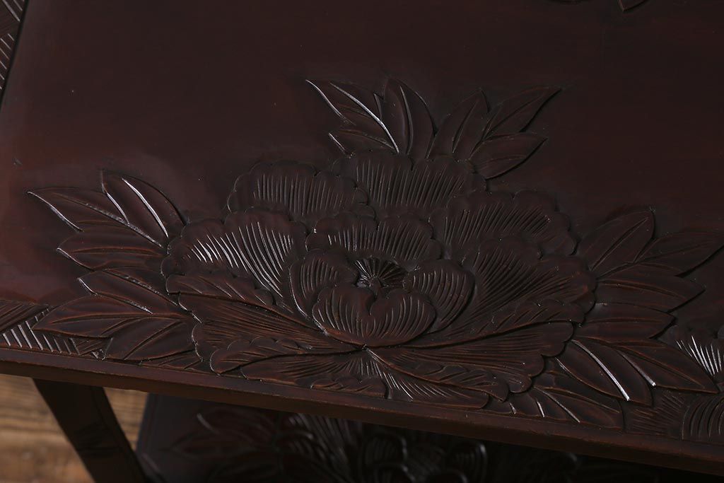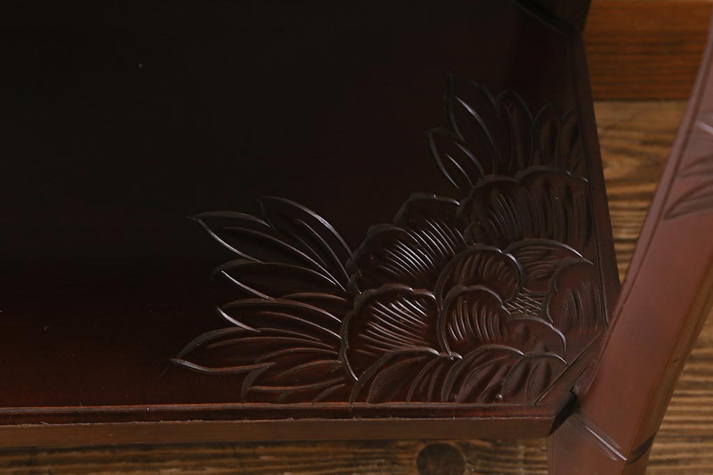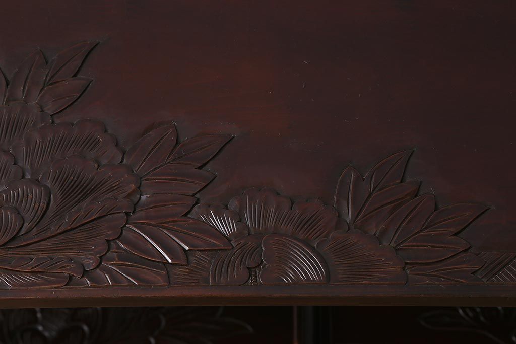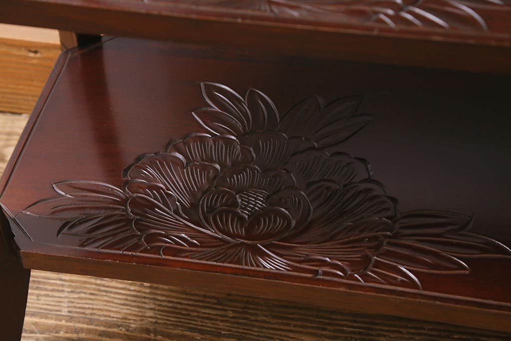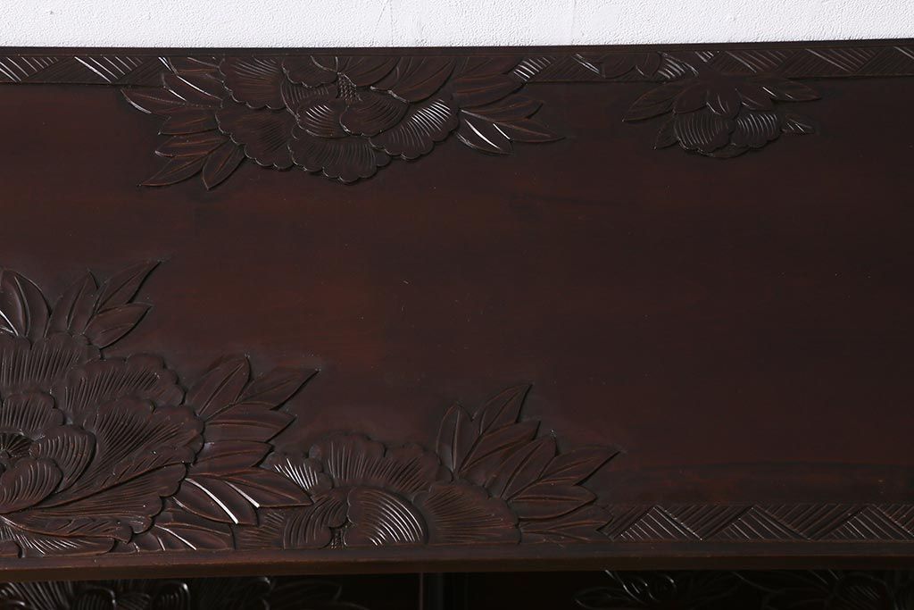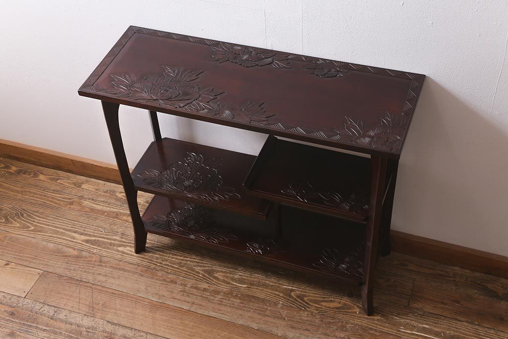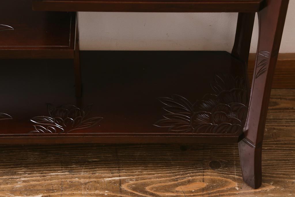 中古 伝統工芸 日光彫り 牡丹の彫刻が優美な印象の飾り棚(茶棚、違い棚、オープンラック)(R-041558)