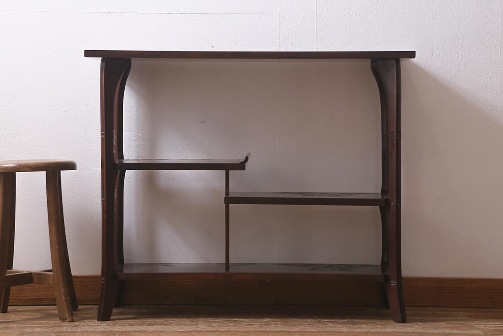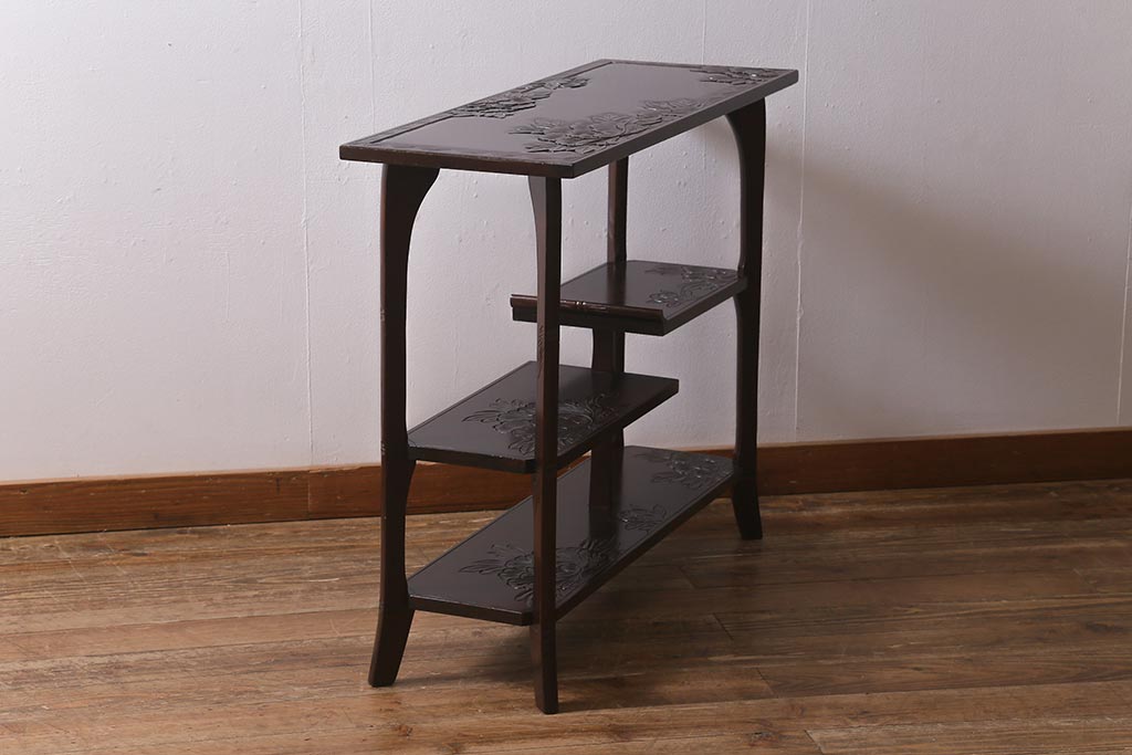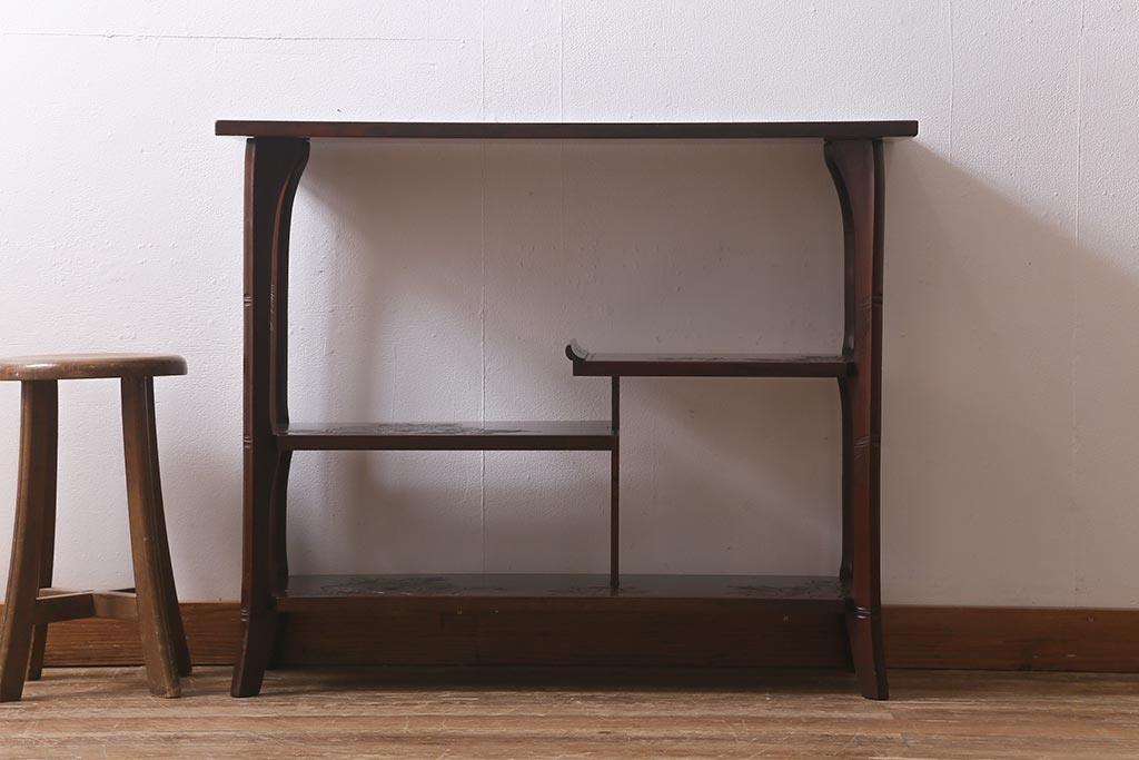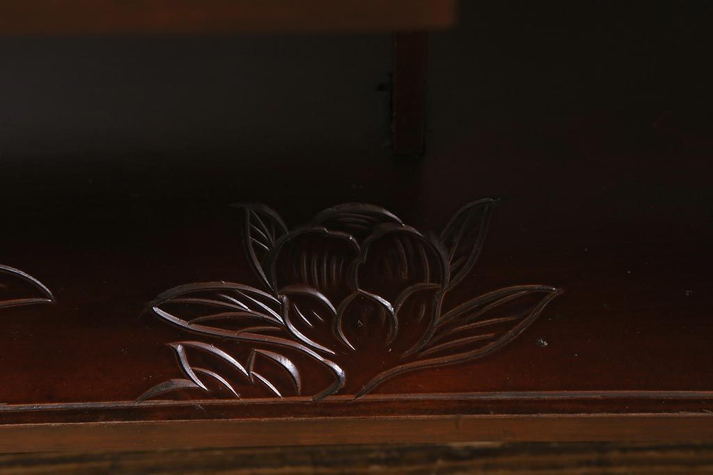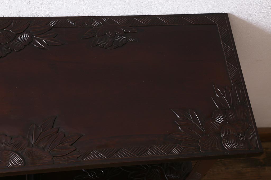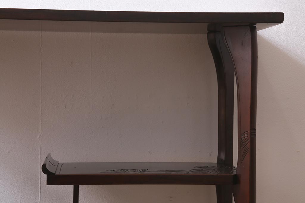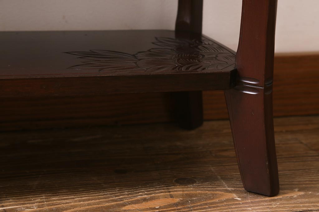 中古 伝統工芸 日光彫り 牡丹の彫刻が優美な印象の飾り棚(茶棚、違い棚、オープンラック)(R-041558)