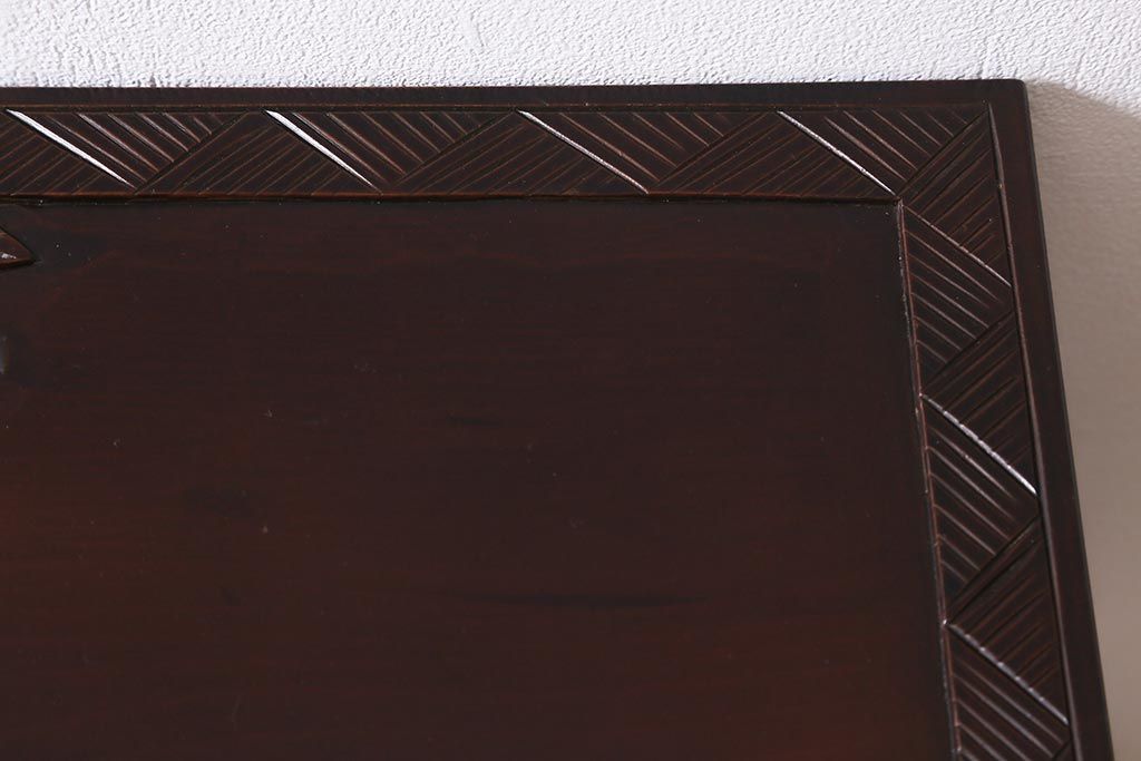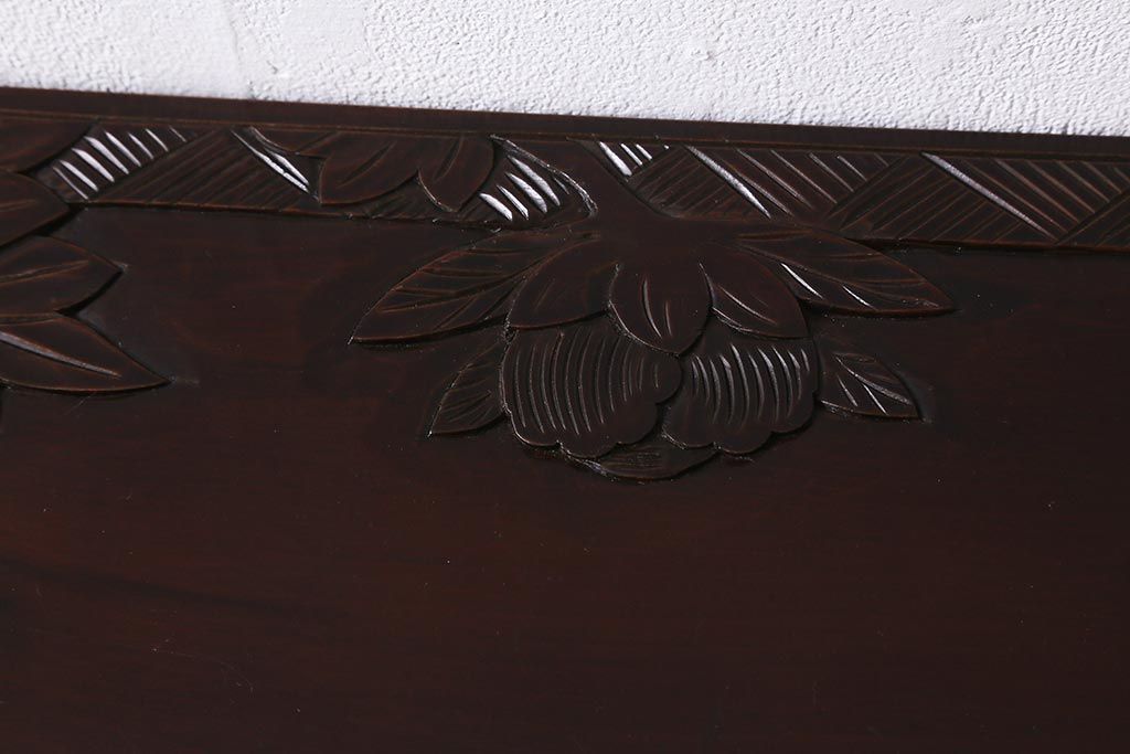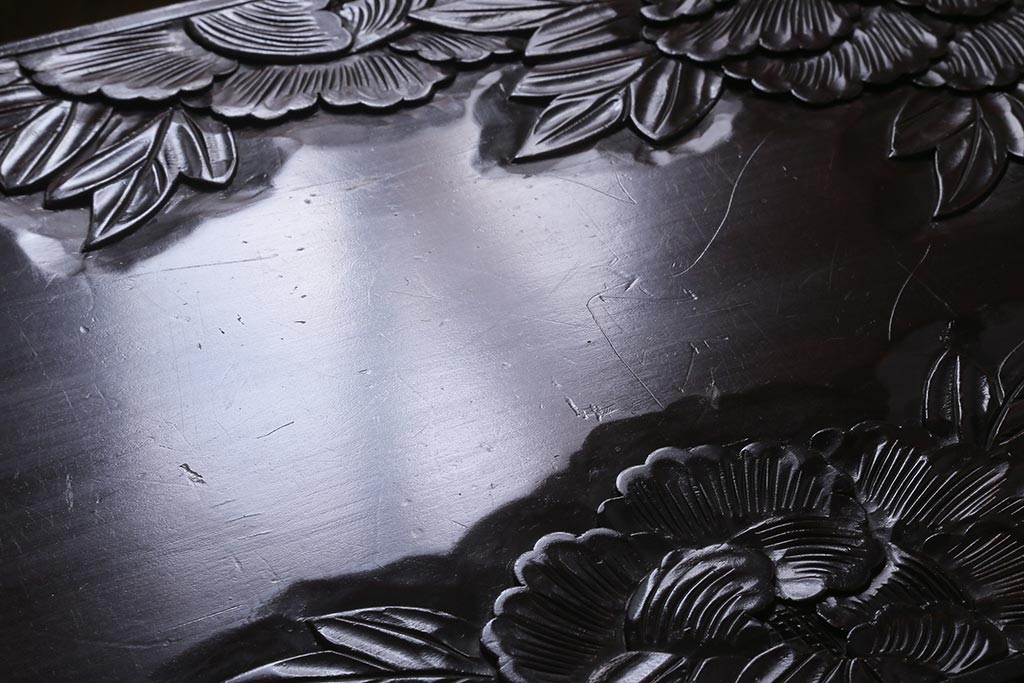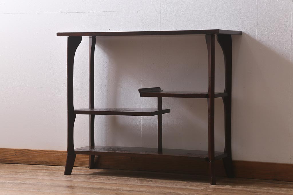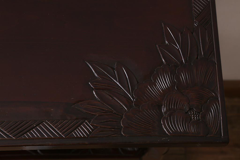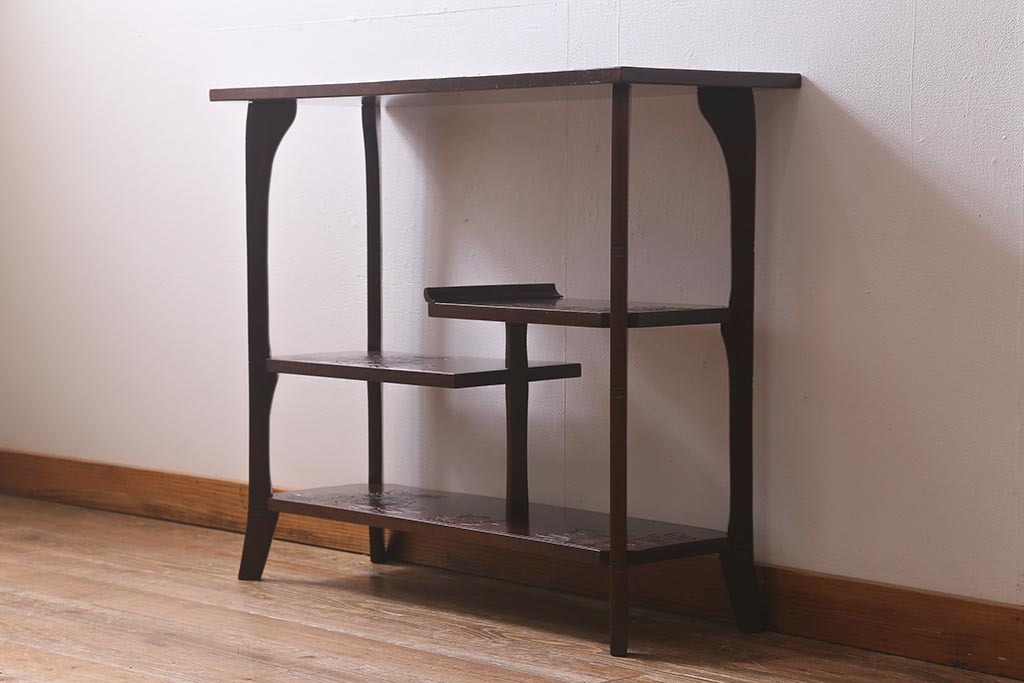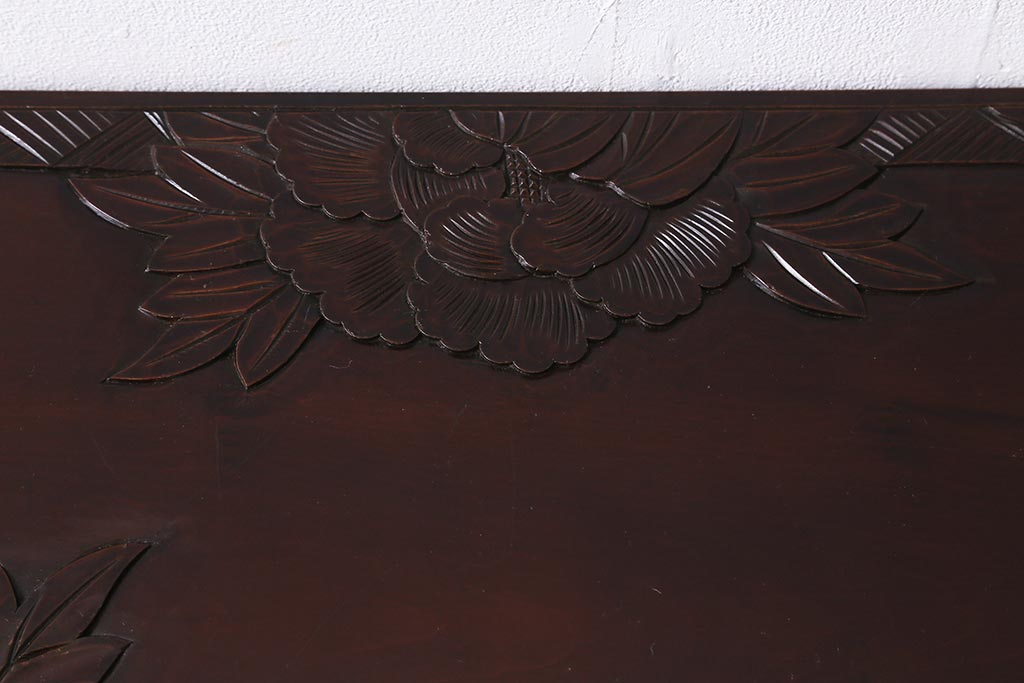 中古 伝統工芸 日光彫り 牡丹の彫刻が優美な印象の飾り棚(茶棚、違い棚、オープンラック)(R-041558)