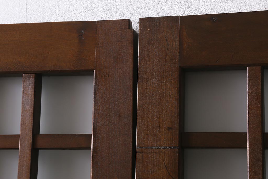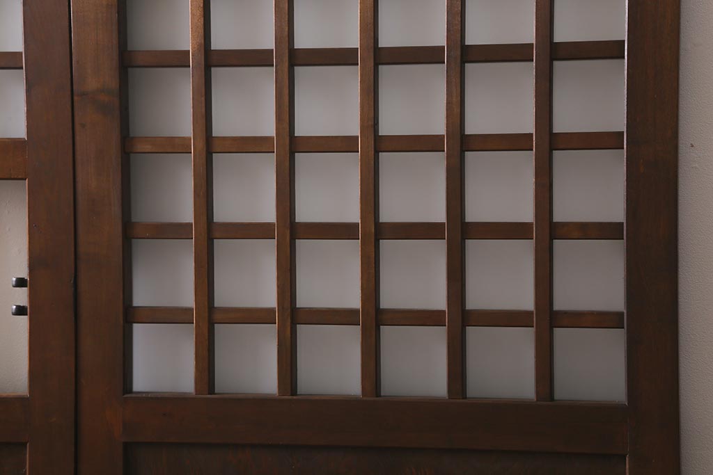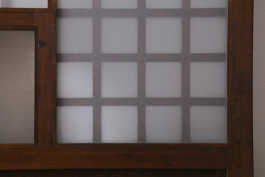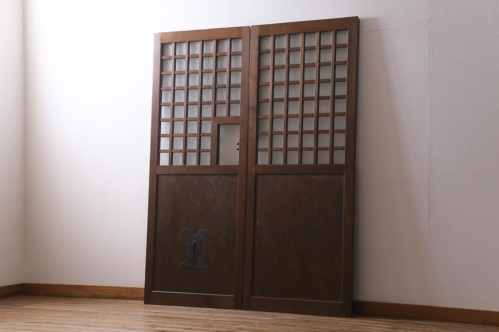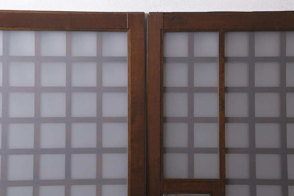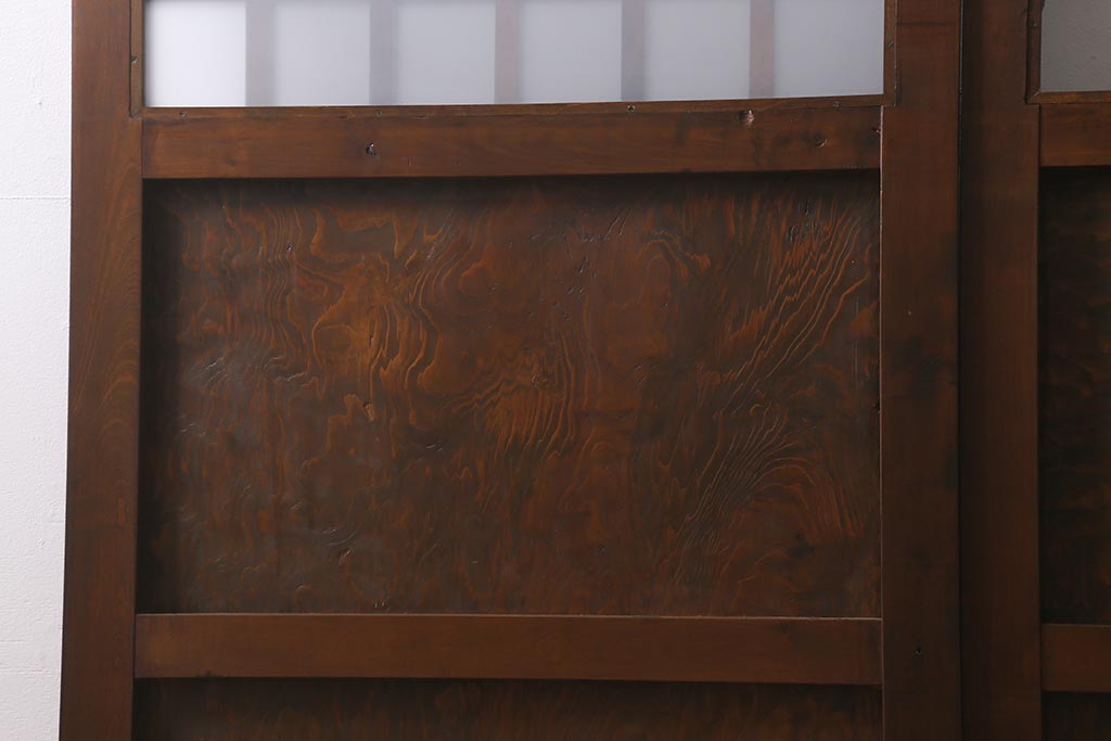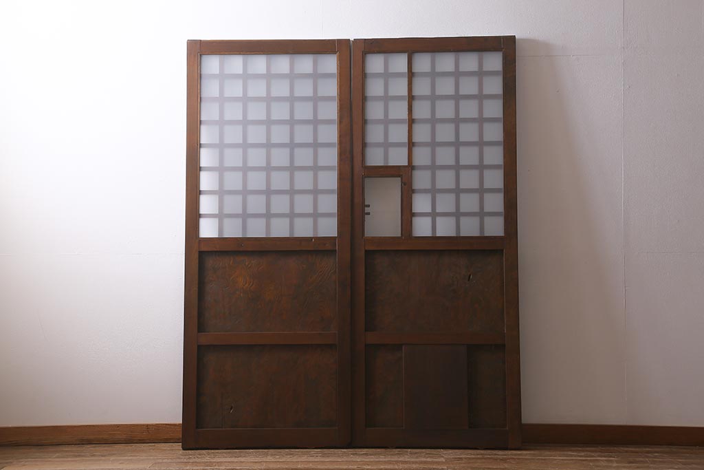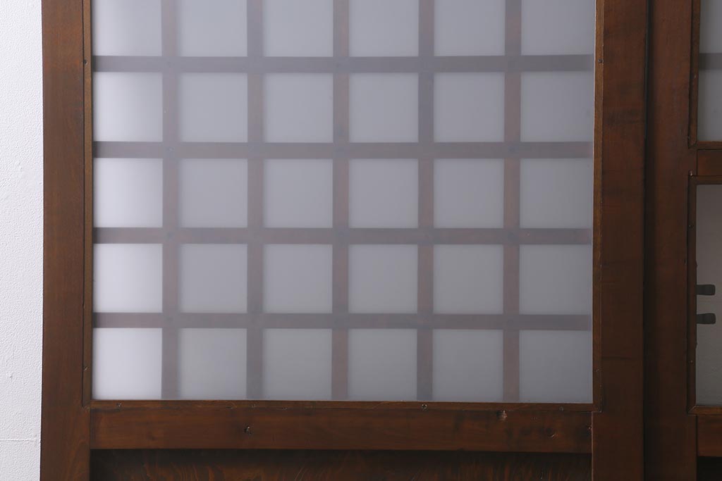 アンティーク建具 明治大正期 蔵戸リメイク 杉材一枚板・枠樺材 すり・クリアガラス入り 升格子の蔵戸2枚セット(引き戸、玄関戸)(R-041648)