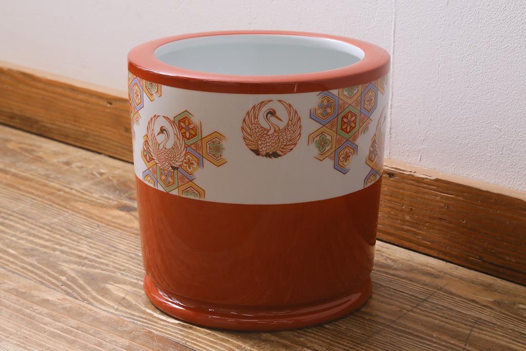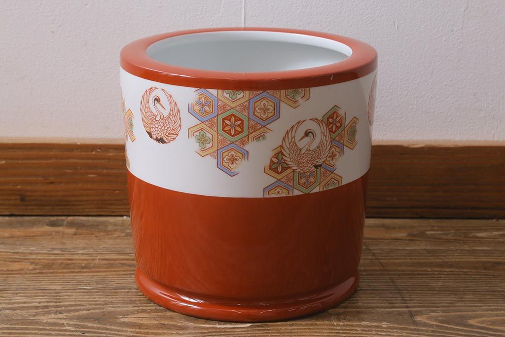 骨董・美術品> 骨董-陶磁器 > 和製アンティーク オールドノリタケ 日陶(則武) 昭和初期 鶴丸文 目を引く朱色の火鉢(瀬戸火鉢、Noritake、noritake、NORITAKE、手あぶり、鉢カバー、傘立て)(R-041563)