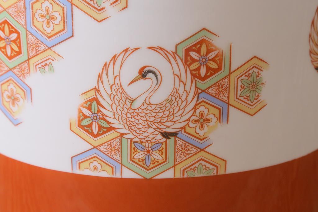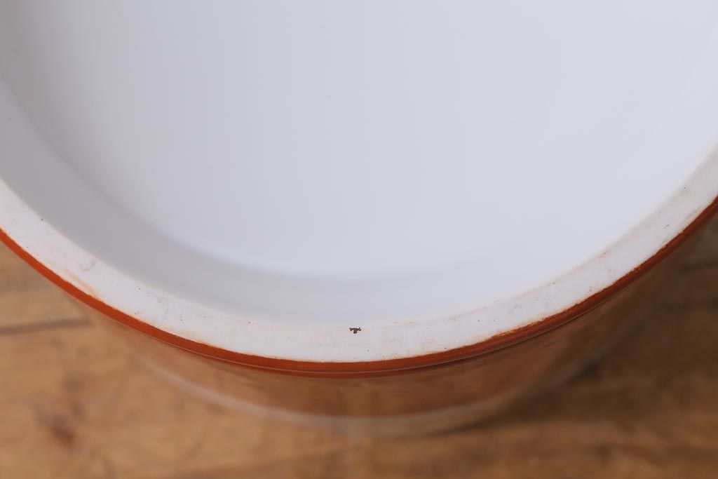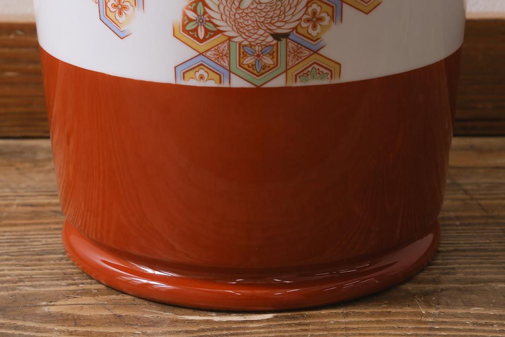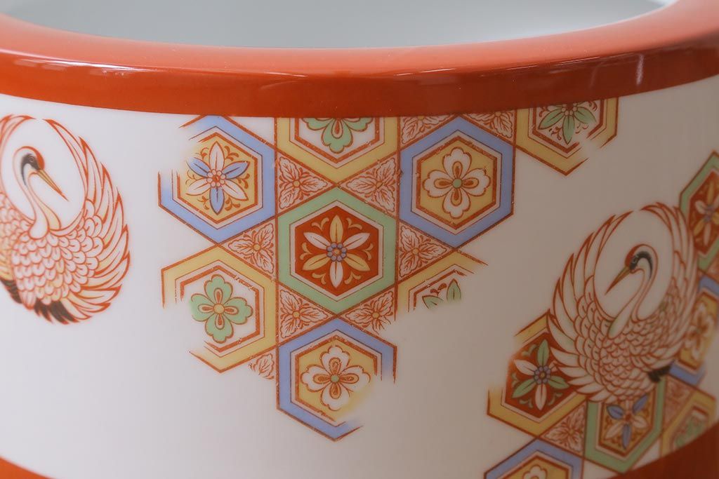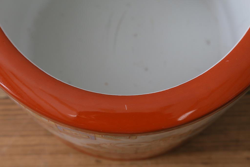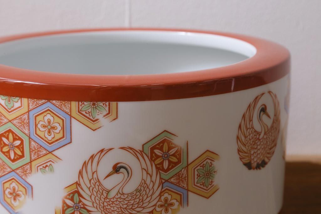火鉢> 瀬戸火鉢 > 和製アンティーク オールドノリタケ 日陶(則武) 昭和初期 鶴丸文 目を引く朱色の火鉢(瀬戸火鉢、Noritake、noritake、NORITAKE、手あぶり、鉢カバー、傘立て)(R-041563)