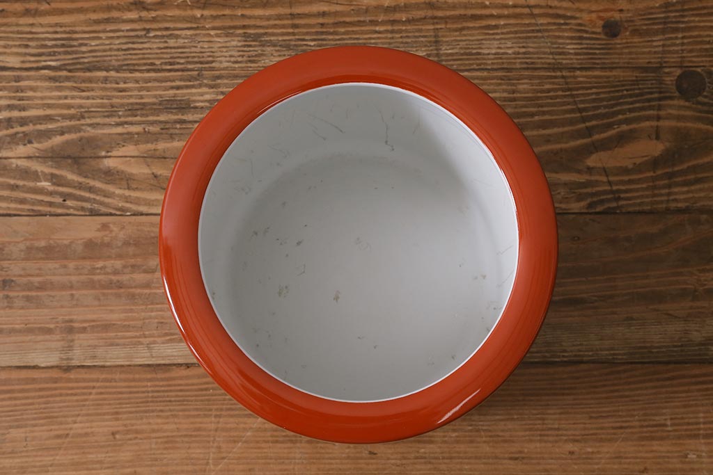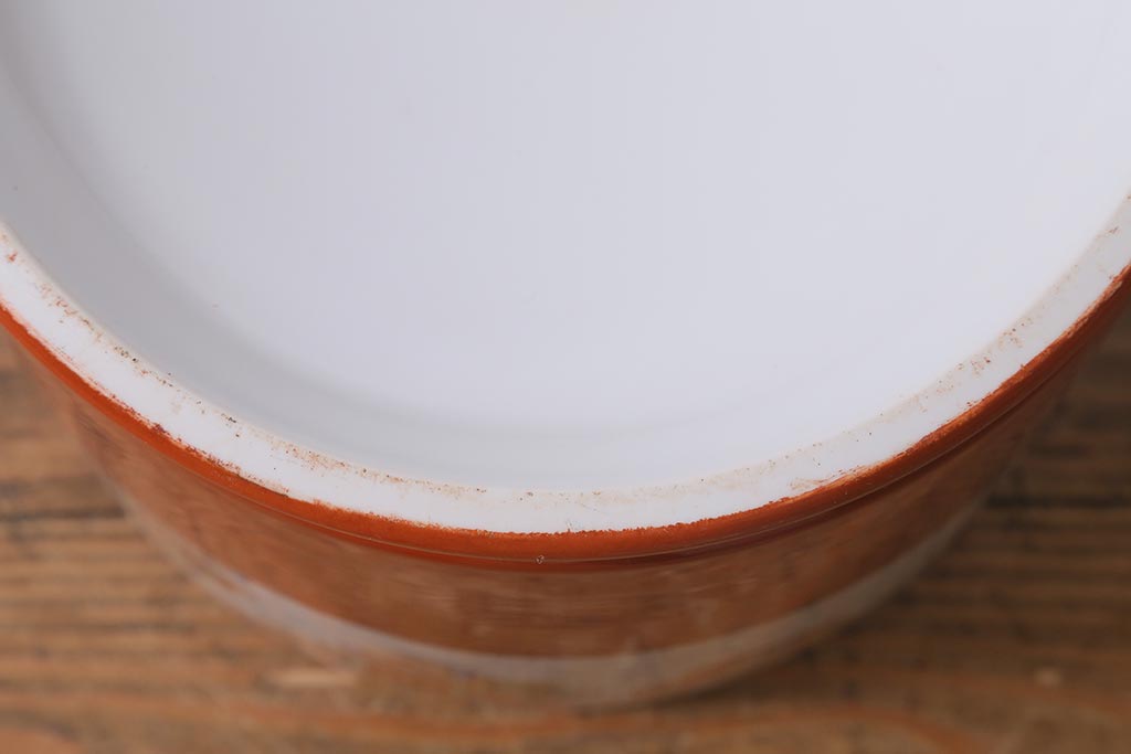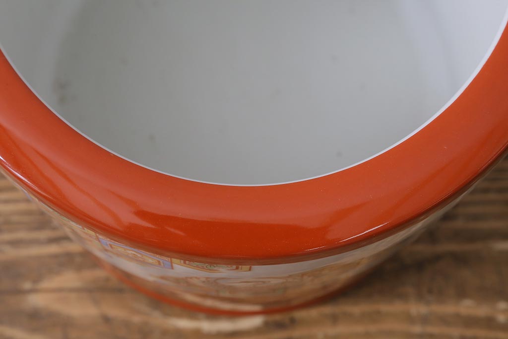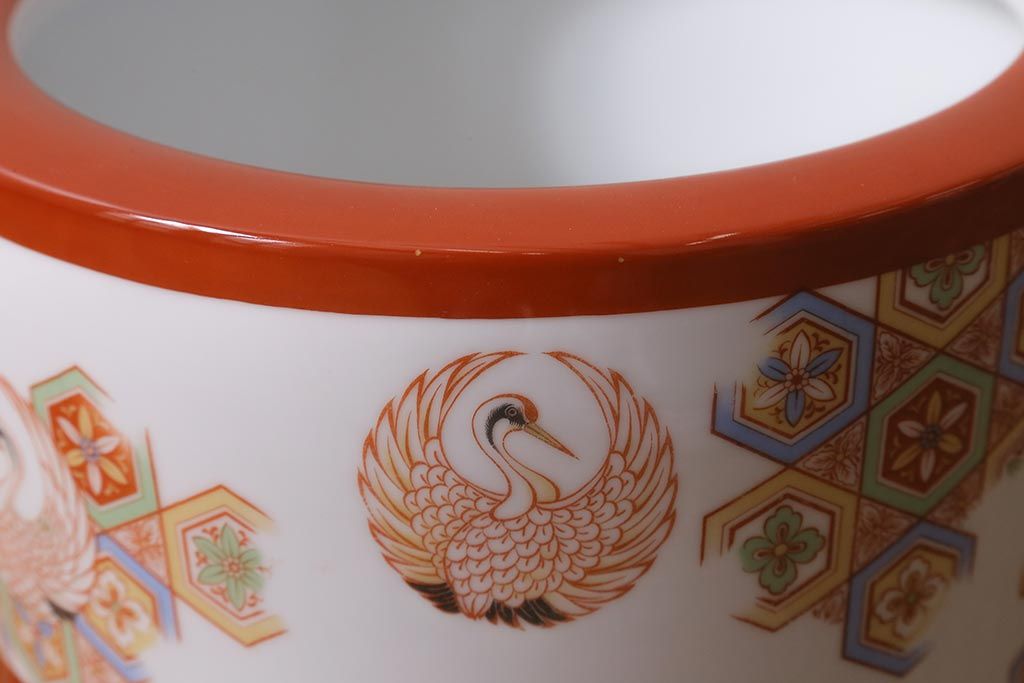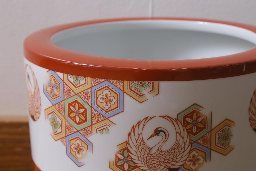 火鉢> 瀬戸火鉢 > 和製アンティーク オールドノリタケ 日陶(則武) 昭和初期 鶴丸文 目を引く朱色の火鉢(瀬戸火鉢、Noritake、noritake、NORITAKE、手あぶり、鉢カバー、傘立て)(R-041565)