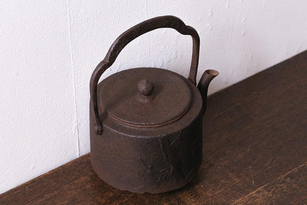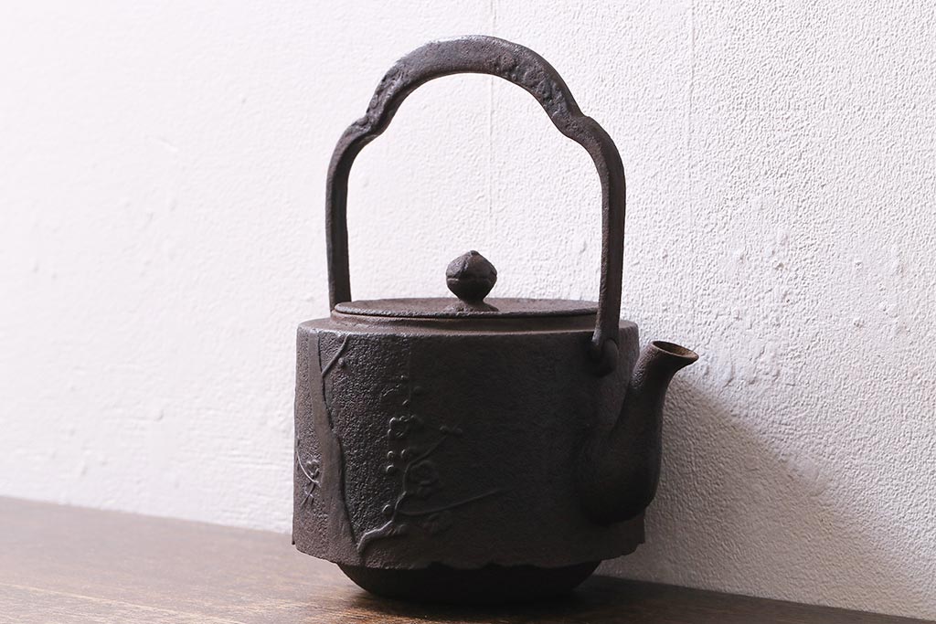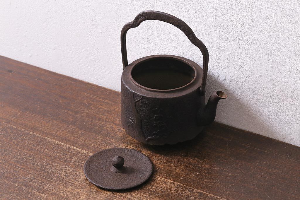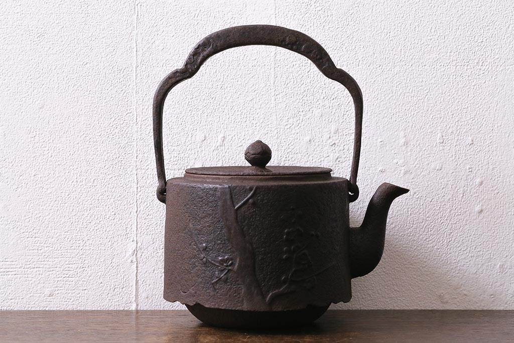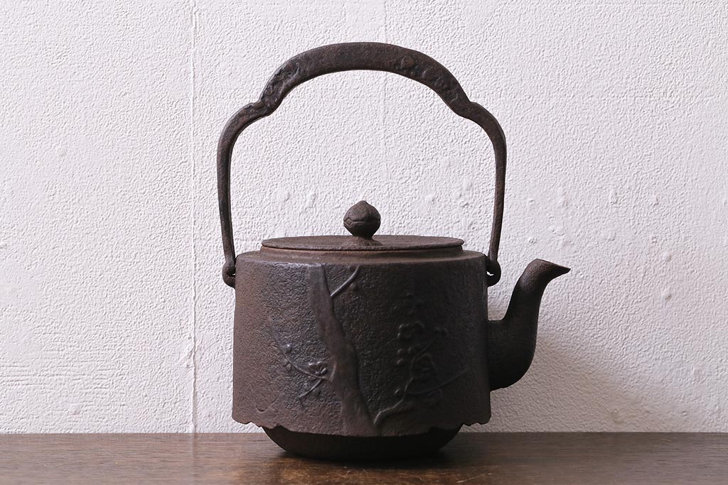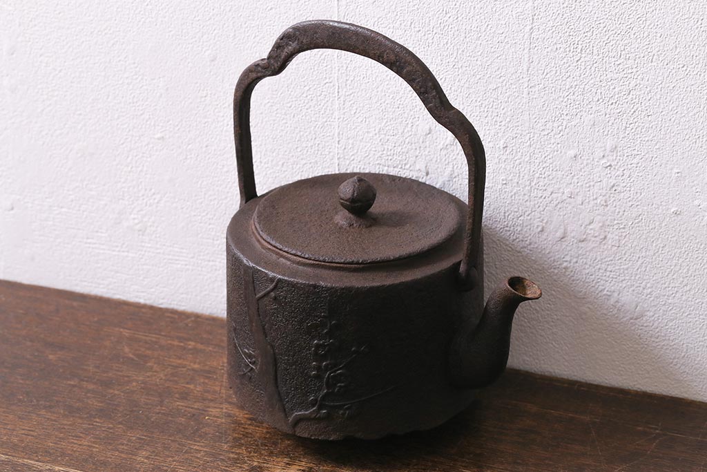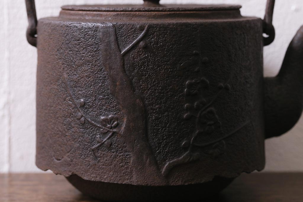 アンティーク雑貨 昭和初期 南部鉄器 天祐堂 梅の図 古い鉄瓶(鉄ビン、茶道具)(R-041132)
