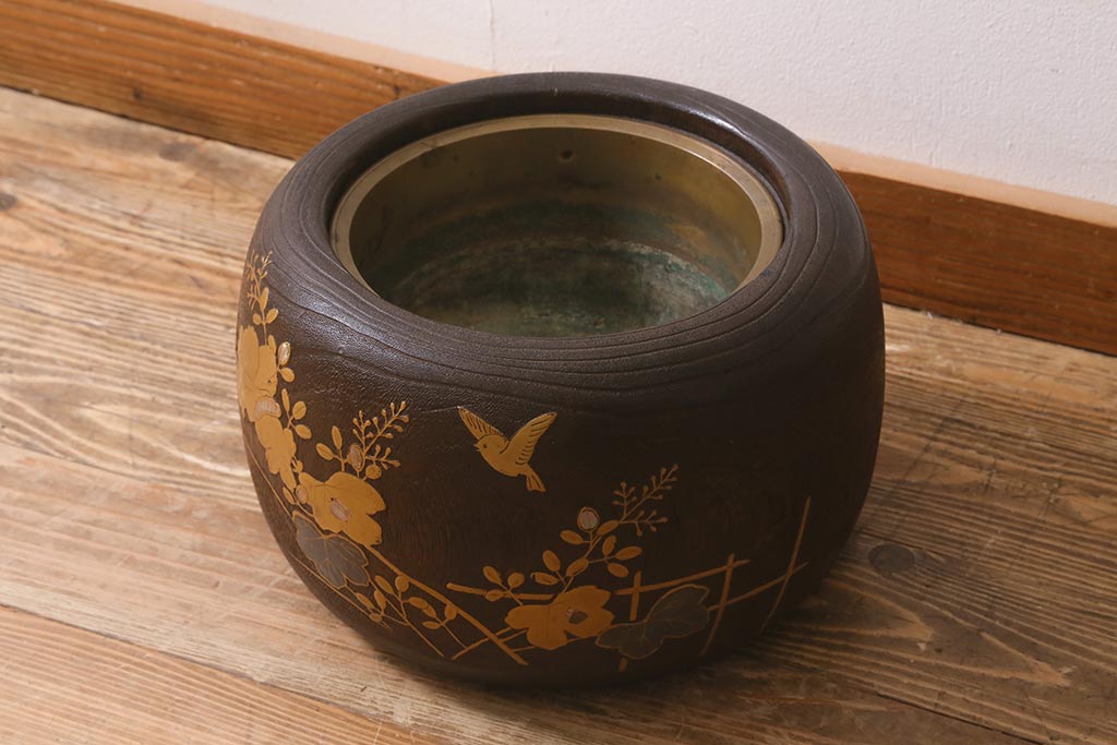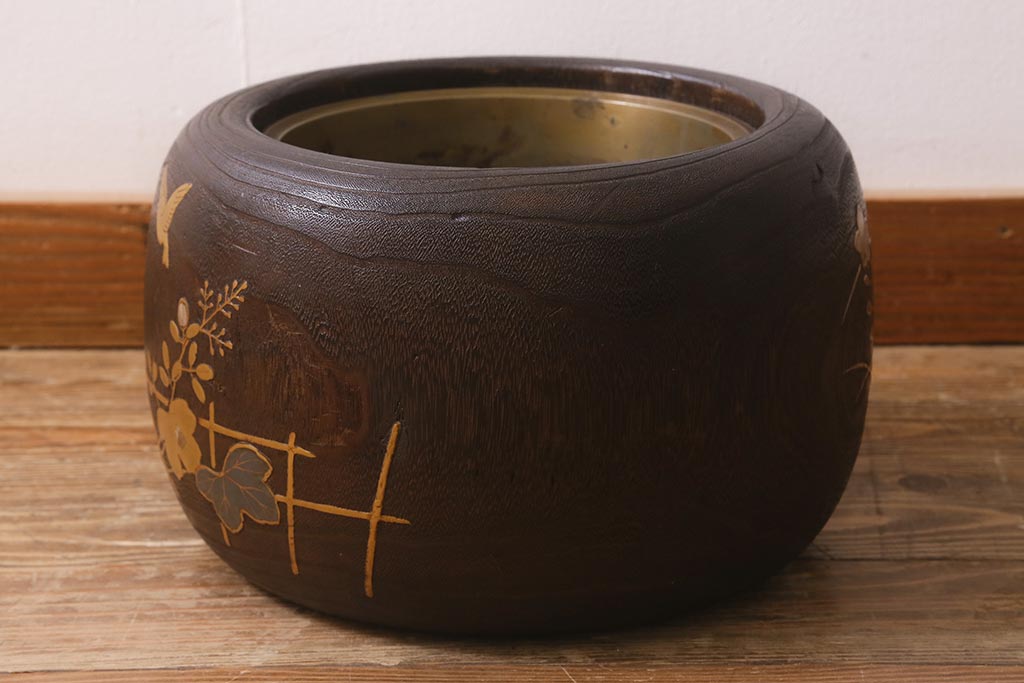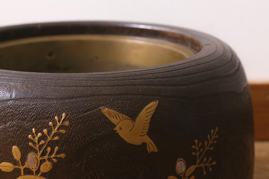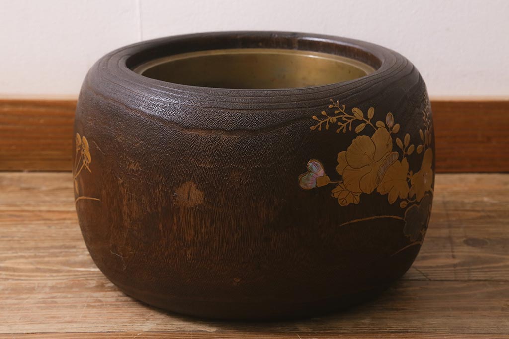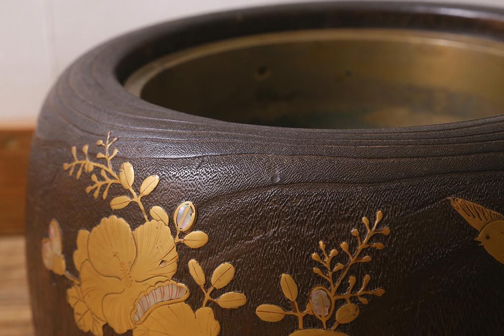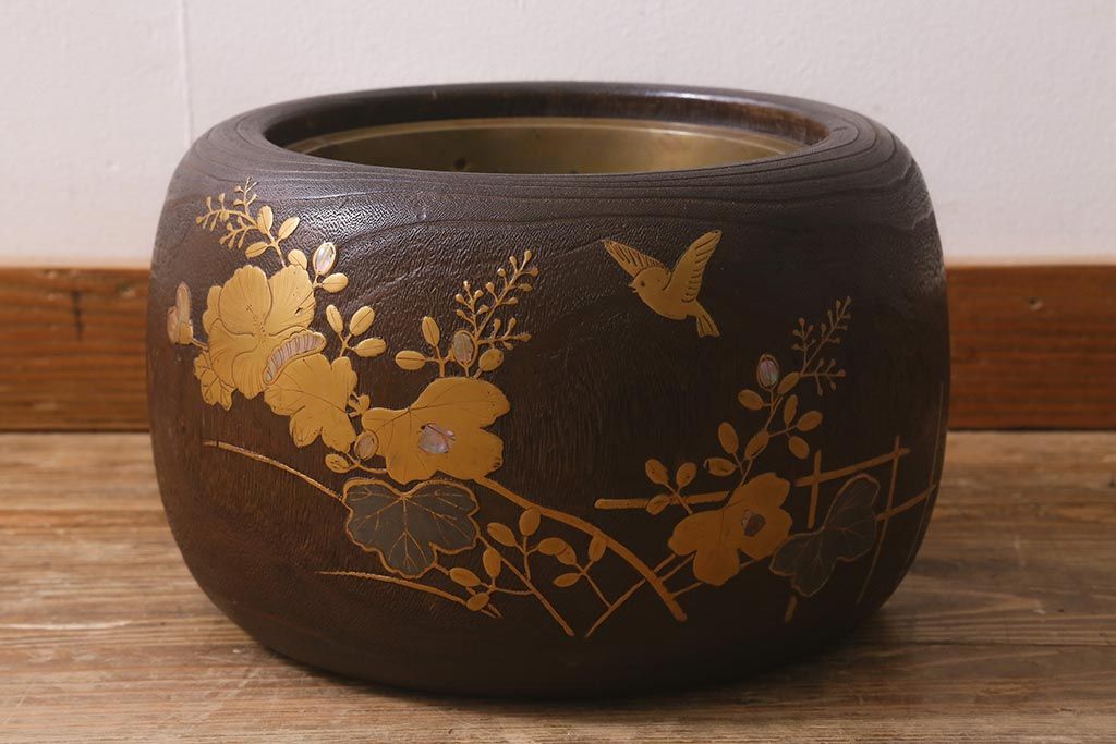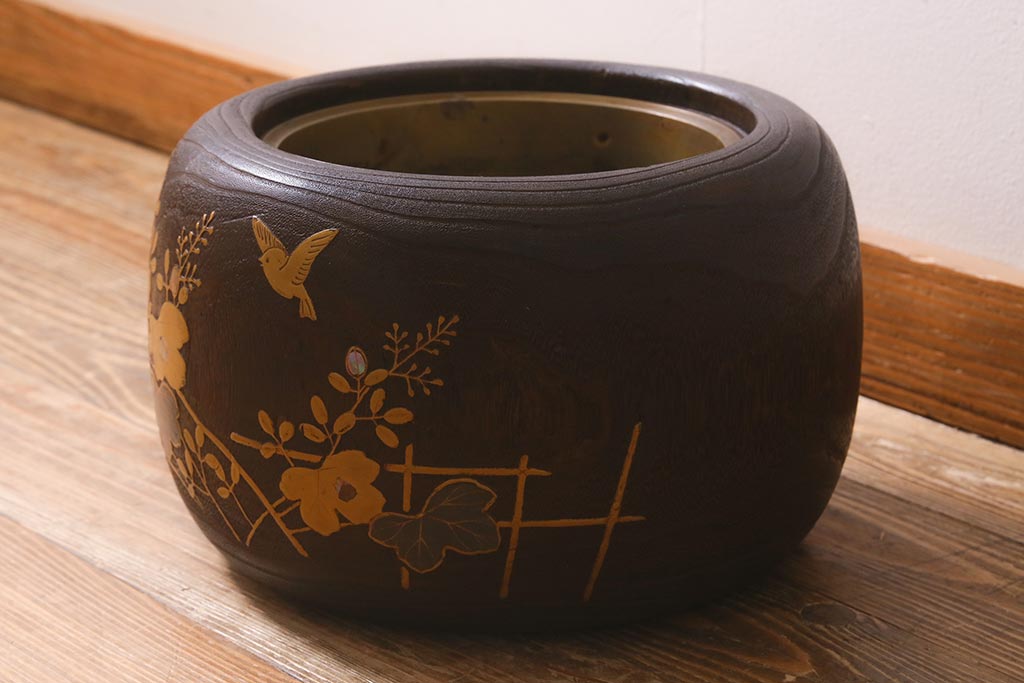 火鉢> 木製火鉢 > アンティーク雑貨 大正昭和初期 桐材 蒔絵・螺鈿 花鳥図が目を引く刳り貫き火鉢(木製火鉢、手あぶり)(R-041696)