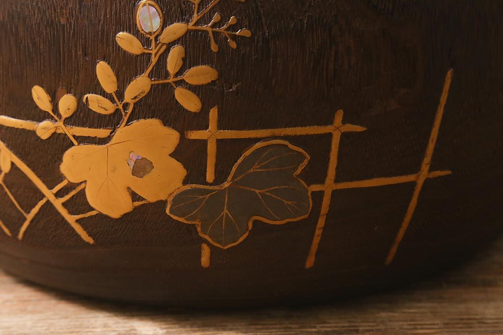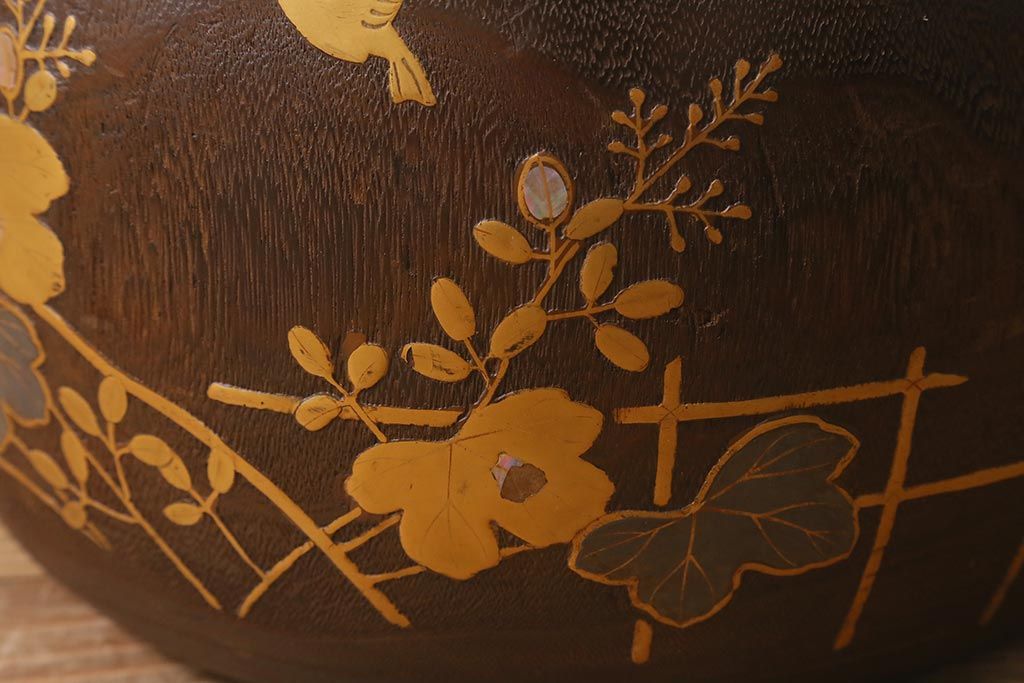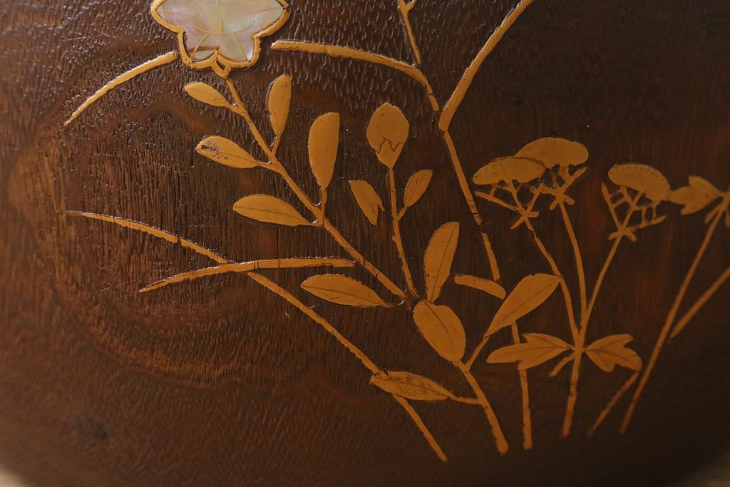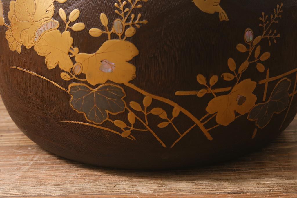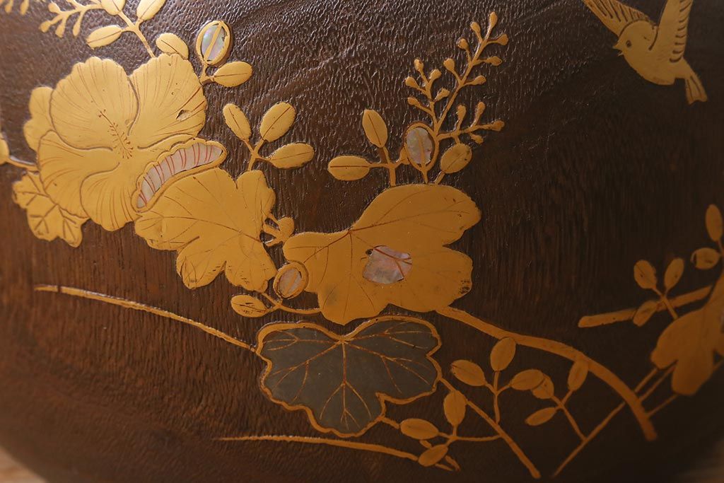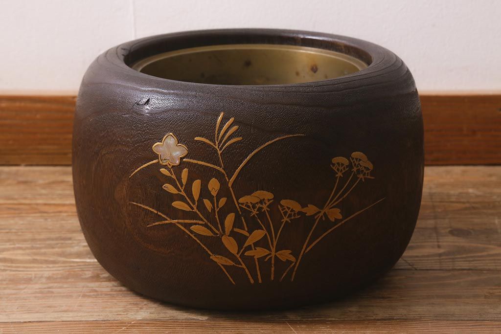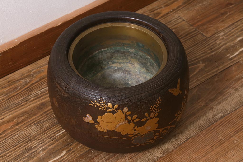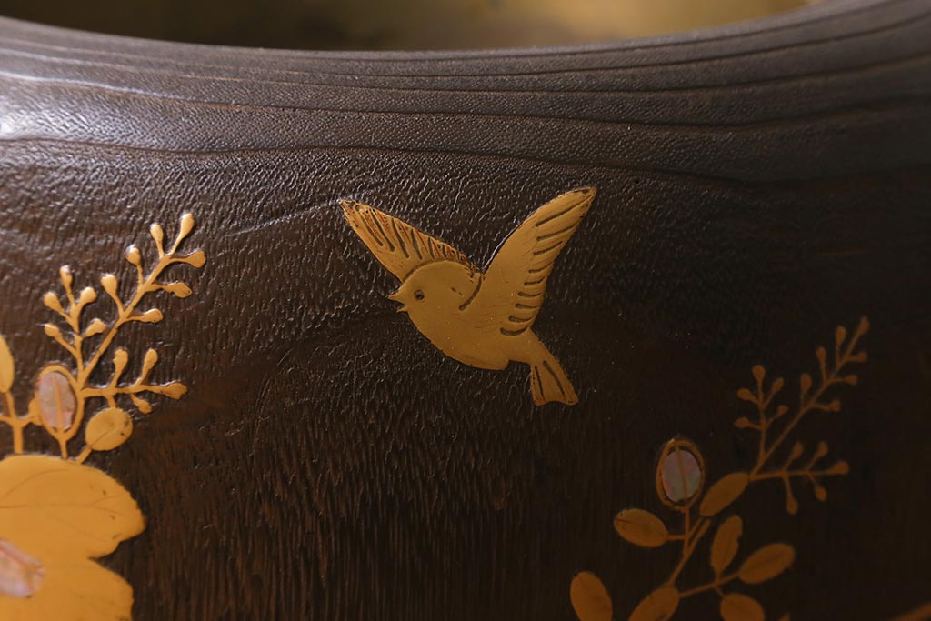 火鉢> 木製火鉢 > アンティーク雑貨 大正昭和初期 桐材 蒔絵・螺鈿 花鳥図が目を引く刳り貫き火鉢(木製火鉢、手あぶり)(R-041696)
