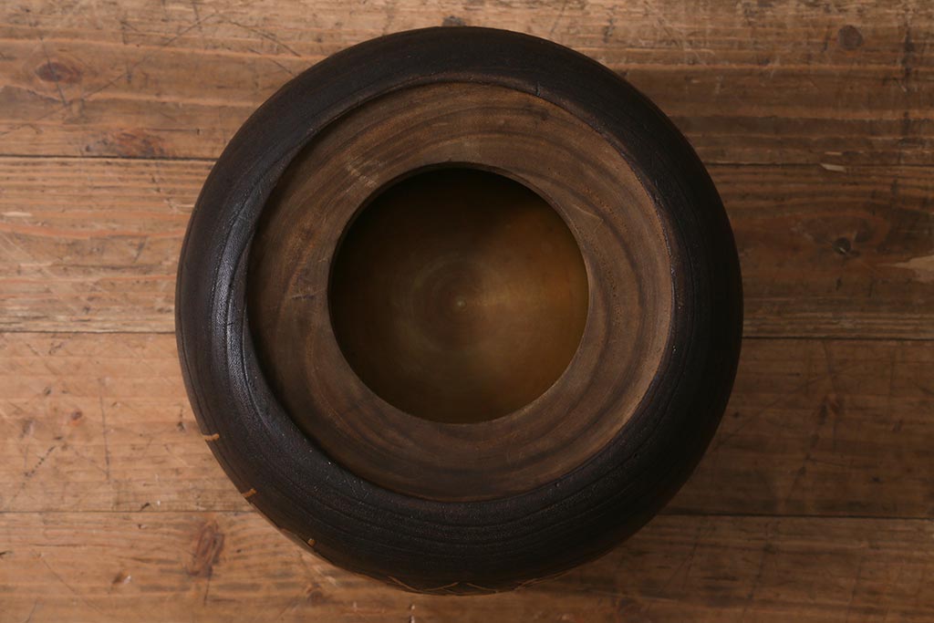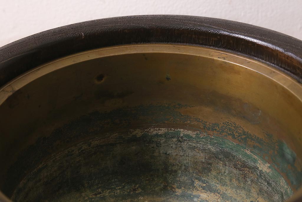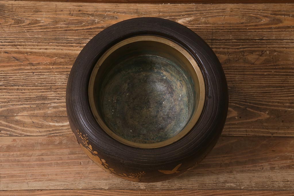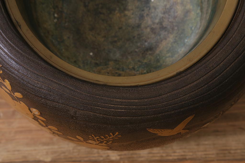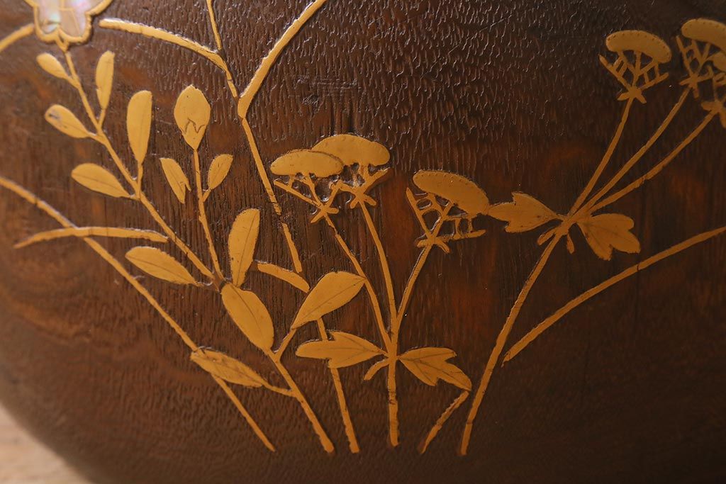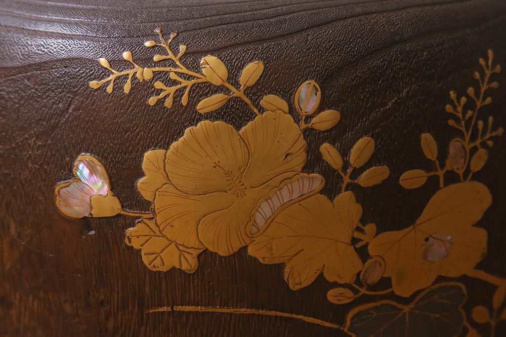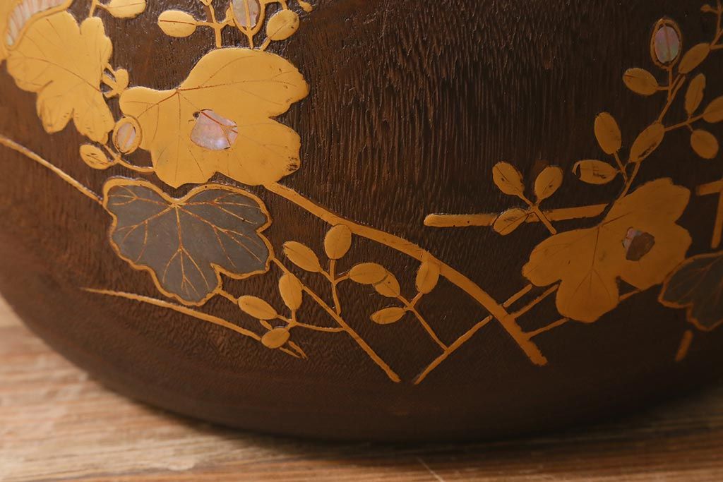 火鉢> 木製火鉢 > アンティーク雑貨 大正昭和初期 桐材 蒔絵・螺鈿 花鳥図が目を引く刳り貫き火鉢(木製火鉢、手あぶり)(R-041696)