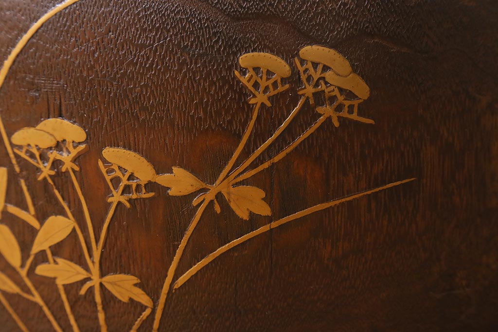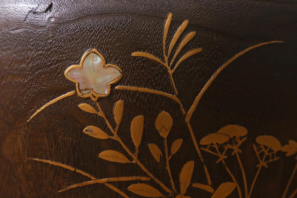 アンティーク雑貨 大正昭和初期 桐材 蒔絵・螺鈿 花鳥図が目を引く刳り貫き火鉢(木製火鉢、手あぶり)(R-041696)