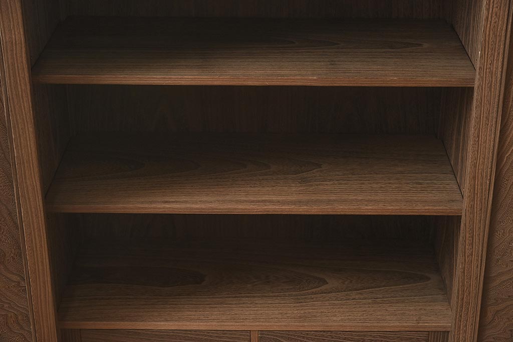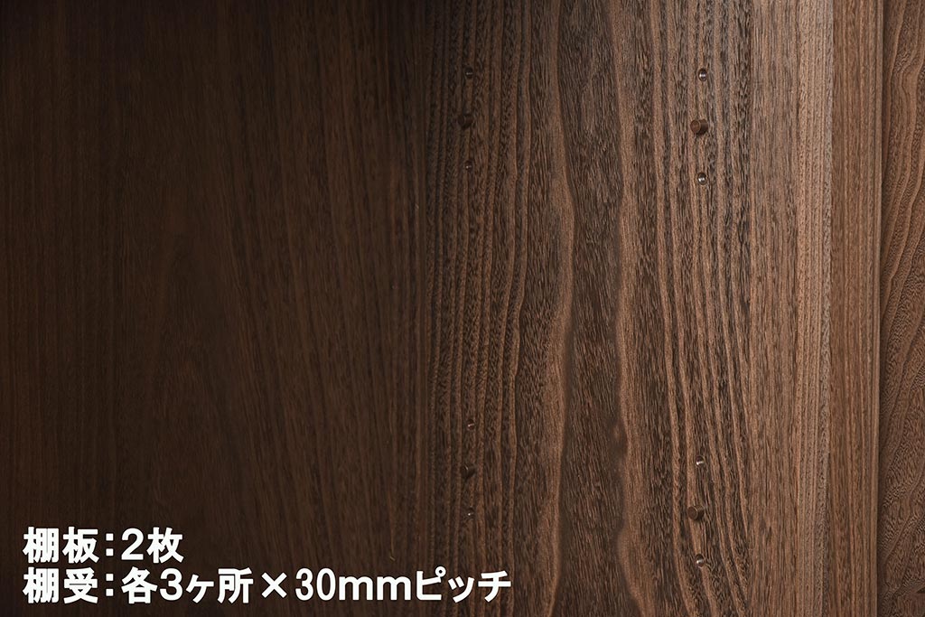 棚板は取り外しできます。棚板は2枚あります。棚受けは3ヶ所、30mmピッチで調整できます。棚幅サイズのものが1枚の作りです。