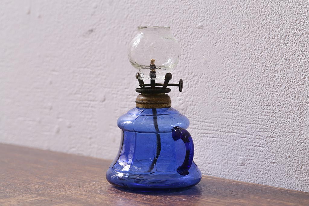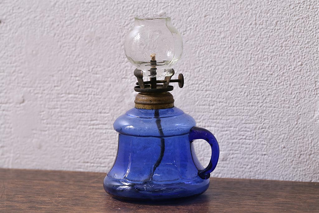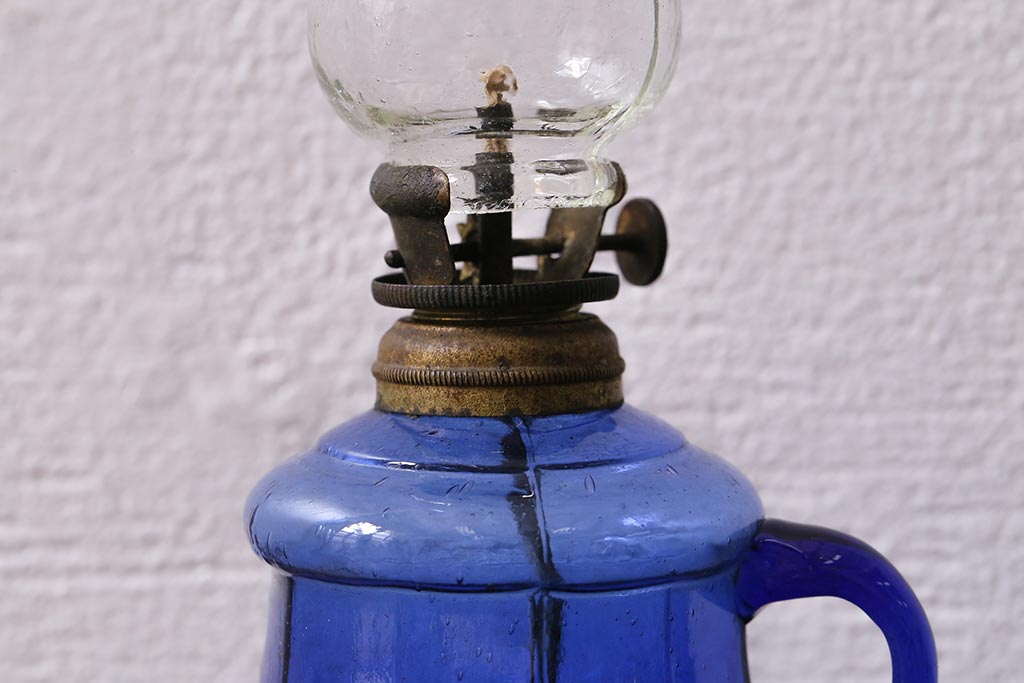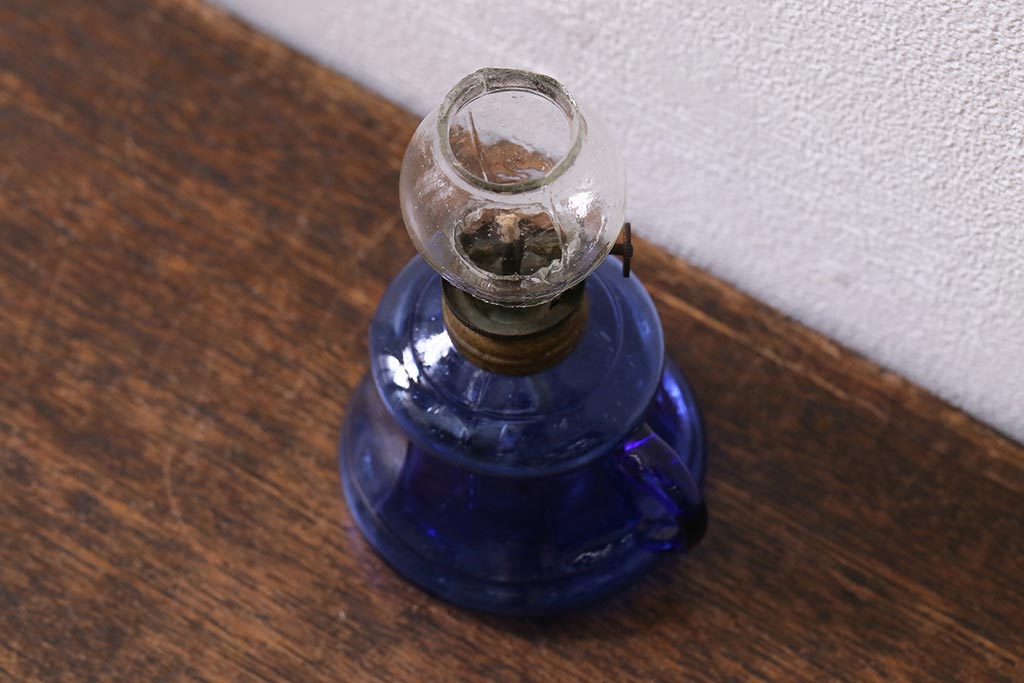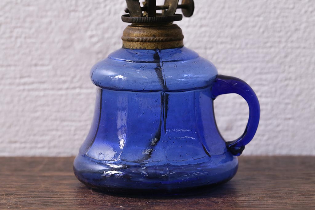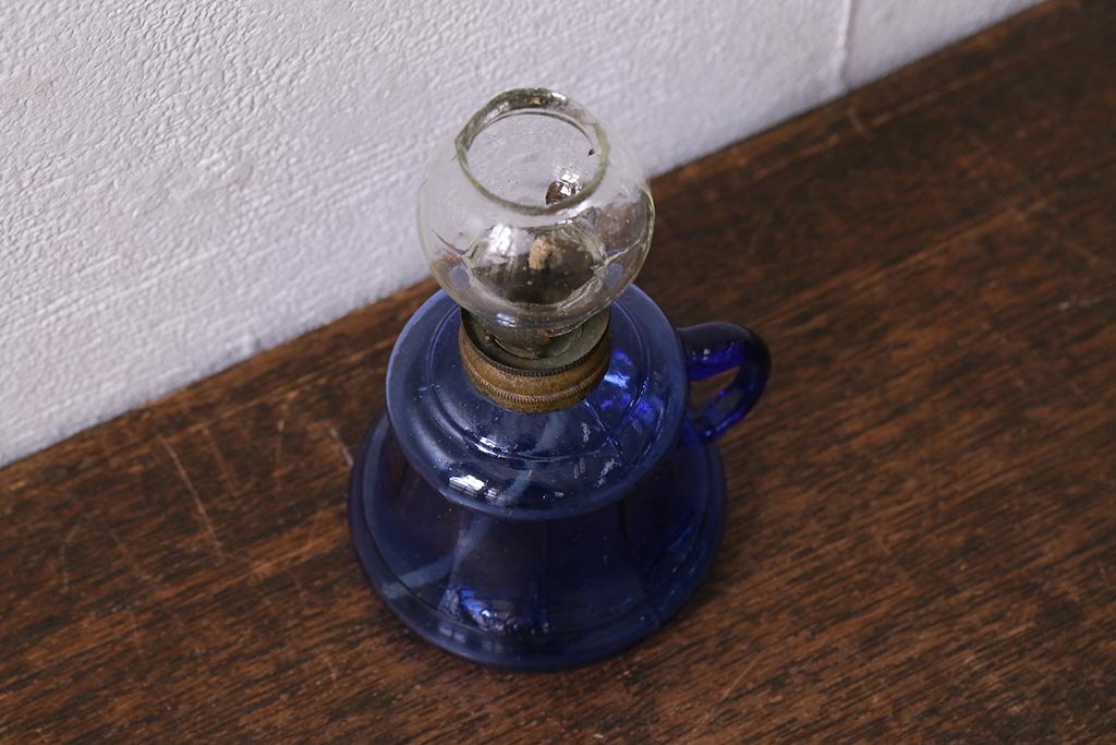 アンティーク雑貨 明治大正期 持ち手付き 青ガラスがおしゃれな豆ランプ(オイルランプ、和ガラス)(R-041471)です。