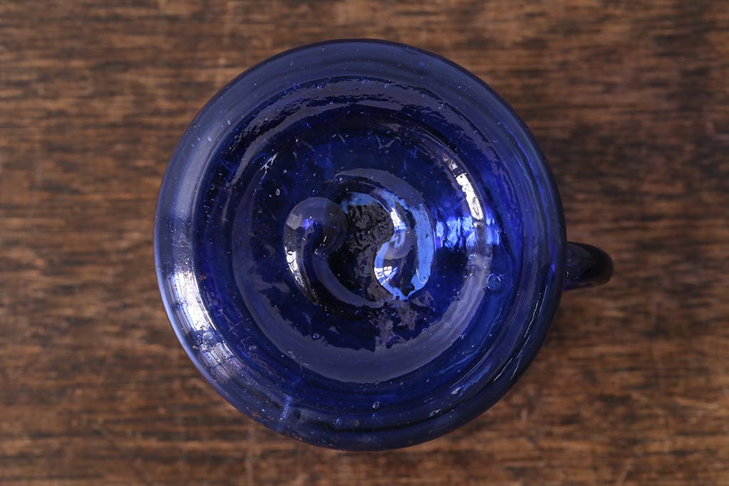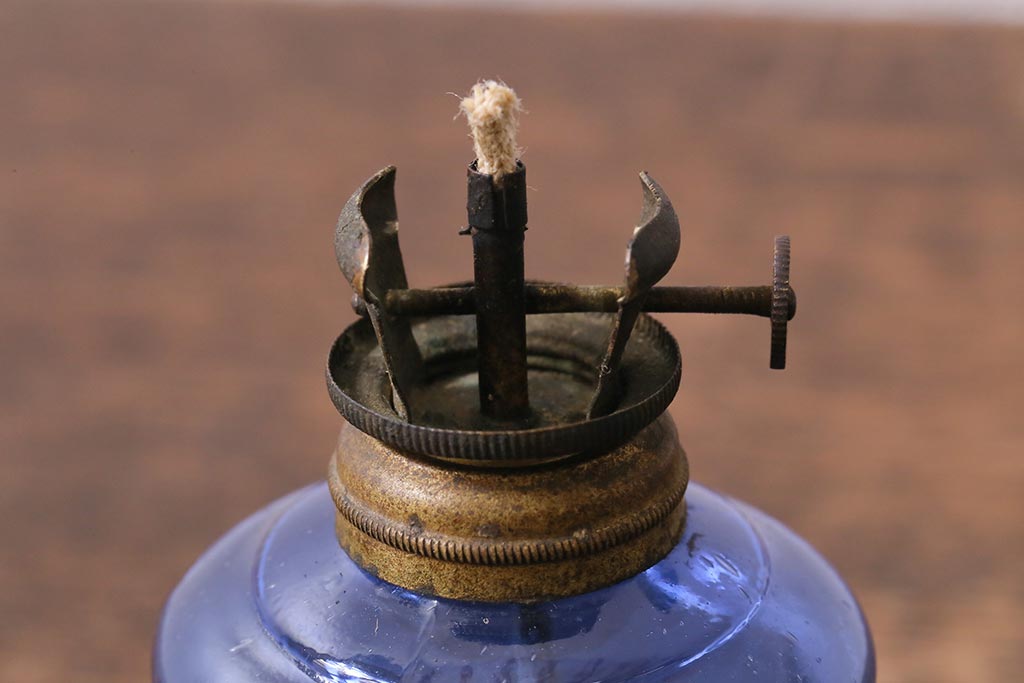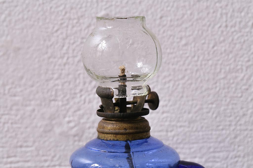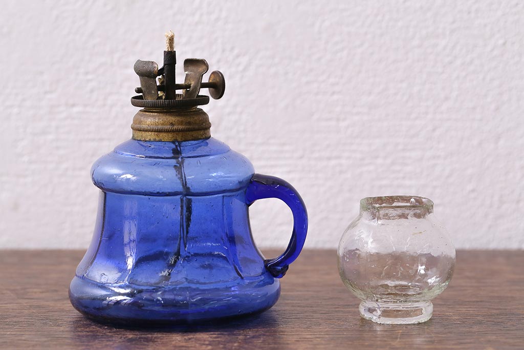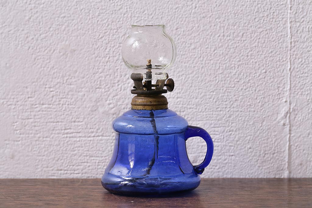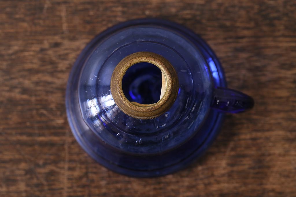 アンティーク雑貨 明治大正期 持ち手付き 青ガラスがおしゃれな豆ランプ(オイルランプ、和ガラス)(R-041471)です。