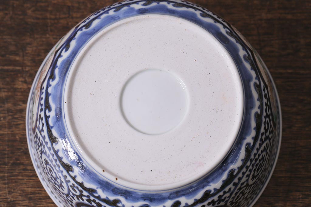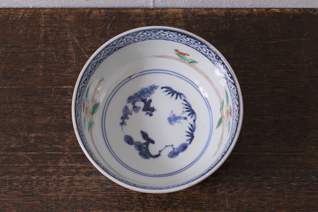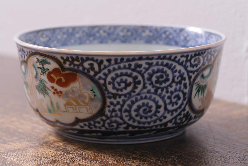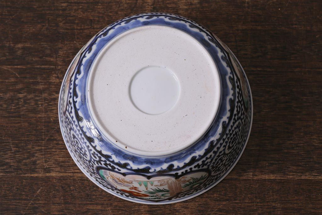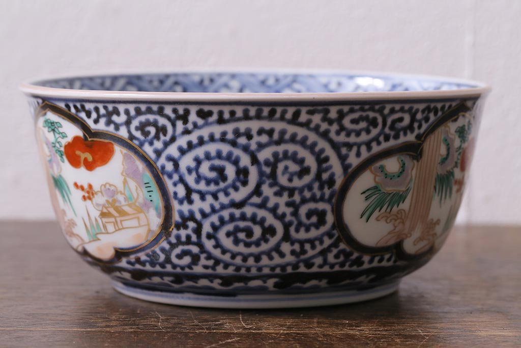 アンティーク雑貨 江戸期 古伊万里 蛸唐草窓絵深皿(色絵深鉢、和食器)(R-041332)