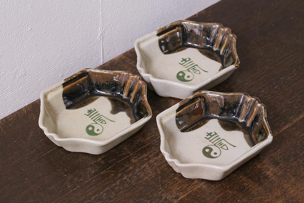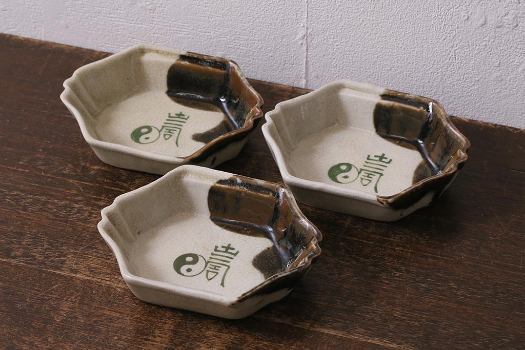 アンティーク雑貨 江戸明治期 時代物 古い美濃焼 大極図 変形皿3枚セット(和食器)(R-041304)