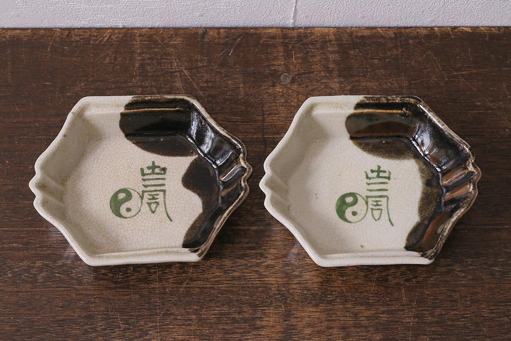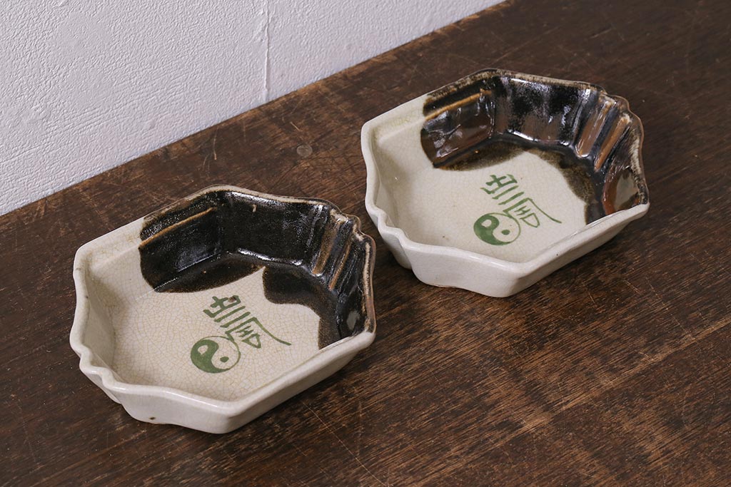 アンティーク雑貨 江戸明治期 時代物 古い美濃焼 大極図 変形皿2枚セット(和食器)(R-041305)