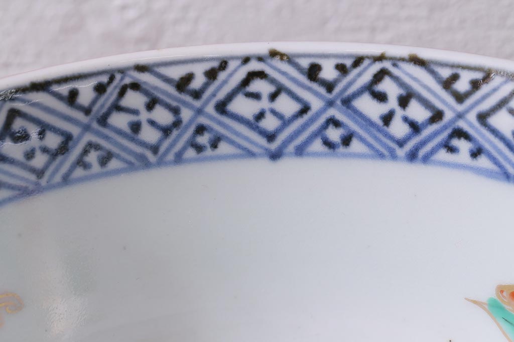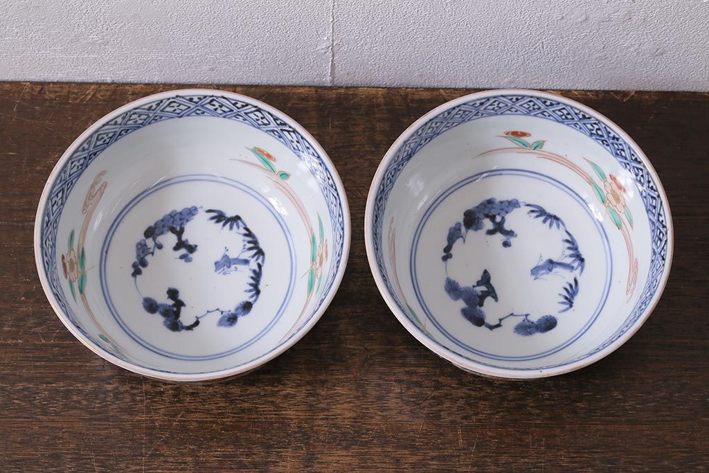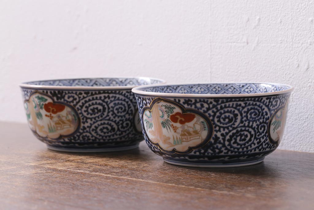アンティーク雑貨 江戸期 古伊万里 蛸唐草窓絵深皿2枚セット(色絵深鉢、和食器)(R-041309)