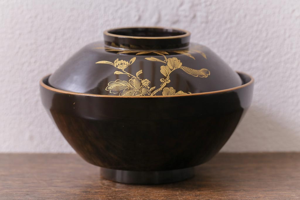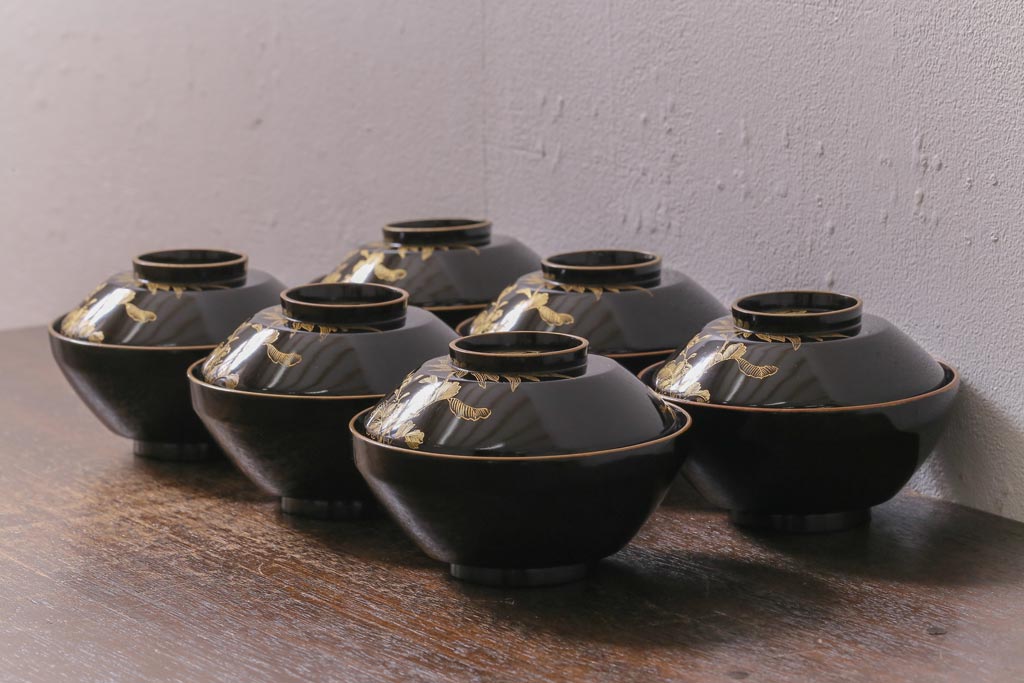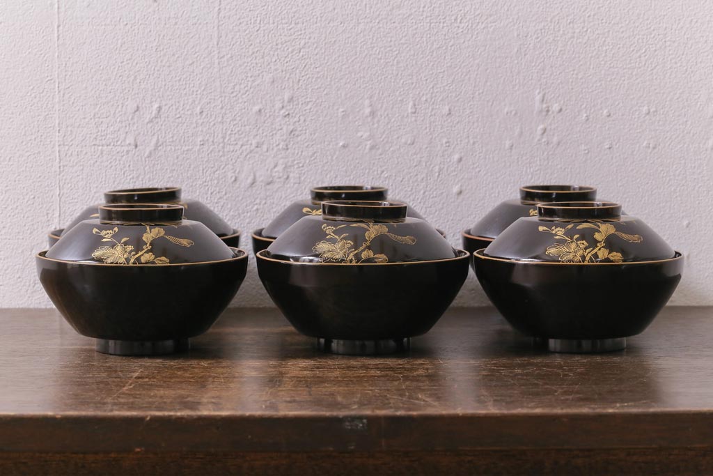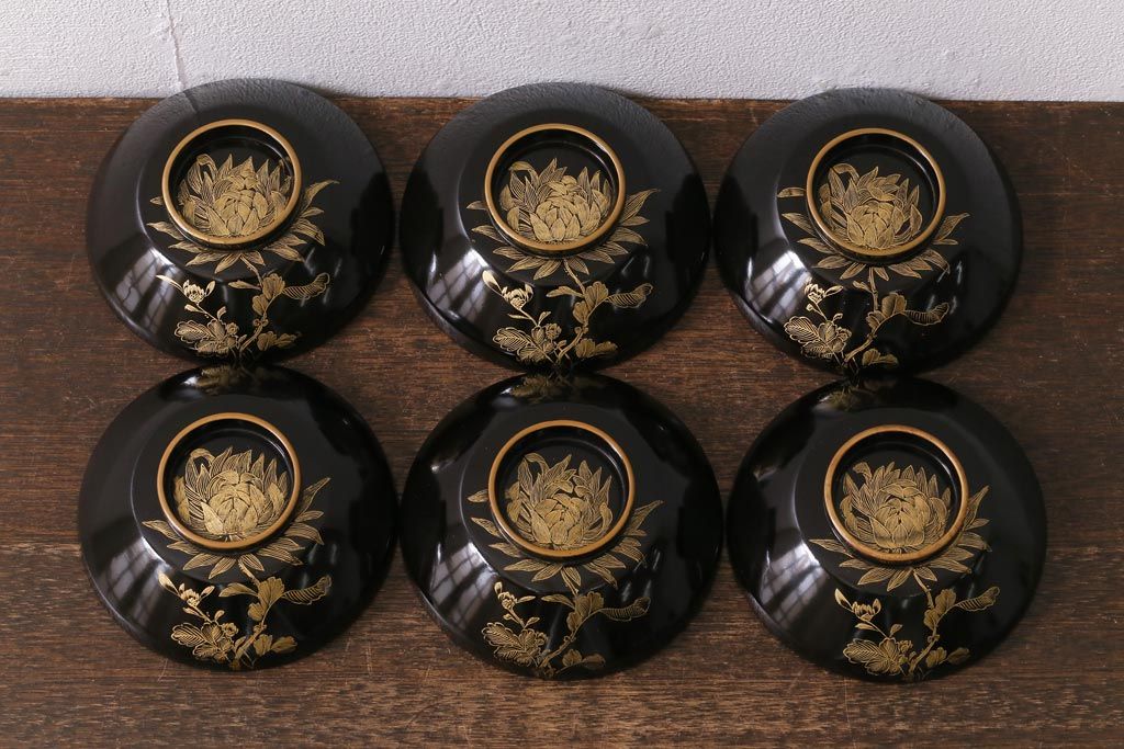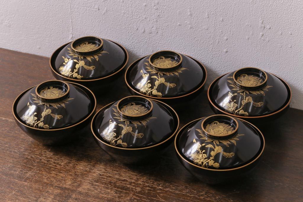 ラフジュ工房> 和食器・茶道具> お椀・茶碗 > アンティーク雑貨 大正昭和初期 花蝶図 沈金蒔絵木製椀6客セット(お椀、漆器)(R-041617)
