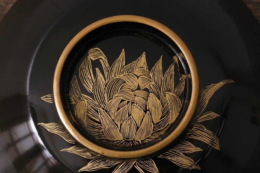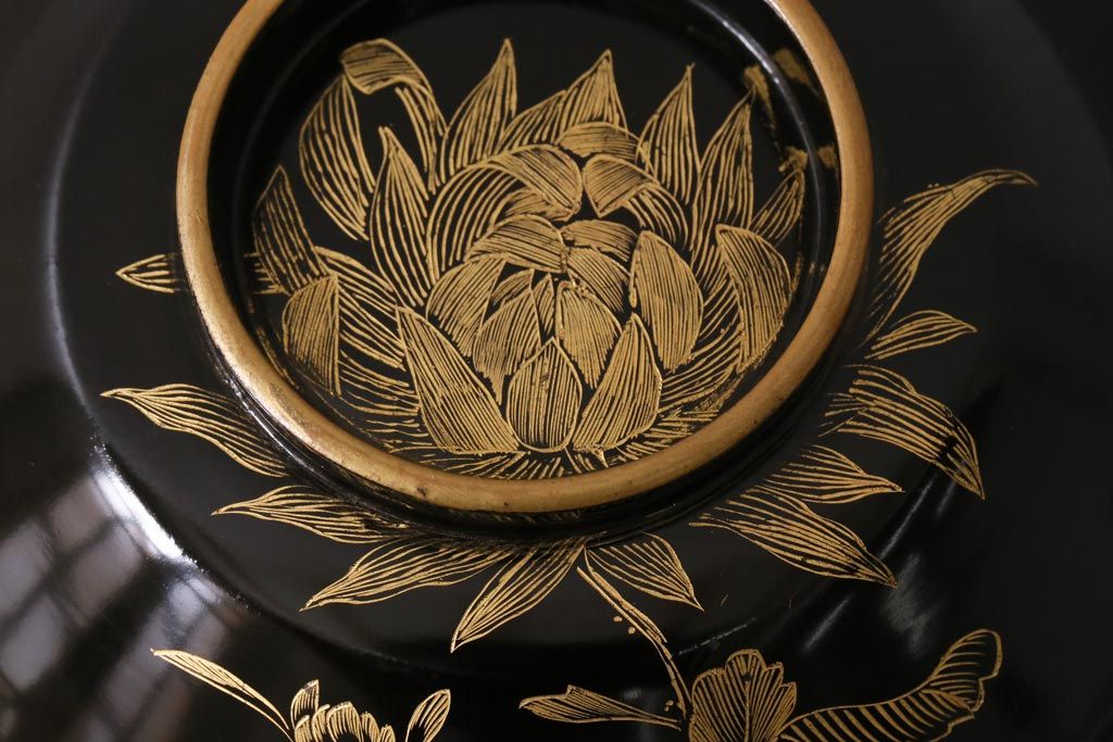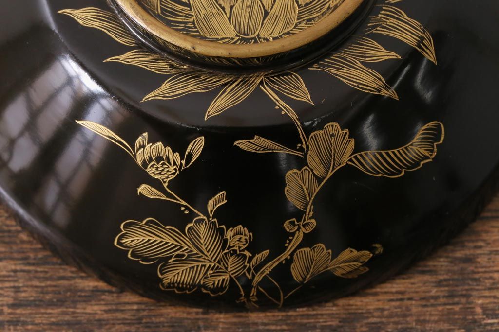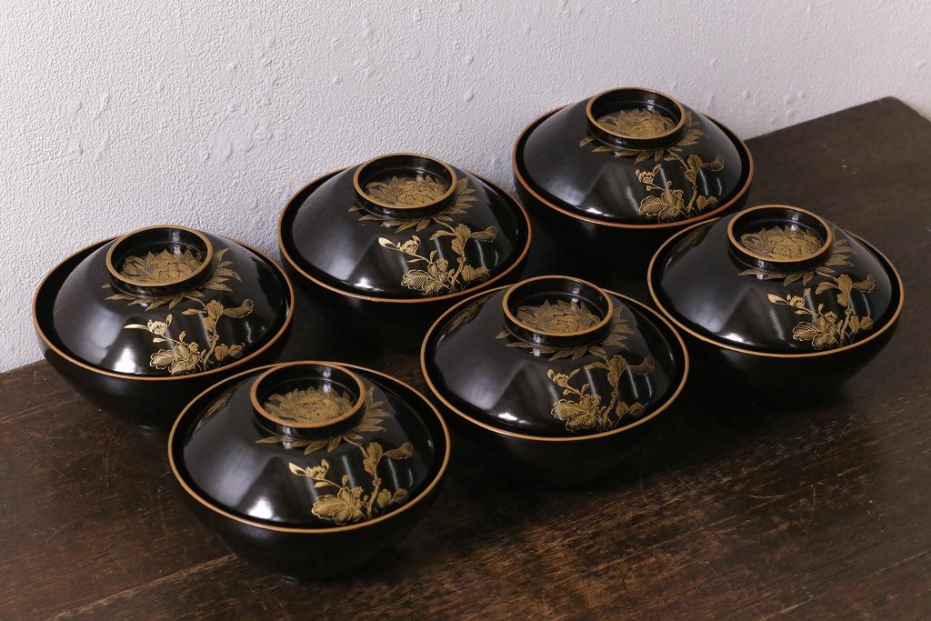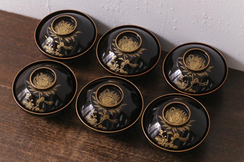 ラフジュ工房> 骨董・美術品> 骨董-漆器 > アンティーク雑貨 大正昭和初期 花蝶図 沈金蒔絵木製椀6客セット(お椀、漆器)(R-041617)