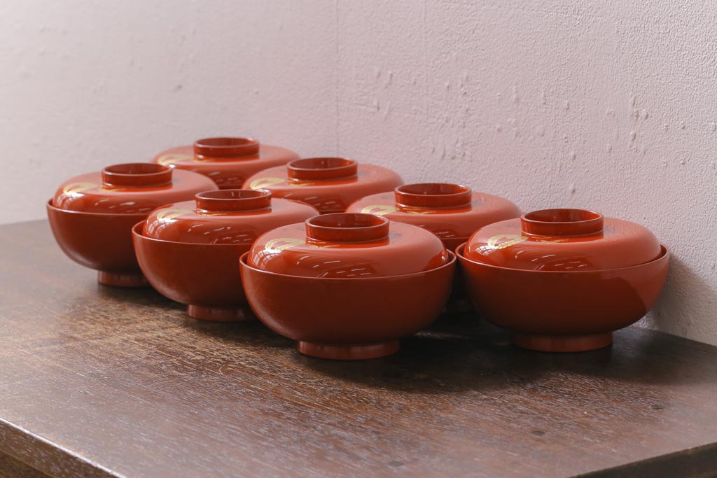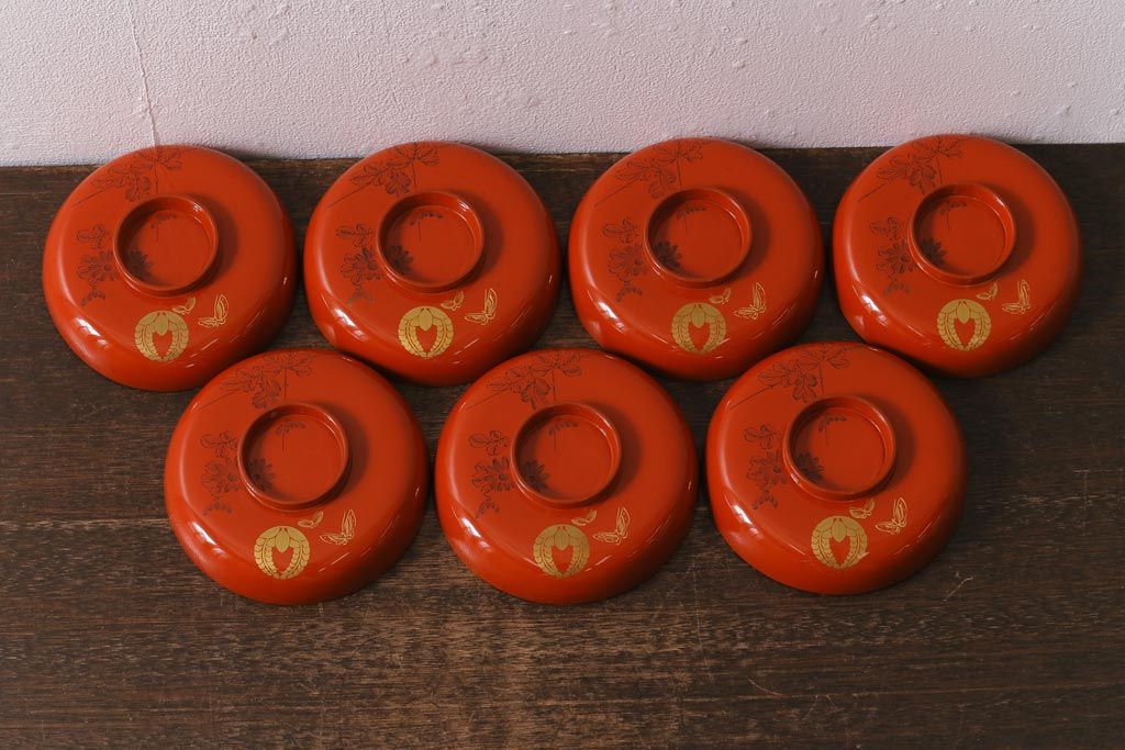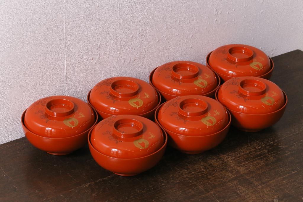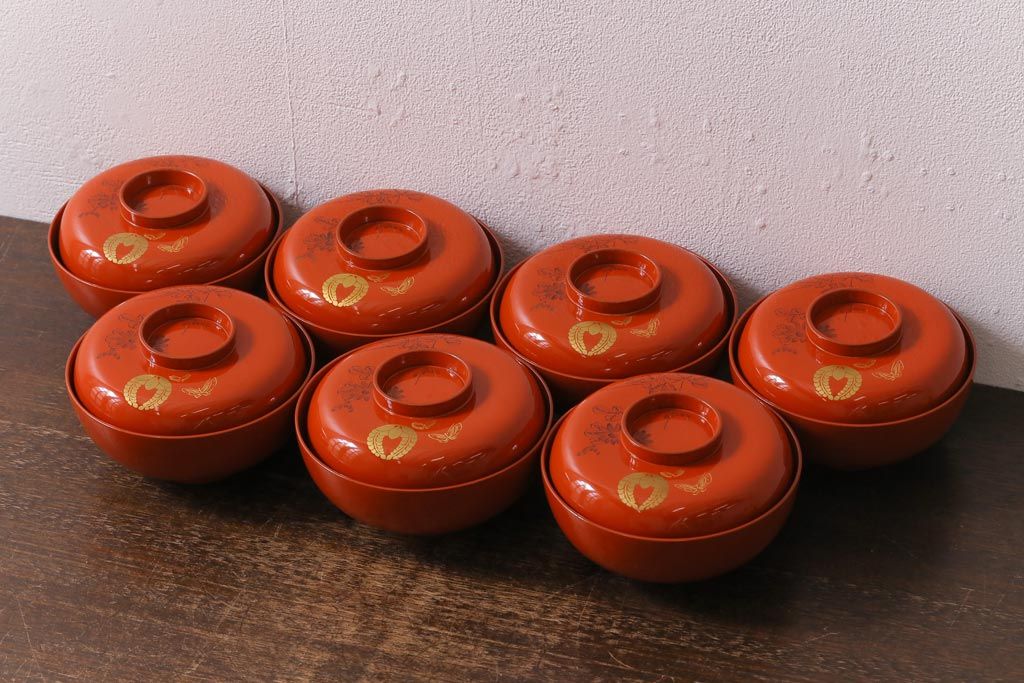 ラフジュ工房> 和食器・茶道具> お椀・茶碗 > アンティーク雑貨 大正昭和初期 花蝶図 上がり藤 竹に雀 朱塗り 沈金蒔絵木製椀7客セット(お椀、漆器)(R-041619)