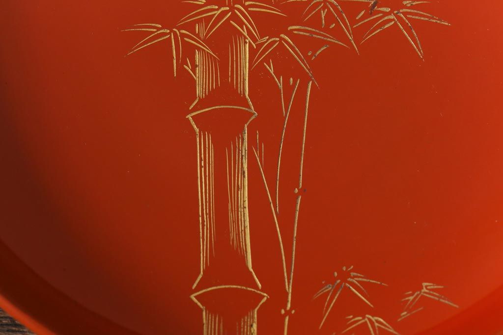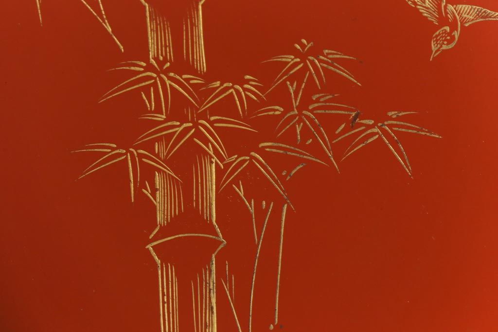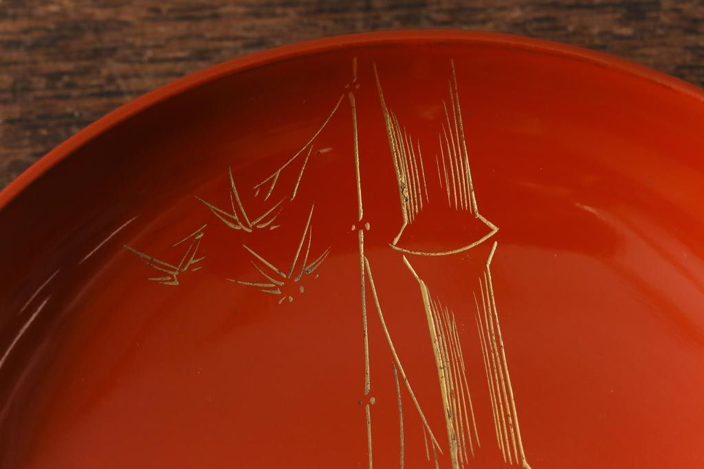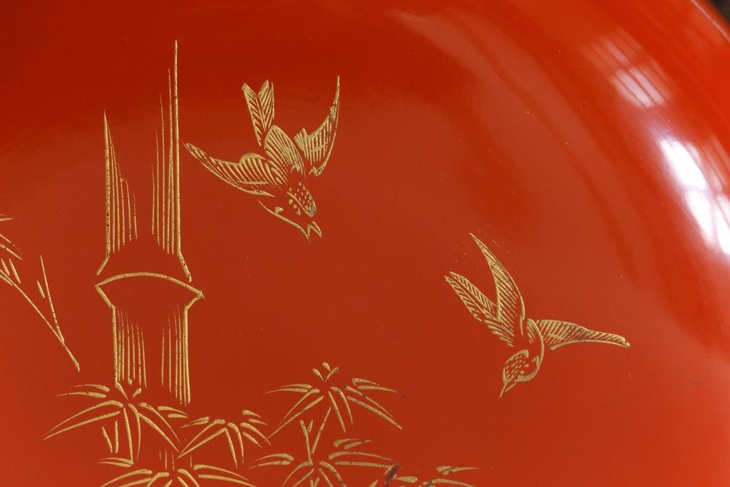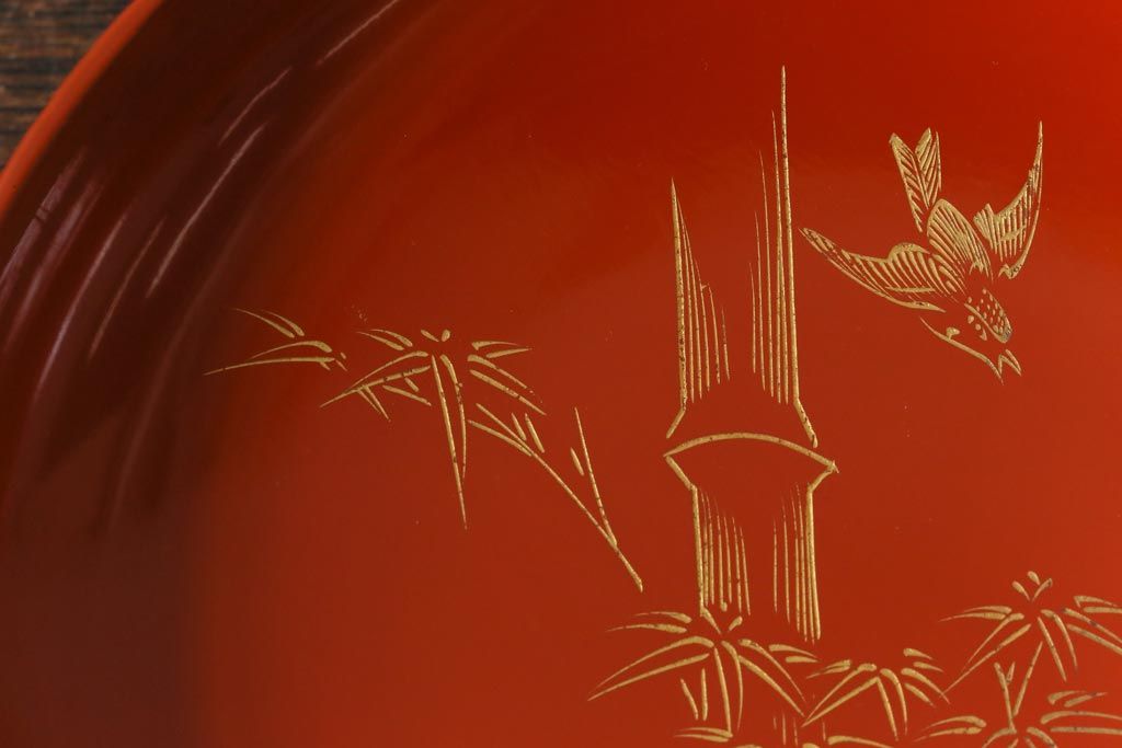 ラフジュ工房> 骨董・美術品> 骨董-漆器 > アンティーク雑貨 大正昭和初期 花蝶図 上がり藤 竹に雀 朱塗り 沈金蒔絵木製椀7客セット(お椀、漆器)(R-041619)