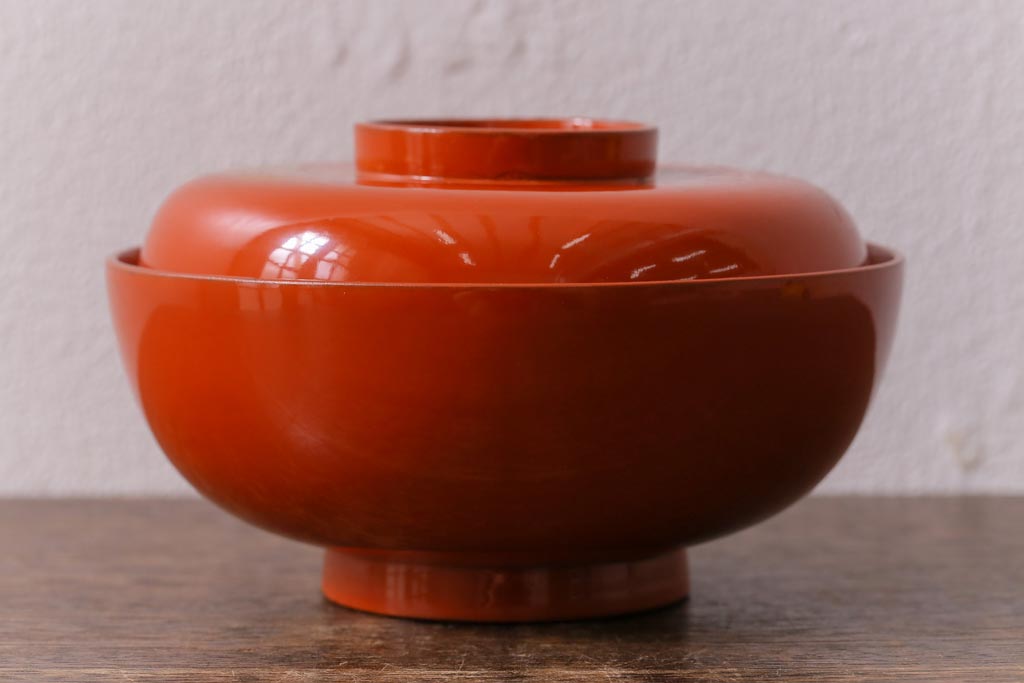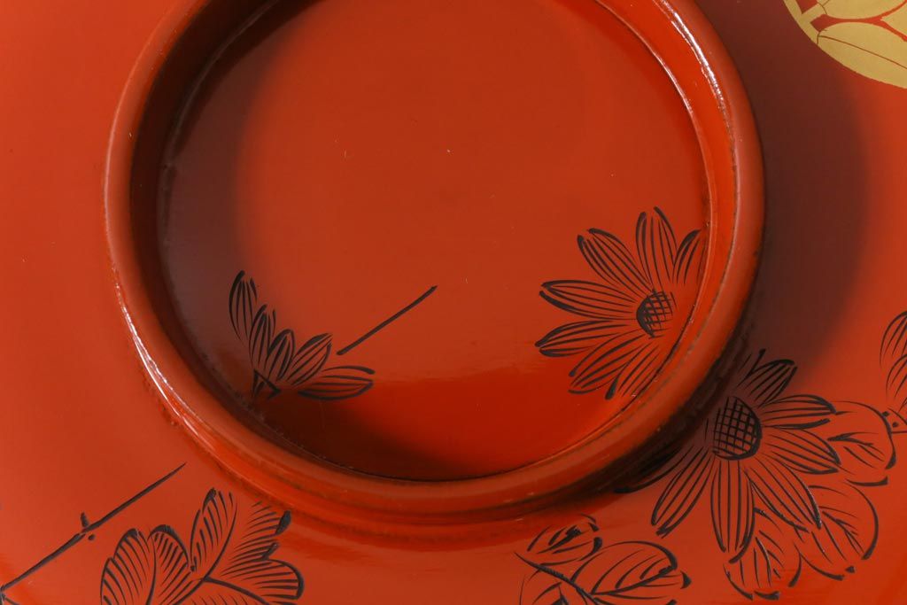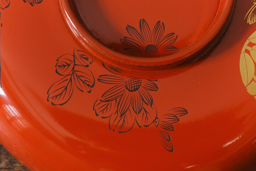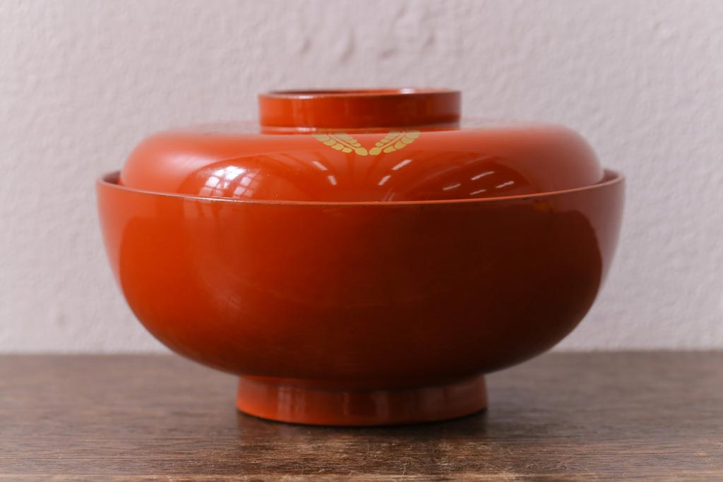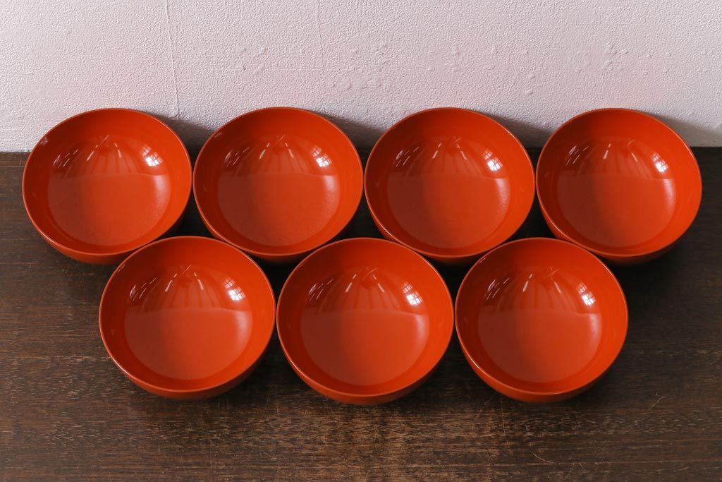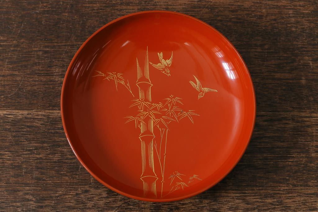 ラフジュ工房> 骨董・美術品> 骨董-漆器 > アンティーク雑貨 大正昭和初期 花蝶図 上がり藤 竹に雀 朱塗り 沈金蒔絵木製椀7客セット(お椀、漆器)(R-041619)